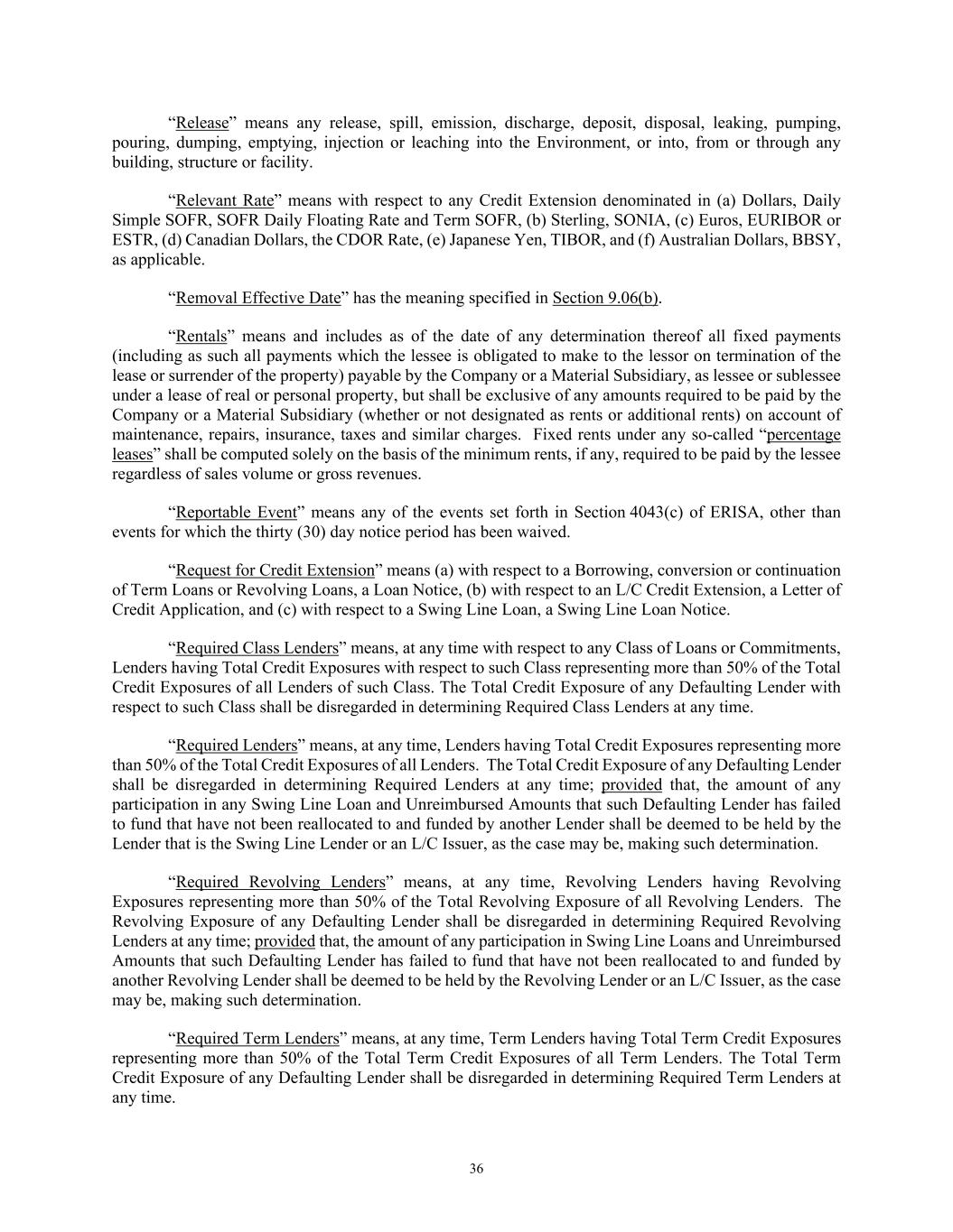 36 “Release” means any release, spill, emission, discharge, deposit, disposal, leaking, pumping, pouring, dumping, emptying, injection or leaching into the Environment, or into, from or through any building, structure or facility. “Relevant Rate” means with respect to any Credit Extension denominated in (a) Dollars, Daily Simple SOFR, SOFR Daily Floating Rate and Term SOFR, (b) Sterling, SONIA, (c) Euros, EURIBOR or ESTR, (d) Canadian Dollars, the CDOR Rate, (e) Japanese Yen, TIBOR, and (f) Australian Dollars, BBSY, as applicable. “Removal Effective Date” has the meaning specified in Section 9.06(b). “Rentals” means and includes as of the date of any determination thereof all fixed payments (including as such all payments which the lessee is obligated to make to the lessor on termination of the lease or surrender of the property) payable by the Company or a Material Subsidiary, as lessee or sublessee under a lease of real or personal property, but shall be exclusive of any amounts required to be paid by the Company or a Material Subsidiary (whether or not designated as rents or additional rents) on account of maintenance, repairs, insurance, taxes and similar charges. Fixed rents under any so-called “percentage leases” shall be computed solely on the basis of the minimum rents, if any, required to be paid by the lessee regardless of sales volume or gross revenues. “Reportable Event” means any of the events set forth in Section 4043(c) of ERISA, other than events for which the thirty (30) day notice period has been waived. “Request for Credit Extension” means (a) with respect to a Borrowing, conversion or continuation of Term Loans or Revolving Loans, a Loan Notice, (b) with respect to an L/C Credit Extension, a Letter of Credit Application, and (c) with respect to a Swing Line Loan, a Swing Line Loan Notice. “Required Class Lenders” means, at any time with respect to any Class of Loans or Commitments, Lenders having Total Credit Exposures with respect to such Class representing more than 50% of the Total Credit Exposures of all Lenders of such Class. The Total Credit Exposure of any Defaulting Lender with respect to such Class shall be disregarded in determining Required Class Lenders at any time. “Required Lenders” means, at any time, Lenders having Total Credit Exposures representing more than 50% of the Total Credit Exposures of all Lenders. The Total Credit Exposure of any Defaulting Lender shall be disregarded in determining Required Lenders at any time; provided that, the amount of any participation in any Swing Line Loan and Unreimbursed Amounts that such Defaulting Lender has failed to fund that have not been reallocated to and funded by another Lender shall be deemed to be held by the Lender that is the Swing Line Lender or an L/C Issuer, as the case may be, making such determination. “Required Revolving Lenders” means, at any time, Revolving Lenders having Revolving Exposures representing more than 50% of the Total Revolving Exposure of all Revolving Lenders. The Revolving Exposure of any Defaulting Lender shall be disregarded in determining Required Revolving Lenders at any time; provided that, the amount of any participation in Swing Line Loans and Unreimbursed Amounts that such Defaulting Lender has failed to fund that have not been reallocated to and funded by another Revolving Lender shall be deemed to be held by the Revolving Lender or an L/C Issuer, as the case may be, making such determination. “Required Term Lenders” means, at any time, Term Lenders having Total Term Credit Exposures representing more than 50% of the Total Term Credit Exposures of all Term Lenders. The Total Term Credit Exposure of any Defaulting Lender shall be disregarded in determining Required Term Lenders at any time.