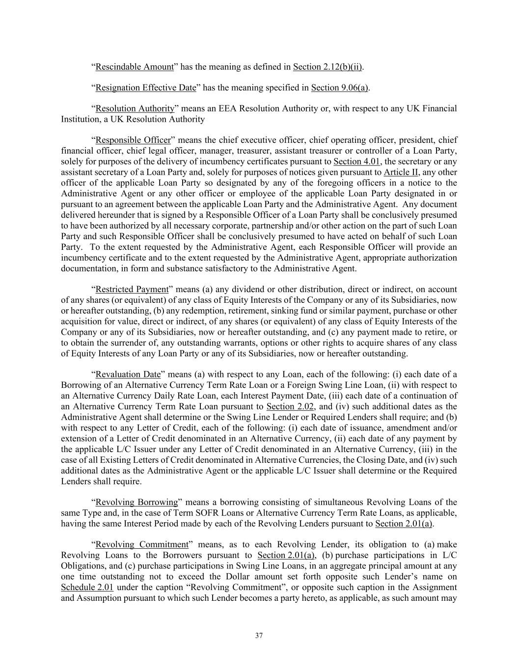 37 “Rescindable Amount” has the meaning as defined in Section 2.12(b)(ii). “Resignation Effective Date” has the meaning specified in Section 9.06(a). “Resolution Authority” means an EEA Resolution Authority or, with respect to any UK Financial Institution, a UK Resolution Authority “Responsible Officer” means the chief executive officer, chief operating officer, president, chief financial officer, chief legal officer, manager, treasurer, assistant treasurer or controller of a Loan Party, solely for purposes of the delivery of incumbency certificates pursuant to Section 4.01, the secretary or any assistant secretary of a Loan Party and, solely for purposes of notices given pursuant to Article II, any other officer of the applicable Loan Party so designated by any of the foregoing officers in a notice to the Administrative Agent or any other officer or employee of the applicable Loan Party designated in or pursuant to an agreement between the applicable Loan Party and the Administrative Agent. Any document delivered hereunder that is signed by a Responsible Officer of a Loan Party shall be conclusively presumed to have been authorized by all necessary corporate, partnership and/or other action on the part of such Loan Party and such Responsible Officer shall be conclusively presumed to have acted on behalf of such Loan Party. To the extent requested by the Administrative Agent, each Responsible Officer will provide an incumbency certificate and to the extent requested by the Administrative Agent, appropriate authorization documentation, in form and substance satisfactory to the Administrative Agent. “Restricted Payment” means (a) any dividend or other distribution, direct or indirect, on account of any shares (or equivalent) of any class of Equity Interests of the Company or any of its Subsidiaries, now or hereafter outstanding, (b) any redemption, retirement, sinking fund or similar payment, purchase or other acquisition for value, direct or indirect, of any shares (or equivalent) of any class of Equity Interests of the Company or any of its Subsidiaries, now or hereafter outstanding, and (c) any payment made to retire, or to obtain the surrender of, any outstanding warrants, options or other rights to acquire shares of any class of Equity Interests of any Loan Party or any of its Subsidiaries, now or hereafter outstanding. “Revaluation Date” means (a) with respect to any Loan, each of the following: (i) each date of a Borrowing of an Alternative Currency Term Rate Loan or a Foreign Swing Line Loan, (ii) with respect to an Alternative Currency Daily Rate Loan, each Interest Payment Date, (iii) each date of a continuation of an Alternative Currency Term Rate Loan pursuant to Section 2.02, and (iv) such additional dates as the Administrative Agent shall determine or the Swing Line Lender or Required Lenders shall require; and (b) with respect to any Letter of Credit, each of the following: (i) each date of issuance, amendment and/or extension of a Letter of Credit denominated in an Alternative Currency, (ii) each date of any payment by the applicable L/C Issuer under any Letter of Credit denominated in an Alternative Currency, (iii) in the case of all Existing Letters of Credit denominated in Alternative Currencies, the Closing Date, and (iv) such additional dates as the Administrative Agent or the applicable L/C Issuer shall determine or the Required Lenders shall require. “Revolving Borrowing” means a borrowing consisting of simultaneous Revolving Loans of the same Type and, in the case of Term SOFR Loans or Alternative Currency Term Rate Loans, as applicable, having the same Interest Period made by each of the Revolving Lenders pursuant to Section 2.01(a). “Revolving Commitment” means, as to each Revolving Lender, its obligation to (a) make Revolving Loans to the Borrowers pursuant to Section 2.01(a), (b) purchase participations in L/C Obligations, and (c) purchase participations in Swing Line Loans, in an aggregate principal amount at any one time outstanding not to exceed the Dollar amount set forth opposite such Lender’s name on Schedule 2.01 under the caption “Revolving Commitment”, or opposite such caption in the Assignment and Assumption pursuant to which such Lender becomes a party hereto, as applicable, as such amount may