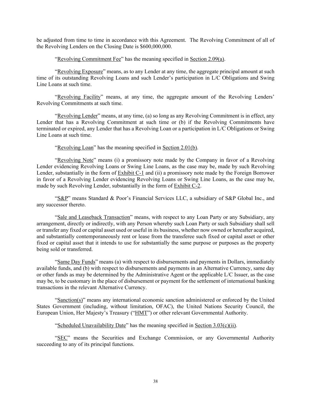38 be adjusted from time to time in accordance with this Agreement. The Revolving Commitment of all of the Revolving Lenders on the Closing Date is $600,000,000. “Revolving Commitment Fee” has the meaning specified in Section 2.09(a). “Revolving Exposure” means, as to any Lender at any time, the aggregate principal amount at such time of its outstanding Revolving Loans and such Lender’s participation in L/C Obligations and Swing Line Loans at such time. “Revolving Facility” means, at any time, the aggregate amount of the Revolving Lenders’ Revolving Commitments at such time. “Revolving Lender” means, at any time, (a) so long as any Revolving Commitment is in effect, any Lender that has a Revolving Commitment at such time or (b) if the Revolving Commitments have terminated or expired, any Lender that has a Revolving Loan or a participation in L/C Obligations or Swing Line Loans at such time. “Revolving Loan” has the meaning specified in Section 2.01(b). “Revolving Note” means (i) a promissory note made by the Company in favor of a Revolving Lender evidencing Revolving Loans or Swing Line Loans, as the case may be, made by such Revolving Lender, substantially in the form of Exhibit C-1 and (ii) a promissory note made by the Foreign Borrower in favor of a Revolving Lender evidencing Revolving Loans or Swing Line Loans, as the case may be, made by such Revolving Lender, substantially in the form of Exhibit C-2. “S&P” means Standard & Poor’s Financial Services LLC, a subsidiary of S&P Global Inc., and any successor thereto. “Sale and Leaseback Transaction” means, with respect to any Loan Party or any Subsidiary, any arrangement, directly or indirectly, with any Person whereby such Loan Party or such Subsidiary shall sell or transfer any fixed or capital asset used or useful in its business, whether now owned or hereafter acquired, and substantially contemporaneously rent or lease from the transferee such fixed or capital asset or other fixed or capital asset that it intends to use for substantially the same purpose or purposes as the property being sold or transferred. “Same Day Funds” means (a) with respect to disbursements and payments in Dollars, immediately available funds, and (b) with respect to disbursements and payments in an Alternative Currency, same day or other funds as may be determined by the Administrative Agent or the applicable L/C Issuer, as the case may be, to be customary in the place of disbursement or payment for the settlement of international banking transactions in the relevant Alternative Currency. “Sanction(s)” means any international economic sanction administered or enforced by the United States Government (including, without limitation, OFAC), the United Nations Security Council, the European Union, Her Majesty’s Treasury (“HMT”) or other relevant Governmental Authority. “Scheduled Unavailability Date” has the meaning specified in Section 3.03(c)(ii). “SEC” means the Securities and Exchange Commission, or any Governmental Authority succeeding to any of its principal functions.