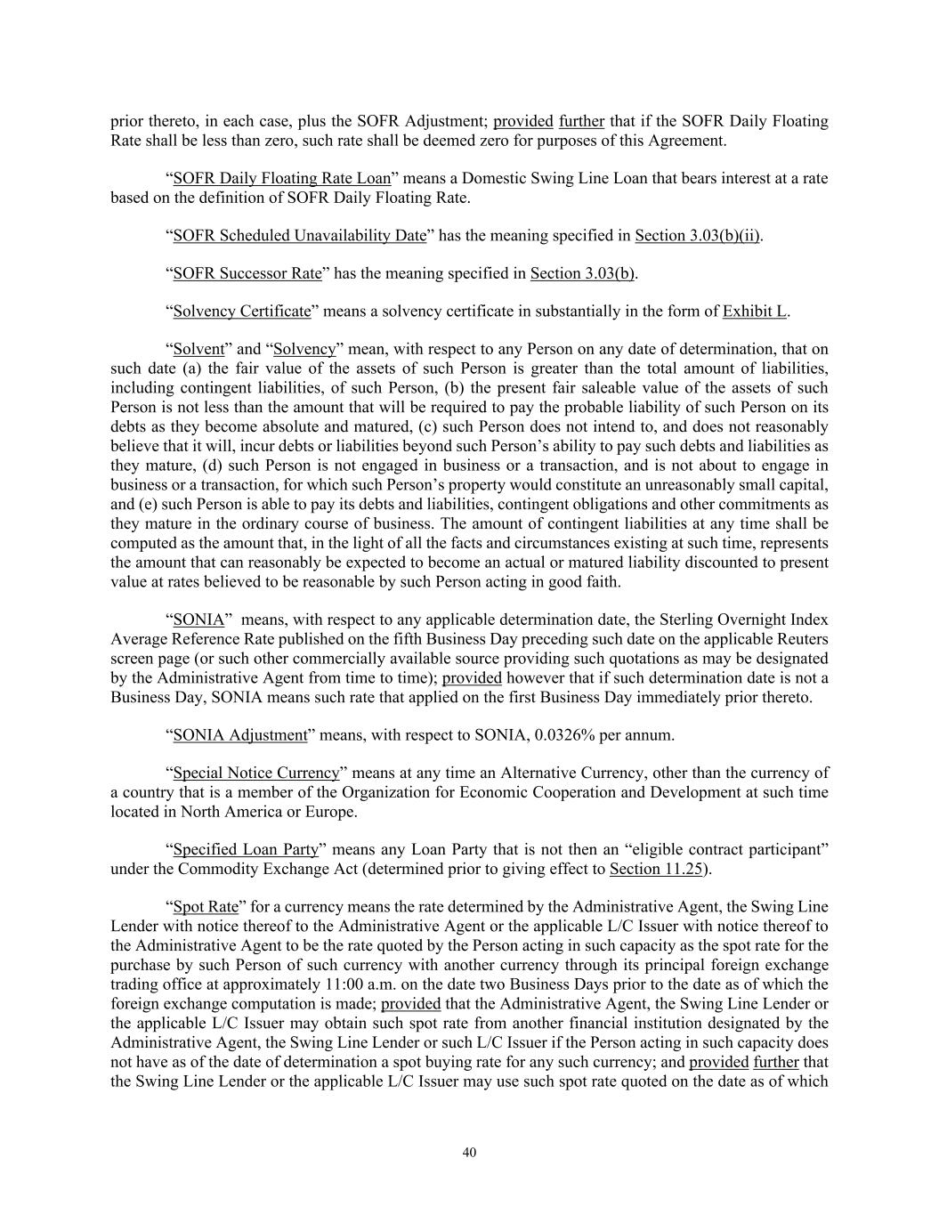 40 prior thereto, in each case, plus the SOFR Adjustment; provided further that if the SOFR Daily Floating Rate shall be less than zero, such rate shall be deemed zero for purposes of this Agreement. “SOFR Daily Floating Rate Loan” means a Domestic Swing Line Loan that bears interest at a rate based on the definition of SOFR Daily Floating Rate. “SOFR Scheduled Unavailability Date” has the meaning specified in Section 3.03(b)(ii). “SOFR Successor Rate” has the meaning specified in Section 3.03(b). “Solvency Certificate” means a solvency certificate in substantially in the form of Exhibit L. “Solvent” and “Solvency” mean, with respect to any Person on any date of determination, that on such date (a) the fair value of the assets of such Person is greater than the total amount of liabilities, including contingent liabilities, of such Person, (b) the present fair saleable value of the assets of such Person is not less than the amount that will be required to pay the probable liability of such Person on its debts as they become absolute and matured, (c) such Person does not intend to, and does not reasonably believe that it will, incur debts or liabilities beyond such Person’s ability to pay such debts and liabilities as they mature, (d) such Person is not engaged in business or a transaction, and is not about to engage in business or a transaction, for which such Person’s property would constitute an unreasonably small capital, and (e) such Person is able to pay its debts and liabilities, contingent obligations and other commitments as they mature in the ordinary course of business. The amount of contingent liabilities at any time shall be computed as the amount that, in the light of all the facts and circumstances existing at such time, represents the amount that can reasonably be expected to become an actual or matured liability discounted to present value at rates believed to be reasonable by such Person acting in good faith. “SONIA” means, with respect to any applicable determination date, the Sterling Overnight Index Average Reference Rate published on the fifth Business Day preceding such date on the applicable Reuters screen page (or such other commercially available source providing such quotations as may be designated by the Administrative Agent from time to time); provided however that if such determination date is not a Business Day, SONIA means such rate that applied on the first Business Day immediately prior thereto. “SONIA Adjustment” means, with respect to SONIA, 0.0326% per annum. “Special Notice Currency” means at any time an Alternative Currency, other than the currency of a country that is a member of the Organization for Economic Cooperation and Development at such time located in North America or Europe. “Specified Loan Party” means any Loan Party that is not then an “eligible contract participant” under the Commodity Exchange Act (determined prior to giving effect to Section 11.25). “Spot Rate” for a currency means the rate determined by the Administrative Agent, the Swing Line Lender with notice thereof to the Administrative Agent or the applicable L/C Issuer with notice thereof to the Administrative Agent to be the rate quoted by the Person acting in such capacity as the spot rate for the purchase by such Person of such currency with another currency through its principal foreign exchange trading office at approximately 11:00 a.m. on the date two Business Days prior to the date as of which the foreign exchange computation is made; provided that the Administrative Agent, the Swing Line Lender or the applicable L/C Issuer may obtain such spot rate from another financial institution designated by the Administrative Agent, the Swing Line Lender or such L/C Issuer if the Person acting in such capacity does not have as of the date of determination a spot buying rate for any such currency; and provided further that the Swing Line Lender or the applicable L/C Issuer may use such spot rate quoted on the date as of which