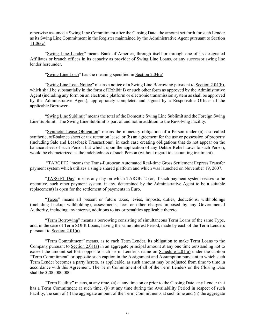 42 otherwise assumed a Swing Line Commitment after the Closing Date, the amount set forth for such Lender as its Swing Line Commitment in the Register maintained by the Administrative Agent pursuant to Section 11.06(c). “Swing Line Lender” means Bank of America, through itself or through one of its designated Affiliates or branch offices in its capacity as provider of Swing Line Loans, or any successor swing line lender hereunder. “Swing Line Loan” has the meaning specified in Section 2.04(a). “Swing Line Loan Notice” means a notice of a Swing Line Borrowing pursuant to Section 2.04(b), which shall be substantially in the form of Exhibit B or such other form as approved by the Administrative Agent (including any form on an electronic platform or electronic transmission system as shall be approved by the Administrative Agent), appropriately completed and signed by a Responsible Officer of the applicable Borrower. “Swing Line Sublimit” means the total of the Domestic Swing Line Sublimit and the Foreign Swing Line Sublimit. The Swing Line Sublimit is part of and not in addition to the Revolving Facility. “Synthetic Lease Obligation” means the monetary obligation of a Person under (a) a so-called synthetic, off-balance sheet or tax retention lease, or (b) an agreement for the use or possession of property (including Sale and Leaseback Transactions), in each case creating obligations that do not appear on the balance sheet of such Person but which, upon the application of any Debtor Relief Laws to such Person, would be characterized as the indebtedness of such Person (without regard to accounting treatment). “TARGET2” means the Trans-European Automated Real-time Gross Settlement Express Transfer payment system which utilizes a single shared platform and which was launched on November 19, 2007. “TARGET Day” means any day on which TARGET2 (or, if such payment system ceases to be operative, such other payment system, if any, determined by the Administrative Agent to be a suitable replacement) is open for the settlement of payments in Euro. “Taxes” means all present or future taxes, levies, imposts, duties, deductions, withholdings (including backup withholding), assessments, fees or other charges imposed by any Governmental Authority, including any interest, additions to tax or penalties applicable thereto. “Term Borrowing” means a borrowing consisting of simultaneous Term Loans of the same Type, and, in the case of Term SOFR Loans, having the same Interest Period, made by each of the Term Lenders pursuant to Section 2.01(a). “Term Commitment” means, as to each Term Lender, its obligation to make Term Loans to the Company pursuant to Section 2.01(a) in an aggregate principal amount at any one time outstanding not to exceed the amount set forth opposite such Term Lender’s name on Schedule 2.01(a) under the caption “Term Commitment” or opposite such caption in the Assignment and Assumption pursuant to which such Term Lender becomes a party hereto, as applicable, as such amount may be adjusted from time to time in accordance with this Agreement. The Term Commitment of all of the Term Lenders on the Closing Date shall be $200,000,000. “Term Facility” means, at any time, (a) at any time on or prior to the Closing Date, any Lender that has a Term Commitment at such time, (b) at any time during the Availability Period in respect of such Facility, the sum of (i) the aggregate amount of the Term Commitments at such time and (ii) the aggregate