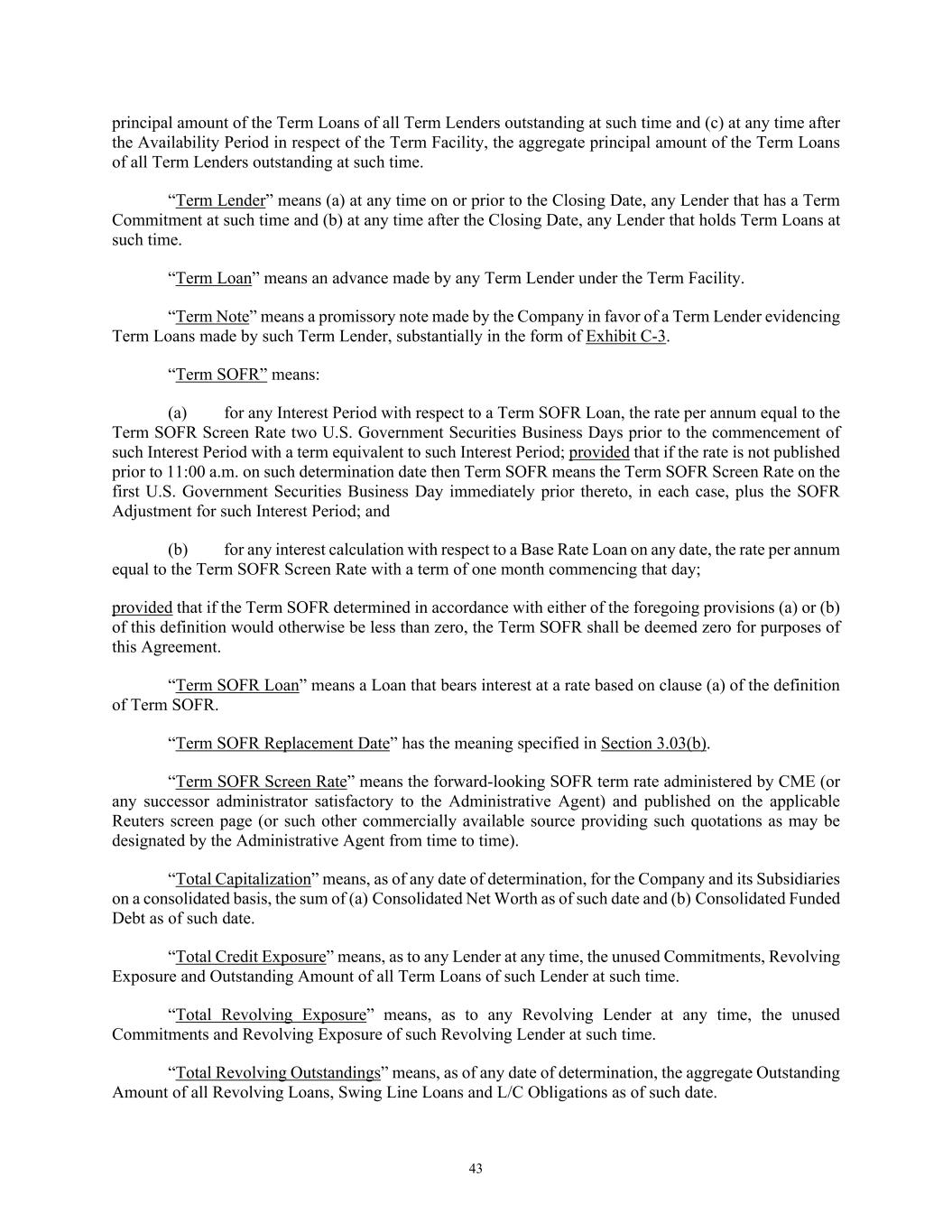 43 principal amount of the Term Loans of all Term Lenders outstanding at such time and (c) at any time after the Availability Period in respect of the Term Facility, the aggregate principal amount of the Term Loans of all Term Lenders outstanding at such time. “Term Lender” means (a) at any time on or prior to the Closing Date, any Lender that has a Term Commitment at such time and (b) at any time after the Closing Date, any Lender that holds Term Loans at such time. “Term Loan” means an advance made by any Term Lender under the Term Facility. “Term Note” means a promissory note made by the Company in favor of a Term Lender evidencing Term Loans made by such Term Lender, substantially in the form of Exhibit C-3. “Term SOFR” means: (a) for any Interest Period with respect to a Term SOFR Loan, the rate per annum equal to the Term SOFR Screen Rate two U.S. Government Securities Business Days prior to the commencement of such Interest Period with a term equivalent to such Interest Period; provided that if the rate is not published prior to 11:00 a.m. on such determination date then Term SOFR means the Term SOFR Screen Rate on the first U.S. Government Securities Business Day immediately prior thereto, in each case, plus the SOFR Adjustment for such Interest Period; and (b) for any interest calculation with respect to a Base Rate Loan on any date, the rate per annum equal to the Term SOFR Screen Rate with a term of one month commencing that day; provided that if the Term SOFR determined in accordance with either of the foregoing provisions (a) or (b) of this definition would otherwise be less than zero, the Term SOFR shall be deemed zero for purposes of this Agreement. “Term SOFR Loan” means a Loan that bears interest at a rate based on clause (a) of the definition of Term SOFR. “Term SOFR Replacement Date” has the meaning specified in Section 3.03(b). “Term SOFR Screen Rate” means the forward-looking SOFR term rate administered by CME (or any successor administrator satisfactory to the Administrative Agent) and published on the applicable Reuters screen page (or such other commercially available source providing such quotations as may be designated by the Administrative Agent from time to time). “Total Capitalization” means, as of any date of determination, for the Company and its Subsidiaries on a consolidated basis, the sum of (a) Consolidated Net Worth as of such date and (b) Consolidated Funded Debt as of such date. “Total Credit Exposure” means, as to any Lender at any time, the unused Commitments, Revolving Exposure and Outstanding Amount of all Term Loans of such Lender at such time. “Total Revolving Exposure” means, as to any Revolving Lender at any time, the unused Commitments and Revolving Exposure of such Revolving Lender at such time. “Total Revolving Outstandings” means, as of any date of determination, the aggregate Outstanding Amount of all Revolving Loans, Swing Line Loans and L/C Obligations as of such date.