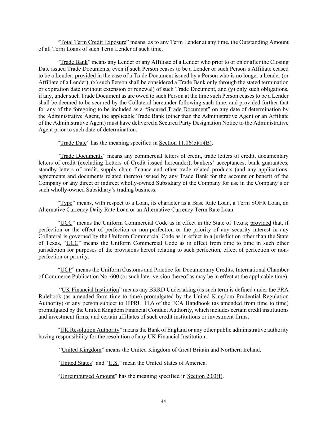 44 “Total Term Credit Exposure” means, as to any Term Lender at any time, the Outstanding Amount of all Term Loans of such Term Lender at such time. “Trade Bank” means any Lender or any Affiliate of a Lender who prior to or on or after the Closing Date issued Trade Documents; even if such Person ceases to be a Lender or such Person’s Affiliate ceased to be a Lender; provided in the case of a Trade Document issued by a Person who is no longer a Lender (or Affiliate of a Lender), (x) such Person shall be considered a Trade Bank only through the stated termination or expiration date (without extension or renewal) of such Trade Document, and (y) only such obligations, if any, under such Trade Document as are owed to such Person at the time such Person ceases to be a Lender shall be deemed to be secured by the Collateral hereunder following such time, and provided further that for any of the foregoing to be included as a “Secured Trade Document” on any date of determination by the Administrative Agent, the applicable Trade Bank (other than the Administrative Agent or an Affiliate of the Administrative Agent) must have delivered a Secured Party Designation Notice to the Administrative Agent prior to such date of determination. “Trade Date” has the meaning specified in Section 11.06(b)(i)(B). “Trade Documents” means any commercial letters of credit, trade letters of credit, documentary letters of credit (excluding Letters of Credit issued hereunder), bankers’ acceptances, bank guarantees, standby letters of credit, supply chain finance and other trade related products (and any applications, agreements and documents related thereto) issued by any Trade Bank for the account or benefit of the Company or any direct or indirect wholly-owned Subsidiary of the Company for use in the Company’s or such wholly-owned Subsidiary’s trading business. “Type” means, with respect to a Loan, its character as a Base Rate Loan, a Term SOFR Loan, an Alternative Currency Daily Rate Loan or an Alternative Currency Term Rate Loan. “UCC” means the Uniform Commercial Code as in effect in the State of Texas; provided that, if perfection or the effect of perfection or non-perfection or the priority of any security interest in any Collateral is governed by the Uniform Commercial Code as in effect in a jurisdiction other than the State of Texas, “UCC” means the Uniform Commercial Code as in effect from time to time in such other jurisdiction for purposes of the provisions hereof relating to such perfection, effect of perfection or non- perfection or priority. “UCP” means the Uniform Customs and Practice for Documentary Credits, International Chamber of Commerce Publication No. 600 (or such later version thereof as may be in effect at the applicable time). “UK Financial Institution” means any BRRD Undertaking (as such term is defined under the PRA Rulebook (as amended form time to time) promulgated by the United Kingdom Prudential Regulation Authority) or any person subject to IFPRU 11.6 of the FCA Handbook (as amended from time to time) promulgated by the United Kingdom Financial Conduct Authority, which includes certain credit institutions and investment firms, and certain affiliates of such credit institutions or investment firms. “UK Resolution Authority” means the Bank of England or any other public administrative authority having responsibility for the resolution of any UK Financial Institution. “United Kingdom” means the United Kingdom of Great Britain and Northern Ireland. “United States” and “U.S.” mean the United States of America. “Unreimbursed Amount” has the meaning specified in Section 2.03(f).