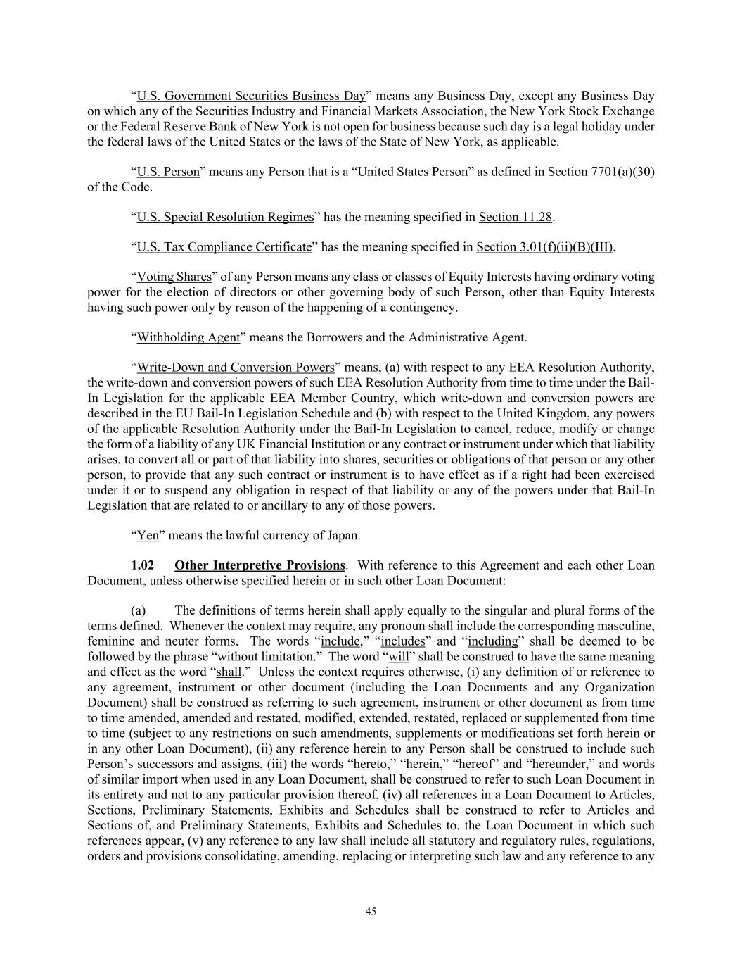 45 “U.S. Government Securities Business Day” means any Business Day, except any Business Day on which any of the Securities Industry and Financial Markets Association, the New York Stock Exchange or the Federal Reserve Bank of New York is not open for business because such day is a legal holiday under the federal laws of the United States or the laws of the State of New York, as applicable. “U.S. Person” means any Person that is a “United States Person” as defined in Section 7701(a)(30) of the Code. “U.S. Special Resolution Regimes” has the meaning specified in Section 11.28. “U.S. Tax Compliance Certificate” has the meaning specified in Section 3.01(f)(ii)(B)(III). “Voting Shares” of any Person means any class or classes of Equity Interests having ordinary voting power for the election of directors or other governing body of such Person, other than Equity Interests having such power only by reason of the happening of a contingency. “Withholding Agent” means the Borrowers and the Administrative Agent. “Write-Down and Conversion Powers” means, (a) with respect to any EEA Resolution Authority, the write-down and conversion powers of such EEA Resolution Authority from time to time under the Bail- In Legislation for the applicable EEA Member Country, which write-down and conversion powers are described in the EU Bail-In Legislation Schedule and (b) with respect to the United Kingdom, any powers of the applicable Resolution Authority under the Bail-In Legislation to cancel, reduce, modify or change the form of a liability of any UK Financial Institution or any contract or instrument under which that liability arises, to convert all or part of that liability into shares, securities or obligations of that person or any other person, to provide that any such contract or instrument is to have effect as if a right had been exercised under it or to suspend any obligation in respect of that liability or any of the powers under that Bail-In Legislation that are related to or ancillary to any of those powers. “Yen” means the lawful currency of Japan. 1.02 Other Interpretive Provisions. With reference to this Agreement and each other Loan Document, unless otherwise specified herein or in such other Loan Document: (a) The definitions of terms herein shall apply equally to the singular and plural forms of the terms defined. Whenever the context may require, any pronoun shall include the corresponding masculine, feminine and neuter forms. The words “include,” “includes” and “including” shall be deemed to be followed by the phrase “without limitation.” The word “will” shall be construed to have the same meaning and effect as the word “shall.” Unless the context requires otherwise, (i) any definition of or reference to any agreement, instrument or other document (including the Loan Documents and any Organization Document) shall be construed as referring to such agreement, instrument or other document as from time to time amended, amended and restated, modified, extended, restated, replaced or supplemented from time to time (subject to any restrictions on such amendments, supplements or modifications set forth herein or in any other Loan Document), (ii) any reference herein to any Person shall be construed to include such Person’s successors and assigns, (iii) the words “hereto,” “herein,” “hereof” and “hereunder,” and words of similar import when used in any Loan Document, shall be construed to refer to such Loan Document in its entirety and not to any particular provision thereof, (iv) all references in a Loan Document to Articles, Sections, Preliminary Statements, Exhibits and Schedules shall be construed to refer to Articles and Sections of, and Preliminary Statements, Exhibits and Schedules to, the Loan Document in which such references appear, (v) any reference to any law shall include all statutory and regulatory rules, regulations, orders and provisions consolidating, amending, replacing or interpreting such law and any reference to any