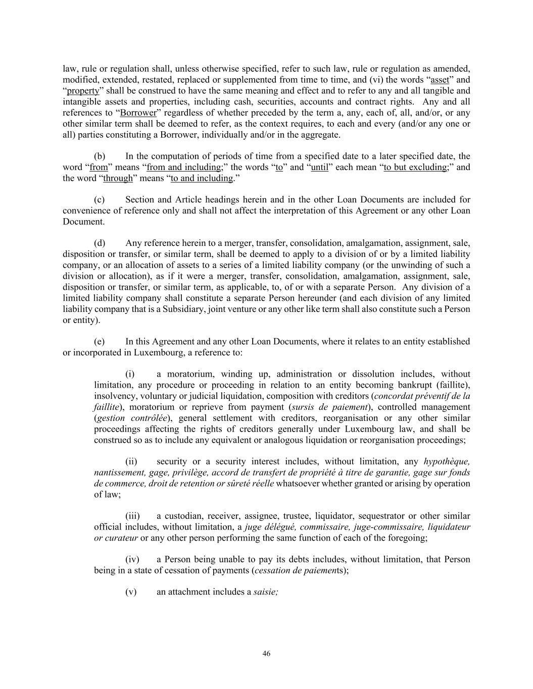46 law, rule or regulation shall, unless otherwise specified, refer to such law, rule or regulation as amended, modified, extended, restated, replaced or supplemented from time to time, and (vi) the words “asset” and “property” shall be construed to have the same meaning and effect and to refer to any and all tangible and intangible assets and properties, including cash, securities, accounts and contract rights. Any and all references to “Borrower” regardless of whether preceded by the term a, any, each of, all, and/or, or any other similar term shall be deemed to refer, as the context requires, to each and every (and/or any one or all) parties constituting a Borrower, individually and/or in the aggregate. (b) In the computation of periods of time from a specified date to a later specified date, the word “from” means “from and including;” the words “to” and “until” each mean “to but excluding;” and the word “through” means “to and including.” (c) Section and Article headings herein and in the other Loan Documents are included for convenience of reference only and shall not affect the interpretation of this Agreement or any other Loan Document. (d) Any reference herein to a merger, transfer, consolidation, amalgamation, assignment, sale, disposition or transfer, or similar term, shall be deemed to apply to a division of or by a limited liability company, or an allocation of assets to a series of a limited liability company (or the unwinding of such a division or allocation), as if it were a merger, transfer, consolidation, amalgamation, assignment, sale, disposition or transfer, or similar term, as applicable, to, of or with a separate Person. Any division of a limited liability company shall constitute a separate Person hereunder (and each division of any limited liability company that is a Subsidiary, joint venture or any other like term shall also constitute such a Person or entity). (e) In this Agreement and any other Loan Documents, where it relates to an entity established or incorporated in Luxembourg, a reference to: (i) a moratorium, winding up, administration or dissolution includes, without limitation, any procedure or proceeding in relation to an entity becoming bankrupt (faillite), insolvency, voluntary or judicial liquidation, composition with creditors (concordat préventif de la faillite), moratorium or reprieve from payment (sursis de paiement), controlled management (gestion contrôlée), general settlement with creditors, reorganisation or any other similar proceedings affecting the rights of creditors generally under Luxembourg law, and shall be construed so as to include any equivalent or analogous liquidation or reorganisation proceedings; (ii) security or a security interest includes, without limitation, any hypothèque, nantissement, gage, privilège, accord de transfert de propriété à titre de garantie, gage sur fonds de commerce, droit de retention or sûreté réelle whatsoever whether granted or arising by operation of law; (iii) a custodian, receiver, assignee, trustee, liquidator, sequestrator or other similar official includes, without limitation, a juge délégué, commissaire, juge-commissaire, liquidateur or curateur or any other person performing the same function of each of the foregoing; (iv) a Person being unable to pay its debts includes, without limitation, that Person being in a state of cessation of payments (cessation de paiements); (v) an attachment includes a saisie;