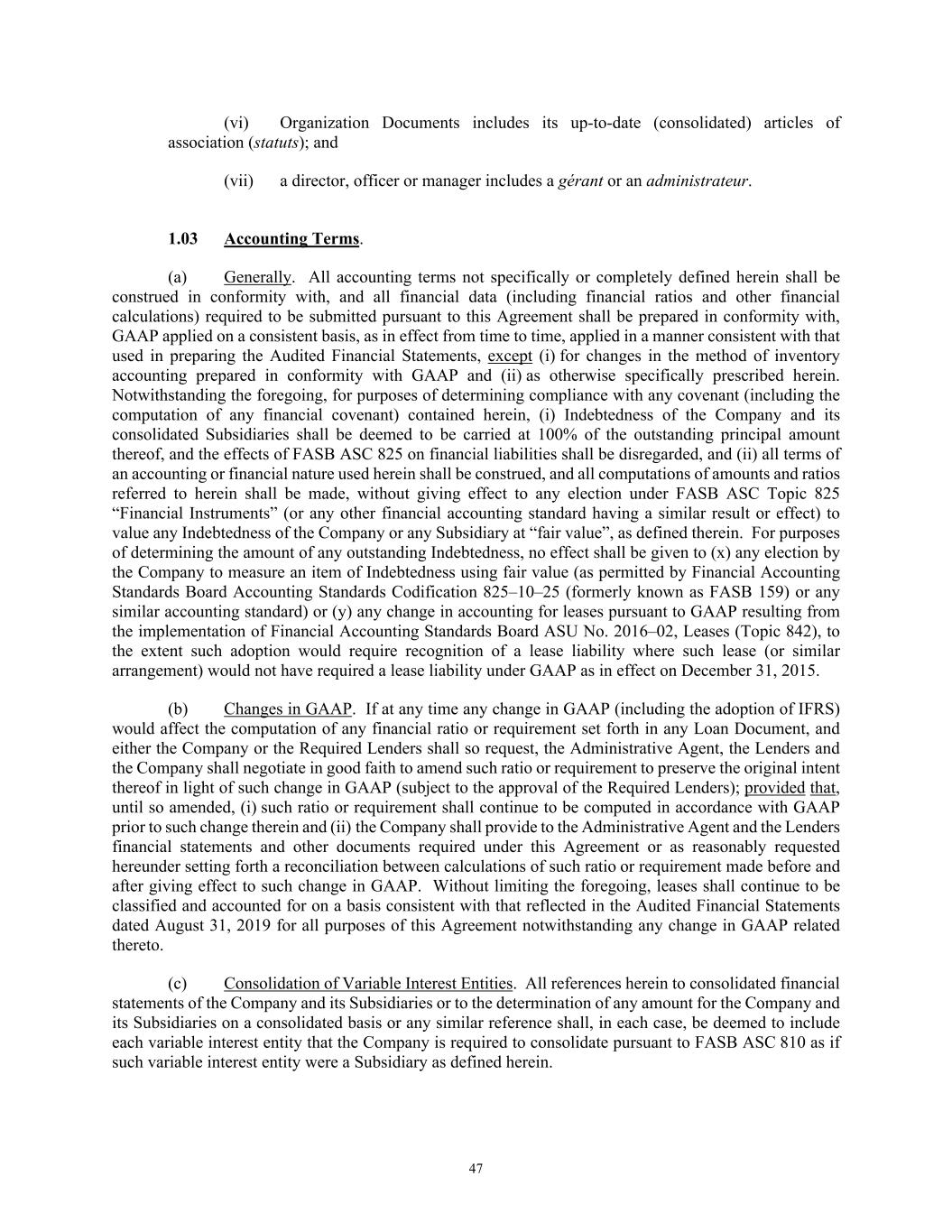 47 (vi) Organization Documents includes its up-to-date (consolidated) articles of association (statuts); and (vii) a director, officer or manager includes a gérant or an administrateur. 1.03 Accounting Terms. (a) Generally. All accounting terms not specifically or completely defined herein shall be construed in conformity with, and all financial data (including financial ratios and other financial calculations) required to be submitted pursuant to this Agreement shall be prepared in conformity with, GAAP applied on a consistent basis, as in effect from time to time, applied in a manner consistent with that used in preparing the Audited Financial Statements, except (i) for changes in the method of inventory accounting prepared in conformity with GAAP and (ii) as otherwise specifically prescribed herein. Notwithstanding the foregoing, for purposes of determining compliance with any covenant (including the computation of any financial covenant) contained herein, (i) Indebtedness of the Company and its consolidated Subsidiaries shall be deemed to be carried at 100% of the outstanding principal amount thereof, and the effects of FASB ASC 825 on financial liabilities shall be disregarded, and (ii) all terms of an accounting or financial nature used herein shall be construed, and all computations of amounts and ratios referred to herein shall be made, without giving effect to any election under FASB ASC Topic 825 “Financial Instruments” (or any other financial accounting standard having a similar result or effect) to value any Indebtedness of the Company or any Subsidiary at “fair value”, as defined therein. For purposes of determining the amount of any outstanding Indebtedness, no effect shall be given to (x) any election by the Company to measure an item of Indebtedness using fair value (as permitted by Financial Accounting Standards Board Accounting Standards Codification 825–10–25 (formerly known as FASB 159) or any similar accounting standard) or (y) any change in accounting for leases pursuant to GAAP resulting from the implementation of Financial Accounting Standards Board ASU No. 2016–02, Leases (Topic 842), to the extent such adoption would require recognition of a lease liability where such lease (or similar arrangement) would not have required a lease liability under GAAP as in effect on December 31, 2015. (b) Changes in GAAP. If at any time any change in GAAP (including the adoption of IFRS) would affect the computation of any financial ratio or requirement set forth in any Loan Document, and either the Company or the Required Lenders shall so request, the Administrative Agent, the Lenders and the Company shall negotiate in good faith to amend such ratio or requirement to preserve the original intent thereof in light of such change in GAAP (subject to the approval of the Required Lenders); provided that, until so amended, (i) such ratio or requirement shall continue to be computed in accordance with GAAP prior to such change therein and (ii) the Company shall provide to the Administrative Agent and the Lenders financial statements and other documents required under this Agreement or as reasonably requested hereunder setting forth a reconciliation between calculations of such ratio or requirement made before and after giving effect to such change in GAAP. Without limiting the foregoing, leases shall continue to be classified and accounted for on a basis consistent with that reflected in the Audited Financial Statements dated August 31, 2019 for all purposes of this Agreement notwithstanding any change in GAAP related thereto. (c) Consolidation of Variable Interest Entities. All references herein to consolidated financial statements of the Company and its Subsidiaries or to the determination of any amount for the Company and its Subsidiaries on a consolidated basis or any similar reference shall, in each case, be deemed to include each variable interest entity that the Company is required to consolidate pursuant to FASB ASC 810 as if such variable interest entity were a Subsidiary as defined herein.
