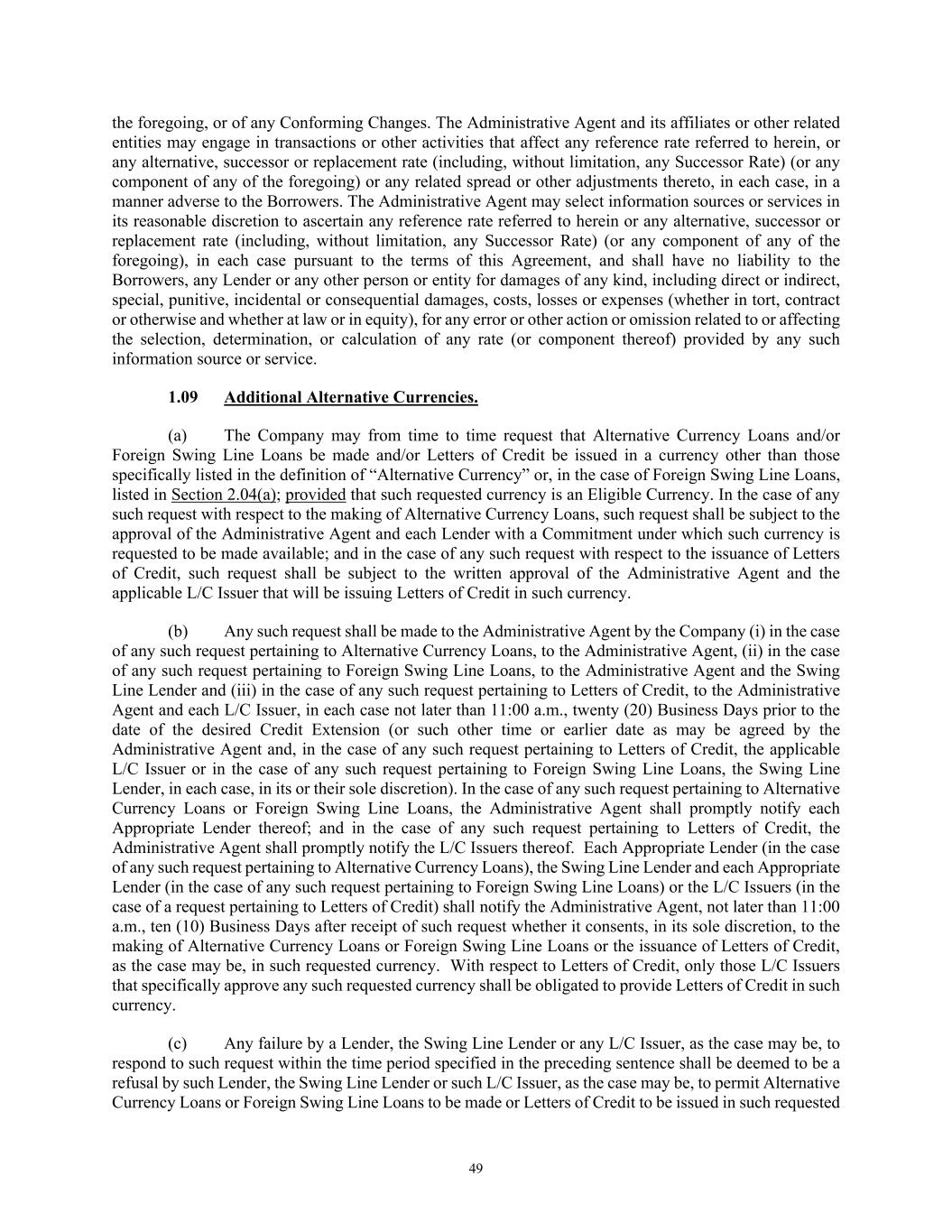 49 the foregoing, or of any Conforming Changes. The Administrative Agent and its affiliates or other related entities may engage in transactions or other activities that affect any reference rate referred to herein, or any alternative, successor or replacement rate (including, without limitation, any Successor Rate) (or any component of any of the foregoing) or any related spread or other adjustments thereto, in each case, in a manner adverse to the Borrowers. The Administrative Agent may select information sources or services in its reasonable discretion to ascertain any reference rate referred to herein or any alternative, successor or replacement rate (including, without limitation, any Successor Rate) (or any component of any of the foregoing), in each case pursuant to the terms of this Agreement, and shall have no liability to the Borrowers, any Lender or any other person or entity for damages of any kind, including direct or indirect, special, punitive, incidental or consequential damages, costs, losses or expenses (whether in tort, contract or otherwise and whether at law or in equity), for any error or other action or omission related to or affecting the selection, determination, or calculation of any rate (or component thereof) provided by any such information source or service. 1.09 Additional Alternative Currencies. (a) The Company may from time to time request that Alternative Currency Loans and/or Foreign Swing Line Loans be made and/or Letters of Credit be issued in a currency other than those specifically listed in the definition of “Alternative Currency” or, in the case of Foreign Swing Line Loans, listed in Section 2.04(a); provided that such requested currency is an Eligible Currency. In the case of any such request with respect to the making of Alternative Currency Loans, such request shall be subject to the approval of the Administrative Agent and each Lender with a Commitment under which such currency is requested to be made available; and in the case of any such request with respect to the issuance of Letters of Credit, such request shall be subject to the written approval of the Administrative Agent and the applicable L/C Issuer that will be issuing Letters of Credit in such currency. (b) Any such request shall be made to the Administrative Agent by the Company (i) in the case of any such request pertaining to Alternative Currency Loans, to the Administrative Agent, (ii) in the case of any such request pertaining to Foreign Swing Line Loans, to the Administrative Agent and the Swing Line Lender and (iii) in the case of any such request pertaining to Letters of Credit, to the Administrative Agent and each L/C Issuer, in each case not later than 11:00 a.m., twenty (20) Business Days prior to the date of the desired Credit Extension (or such other time or earlier date as may be agreed by the Administrative Agent and, in the case of any such request pertaining to Letters of Credit, the applicable L/C Issuer or in the case of any such request pertaining to Foreign Swing Line Loans, the Swing Line Lender, in each case, in its or their sole discretion). In the case of any such request pertaining to Alternative Currency Loans or Foreign Swing Line Loans, the Administrative Agent shall promptly notify each Appropriate Lender thereof; and in the case of any such request pertaining to Letters of Credit, the Administrative Agent shall promptly notify the L/C Issuers thereof. Each Appropriate Lender (in the case of any such request pertaining to Alternative Currency Loans), the Swing Line Lender and each Appropriate Lender (in the case of any such request pertaining to Foreign Swing Line Loans) or the L/C Issuers (in the case of a request pertaining to Letters of Credit) shall notify the Administrative Agent, not later than 11:00 a.m., ten (10) Business Days after receipt of such request whether it consents, in its sole discretion, to the making of Alternative Currency Loans or Foreign Swing Line Loans or the issuance of Letters of Credit, as the case may be, in such requested currency. With respect to Letters of Credit, only those L/C Issuers that specifically approve any such requested currency shall be obligated to provide Letters of Credit in such currency. (c) Any failure by a Lender, the Swing Line Lender or any L/C Issuer, as the case may be, to respond to such request within the time period specified in the preceding sentence shall be deemed to be a refusal by such Lender, the Swing Line Lender or such L/C Issuer, as the case may be, to permit Alternative Currency Loans or Foreign Swing Line Loans to be made or Letters of Credit to be issued in such requested