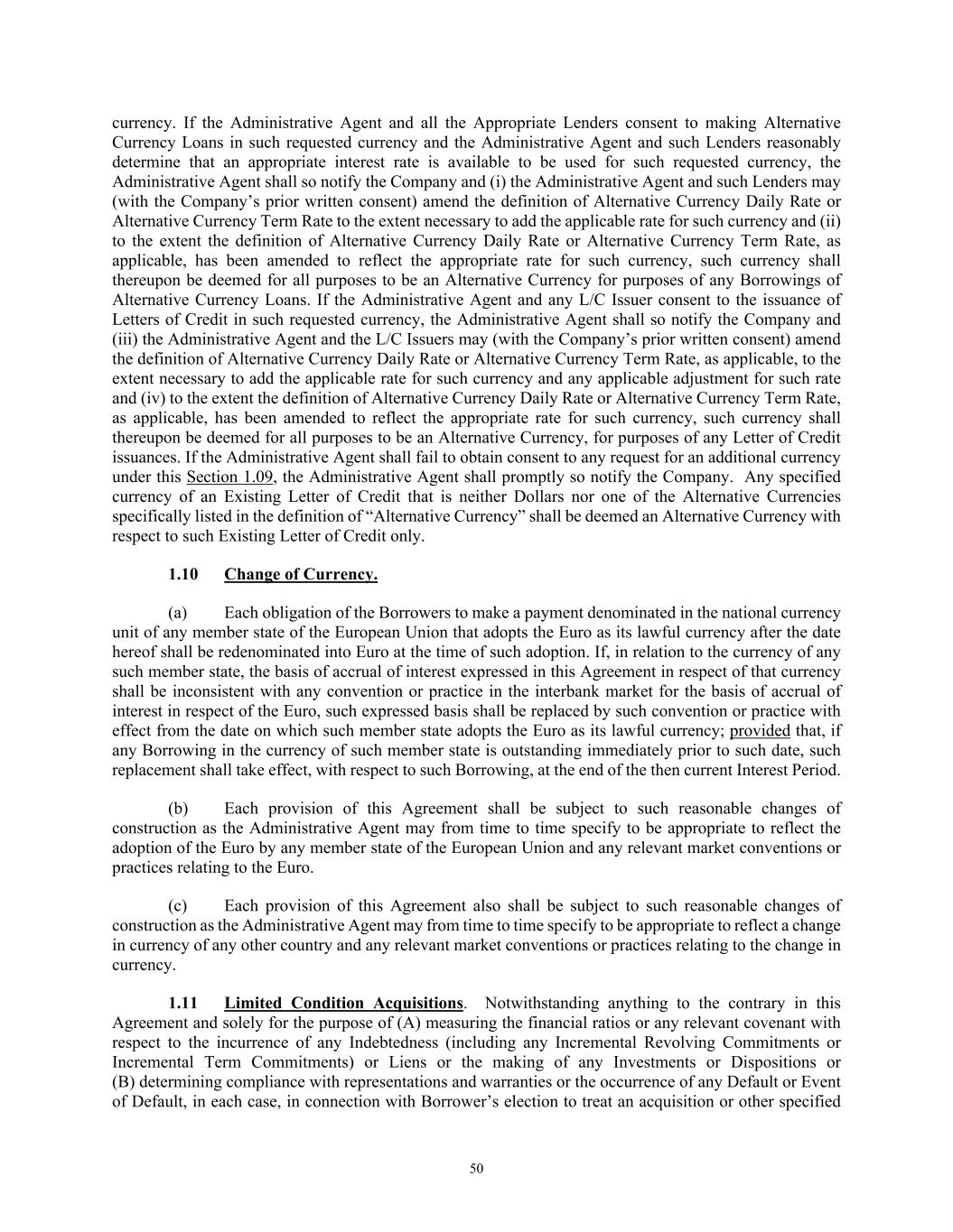 50 currency. If the Administrative Agent and all the Appropriate Lenders consent to making Alternative Currency Loans in such requested currency and the Administrative Agent and such Lenders reasonably determine that an appropriate interest rate is available to be used for such requested currency, the Administrative Agent shall so notify the Company and (i) the Administrative Agent and such Lenders may (with the Company’s prior written consent) amend the definition of Alternative Currency Daily Rate or Alternative Currency Term Rate to the extent necessary to add the applicable rate for such currency and (ii) to the extent the definition of Alternative Currency Daily Rate or Alternative Currency Term Rate, as applicable, has been amended to reflect the appropriate rate for such currency, such currency shall thereupon be deemed for all purposes to be an Alternative Currency for purposes of any Borrowings of Alternative Currency Loans. If the Administrative Agent and any L/C Issuer consent to the issuance of Letters of Credit in such requested currency, the Administrative Agent shall so notify the Company and (iii) the Administrative Agent and the L/C Issuers may (with the Company’s prior written consent) amend the definition of Alternative Currency Daily Rate or Alternative Currency Term Rate, as applicable, to the extent necessary to add the applicable rate for such currency and any applicable adjustment for such rate and (iv) to the extent the definition of Alternative Currency Daily Rate or Alternative Currency Term Rate, as applicable, has been amended to reflect the appropriate rate for such currency, such currency shall thereupon be deemed for all purposes to be an Alternative Currency, for purposes of any Letter of Credit issuances. If the Administrative Agent shall fail to obtain consent to any request for an additional currency under this Section 1.09, the Administrative Agent shall promptly so notify the Company. Any specified currency of an Existing Letter of Credit that is neither Dollars nor one of the Alternative Currencies specifically listed in the definition of “Alternative Currency” shall be deemed an Alternative Currency with respect to such Existing Letter of Credit only. 1.10 Change of Currency. (a) Each obligation of the Borrowers to make a payment denominated in the national currency unit of any member state of the European Union that adopts the Euro as its lawful currency after the date hereof shall be redenominated into Euro at the time of such adoption. If, in relation to the currency of any such member state, the basis of accrual of interest expressed in this Agreement in respect of that currency shall be inconsistent with any convention or practice in the interbank market for the basis of accrual of interest in respect of the Euro, such expressed basis shall be replaced by such convention or practice with effect from the date on which such member state adopts the Euro as its lawful currency; provided that, if any Borrowing in the currency of such member state is outstanding immediately prior to such date, such replacement shall take effect, with respect to such Borrowing, at the end of the then current Interest Period. (b) Each provision of this Agreement shall be subject to such reasonable changes of construction as the Administrative Agent may from time to time specify to be appropriate to reflect the adoption of the Euro by any member state of the European Union and any relevant market conventions or practices relating to the Euro. (c) Each provision of this Agreement also shall be subject to such reasonable changes of construction as the Administrative Agent may from time to time specify to be appropriate to reflect a change in currency of any other country and any relevant market conventions or practices relating to the change in currency. 1.11 Limited Condition Acquisitions. Notwithstanding anything to the contrary in this Agreement and solely for the purpose of (A) measuring the financial ratios or any relevant covenant with respect to the incurrence of any Indebtedness (including any Incremental Revolving Commitments or Incremental Term Commitments) or Liens or the making of any Investments or Dispositions or (B) determining compliance with representations and warranties or the occurrence of any Default or Event of Default, in each case, in connection with Borrower’s election to treat an acquisition or other specified