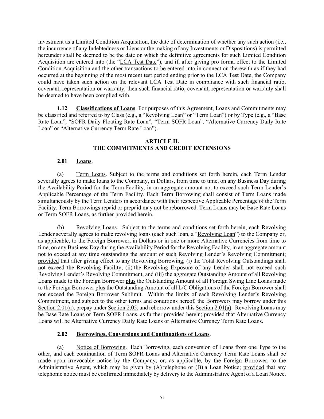 51 investment as a Limited Condition Acquisition, the date of determination of whether any such action (i.e., the incurrence of any Indebtedness or Liens or the making of any Investments or Dispositions) is permitted hereunder shall be deemed to be the date on which the definitive agreements for such Limited Condition Acquisition are entered into (the “LCA Test Date”), and if, after giving pro forma effect to the Limited Condition Acquisition and the other transactions to be entered into in connection therewith as if they had occurred at the beginning of the most recent test period ending prior to the LCA Test Date, the Company could have taken such action on the relevant LCA Test Date in compliance with such financial ratio, covenant, representation or warranty, then such financial ratio, covenant, representation or warranty shall be deemed to have been complied with. 1.12 Classifications of Loans. For purposes of this Agreement, Loans and Commitments may be classified and referred to by Class (e.g., a “Revolving Loan” or “Term Loan”) or by Type (e.g., a “Base Rate Loan”, “SOFR Daily Floating Rate Loan”, “Term SOFR Loan”, “Alternative Currency Daily Rate Loan” or “Alternative Currency Term Rate Loan”). ARTICLE II. THE COMMITMENTS AND CREDIT EXTENSIONS 2.01 Loans. (a) Term Loans. Subject to the terms and conditions set forth herein, each Term Lender severally agrees to make loans to the Company, in Dollars, from time to time, on any Business Day during the Availability Period for the Term Facility, in an aggregate amount not to exceed such Term Lender’s Applicable Percentage of the Term Facility. Each Term Borrowing shall consist of Term Loans made simultaneously by the Term Lenders in accordance with their respective Applicable Percentage of the Term Facility. Term Borrowings repaid or prepaid may not be reborrowed. Term Loans may be Base Rate Loans or Term SOFR Loans, as further provided herein. (b) Revolving Loans. Subject to the terms and conditions set forth herein, each Revolving Lender severally agrees to make revolving loans (each such loan, a “Revolving Loan”) to the Company or, as applicable, to the Foreign Borrower, in Dollars or in one or more Alternative Currencies from time to time, on any Business Day during the Availability Period for the Revolving Facility, in an aggregate amount not to exceed at any time outstanding the amount of such Revolving Lender’s Revolving Commitment; provided that after giving effect to any Revolving Borrowing, (i) the Total Revolving Outstandings shall not exceed the Revolving Facility, (ii) the Revolving Exposure of any Lender shall not exceed such Revolving Lender’s Revolving Commitment, and (iii) the aggregate Outstanding Amount of all Revolving Loans made to the Foreign Borrower plus the Outstanding Amount of all Foreign Swing Line Loans made to the Foreign Borrower plus the Outstanding Amount of all L/C Obligations of the Foreign Borrower shall not exceed the Foreign Borrower Sublimit. Within the limits of each Revolving Lender’s Revolving Commitment, and subject to the other terms and conditions hereof, the Borrowers may borrow under this Section 2.01(a), prepay under Section 2.05, and reborrow under this Section 2.01(a). Revolving Loans may be Base Rate Loans or Term SOFR Loans, as further provided herein; provided that Alternative Currency Loans will be Alternative Currency Daily Rate Loans or Alternative Currency Term Rate Loans. 2.02 Borrowings, Conversions and Continuations of Loans. (a) Notice of Borrowing. Each Borrowing, each conversion of Loans from one Type to the other, and each continuation of Term SOFR Loans and Alternative Currency Term Rate Loans shall be made upon irrevocable notice by the Company, or, as applicable, by the Foreign Borrower, to the Administrative Agent, which may be given by (A) telephone or (B) a Loan Notice; provided that any telephonic notice must be confirmed immediately by delivery to the Administrative Agent of a Loan Notice.