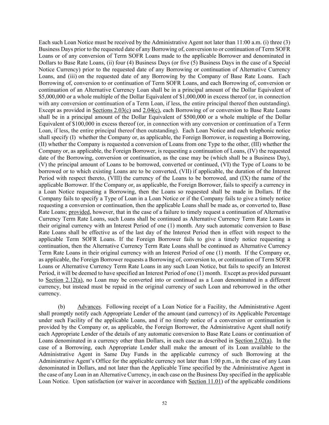 52 Each such Loan Notice must be received by the Administrative Agent not later than 11:00 a.m. (i) three (3) Business Days prior to the requested date of any Borrowing of, conversion to or continuation of Term SOFR Loans or of any conversion of Term SOFR Loans made to the applicable Borrower and denominated in Dollars to Base Rate Loans, (ii) four (4) Business Days (or five (5) Business Days in the case of a Special Notice Currency) prior to the requested date of any Borrowing or continuation of Alternative Currency Loans, and (iii) on the requested date of any Borrowing by the Company of Base Rate Loans. Each Borrowing of, conversion to or continuation of Term SOFR Loans, and each Borrowing of, conversion or continuation of an Alternative Currency Loan shall be in a principal amount of the Dollar Equivalent of $5,000,000 or a whole multiple of the Dollar Equivalent of $1,000,000 in excess thereof (or, in connection with any conversion or continuation of a Term Loan, if less, the entire principal thereof then outstanding). Except as provided in Sections 2.03(c) and 2.04(c), each Borrowing of or conversion to Base Rate Loans shall be in a principal amount of the Dollar Equivalent of $500,000 or a whole multiple of the Dollar Equivalent of $100,000 in excess thereof (or, in connection with any conversion or continuation of a Term Loan, if less, the entire principal thereof then outstanding). Each Loan Notice and each telephonic notice shall specify (I) whether the Company or, as applicable, the Foreign Borrower, is requesting a Borrowing, (II) whether the Company is requested a conversion of Loans from one Type to the other, (III) whether the Company or, as applicable, the Foreign Borrower, is requesting a continuation of Loans, (IV) the requested date of the Borrowing, conversion or continuation, as the case may be (which shall be a Business Day), (V) the principal amount of Loans to be borrowed, converted or continued, (VI) the Type of Loans to be borrowed or to which existing Loans are to be converted, (VII) if applicable, the duration of the Interest Period with respect thereto, (VIII) the currency of the Loans to be borrowed, and (IX) the name of the applicable Borrower. If the Company or, as applicable, the Foreign Borrower, fails to specify a currency in a Loan Notice requesting a Borrowing, then the Loans so requested shall be made in Dollars. If the Company fails to specify a Type of Loan in a Loan Notice or if the Company fails to give a timely notice requesting a conversion or continuation, then the applicable Loans shall be made as, or converted to, Base Rate Loans; provided, however, that in the case of a failure to timely request a continuation of Alternative Currency Term Rate Loans, such Loans shall be continued as Alternative Currency Term Rate Loans in their original currency with an Interest Period of one (1) month. Any such automatic conversion to Base Rate Loans shall be effective as of the last day of the Interest Period then in effect with respect to the applicable Term SOFR Loans. If the Foreign Borrower fails to give a timely notice requesting a continuation, then the Alternative Currency Term Rate Loans shall be continued as Alternative Currency Term Rate Loans in their original currency with an Interest Period of one (1) month. If the Company or, as applicable, the Foreign Borrower requests a Borrowing of, conversion to, or continuation of Term SOFR Loans or Alternative Currency Term Rate Loans in any such Loan Notice, but fails to specify an Interest Period, it will be deemed to have specified an Interest Period of one (1) month. Except as provided pursuant to Section 2.12(a), no Loan may be converted into or continued as a Loan denominated in a different currency, but instead must be repaid in the original currency of such Loan and reborrowed in the other currency. (b) Advances. Following receipt of a Loan Notice for a Facility, the Administrative Agent shall promptly notify each Appropriate Lender of the amount (and currency) of its Applicable Percentage under such Facility of the applicable Loans, and if no timely notice of a conversion or continuation is provided by the Company or, as applicable, the Foreign Borrower, the Administrative Agent shall notify each Appropriate Lender of the details of any automatic conversion to Base Rate Loans or continuation of Loans denominated in a currency other than Dollars, in each case as described in Section 2.02(a). In the case of a Borrowing, each Appropriate Lender shall make the amount of its Loan available to the Administrative Agent in Same Day Funds in the applicable currency of such Borrowing at the Administrative Agent’s Office for the applicable currency not later than 1:00 p.m., in the case of any Loan denominated in Dollars, and not later than the Applicable Time specified by the Administrative Agent in the case of any Loan in an Alternative Currency, in each case on the Business Day specified in the applicable Loan Notice. Upon satisfaction (or waiver in accordance with Section 11.01) of the applicable conditions