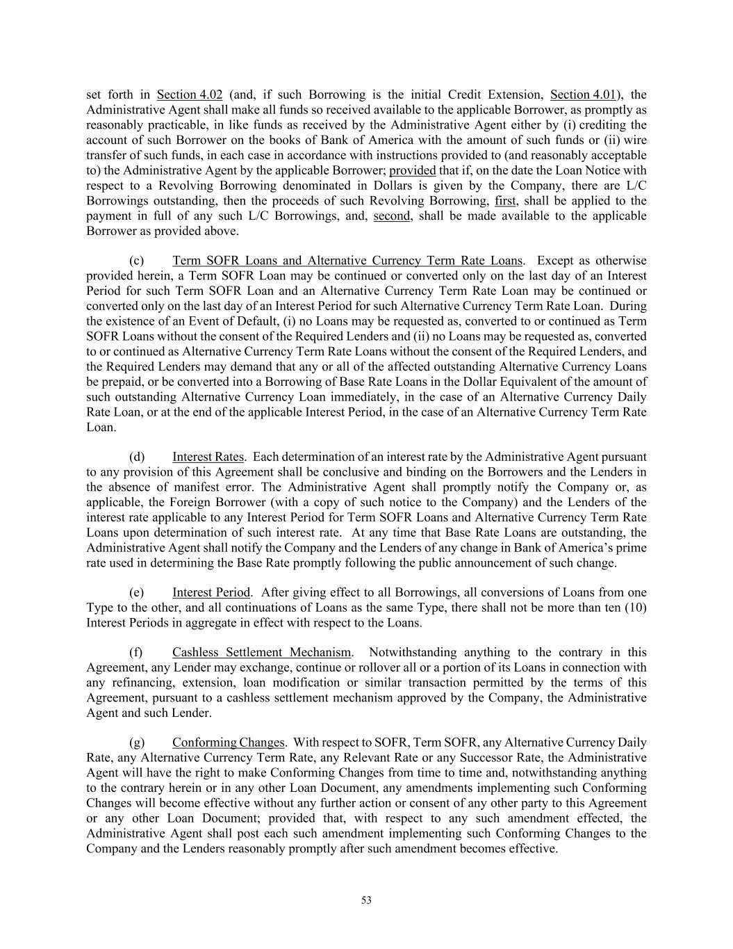 53 set forth in Section 4.02 (and, if such Borrowing is the initial Credit Extension, Section 4.01), the Administrative Agent shall make all funds so received available to the applicable Borrower, as promptly as reasonably practicable, in like funds as received by the Administrative Agent either by (i) crediting the account of such Borrower on the books of Bank of America with the amount of such funds or (ii) wire transfer of such funds, in each case in accordance with instructions provided to (and reasonably acceptable to) the Administrative Agent by the applicable Borrower; provided that if, on the date the Loan Notice with respect to a Revolving Borrowing denominated in Dollars is given by the Company, there are L/C Borrowings outstanding, then the proceeds of such Revolving Borrowing, first, shall be applied to the payment in full of any such L/C Borrowings, and, second, shall be made available to the applicable Borrower as provided above. (c) Term SOFR Loans and Alternative Currency Term Rate Loans. Except as otherwise provided herein, a Term SOFR Loan may be continued or converted only on the last day of an Interest Period for such Term SOFR Loan and an Alternative Currency Term Rate Loan may be continued or converted only on the last day of an Interest Period for such Alternative Currency Term Rate Loan. During the existence of an Event of Default, (i) no Loans may be requested as, converted to or continued as Term SOFR Loans without the consent of the Required Lenders and (ii) no Loans may be requested as, converted to or continued as Alternative Currency Term Rate Loans without the consent of the Required Lenders, and the Required Lenders may demand that any or all of the affected outstanding Alternative Currency Loans be prepaid, or be converted into a Borrowing of Base Rate Loans in the Dollar Equivalent of the amount of such outstanding Alternative Currency Loan immediately, in the case of an Alternative Currency Daily Rate Loan, or at the end of the applicable Interest Period, in the case of an Alternative Currency Term Rate Loan. (d) Interest Rates. Each determination of an interest rate by the Administrative Agent pursuant to any provision of this Agreement shall be conclusive and binding on the Borrowers and the Lenders in the absence of manifest error. The Administrative Agent shall promptly notify the Company or, as applicable, the Foreign Borrower (with a copy of such notice to the Company) and the Lenders of the interest rate applicable to any Interest Period for Term SOFR Loans and Alternative Currency Term Rate Loans upon determination of such interest rate. At any time that Base Rate Loans are outstanding, the Administrative Agent shall notify the Company and the Lenders of any change in Bank of America’s prime rate used in determining the Base Rate promptly following the public announcement of such change. (e) Interest Period. After giving effect to all Borrowings, all conversions of Loans from one Type to the other, and all continuations of Loans as the same Type, there shall not be more than ten (10) Interest Periods in aggregate in effect with respect to the Loans. (f) Cashless Settlement Mechanism. Notwithstanding anything to the contrary in this Agreement, any Lender may exchange, continue or rollover all or a portion of its Loans in connection with any refinancing, extension, loan modification or similar transaction permitted by the terms of this Agreement, pursuant to a cashless settlement mechanism approved by the Company, the Administrative Agent and such Lender. (g) Conforming Changes. With respect to SOFR, Term SOFR, any Alternative Currency Daily Rate, any Alternative Currency Term Rate, any Relevant Rate or any Successor Rate, the Administrative Agent will have the right to make Conforming Changes from time to time and, notwithstanding anything to the contrary herein or in any other Loan Document, any amendments implementing such Conforming Changes will become effective without any further action or consent of any other party to this Agreement or any other Loan Document; provided that, with respect to any such amendment effected, the Administrative Agent shall post each such amendment implementing such Conforming Changes to the Company and the Lenders reasonably promptly after such amendment becomes effective.