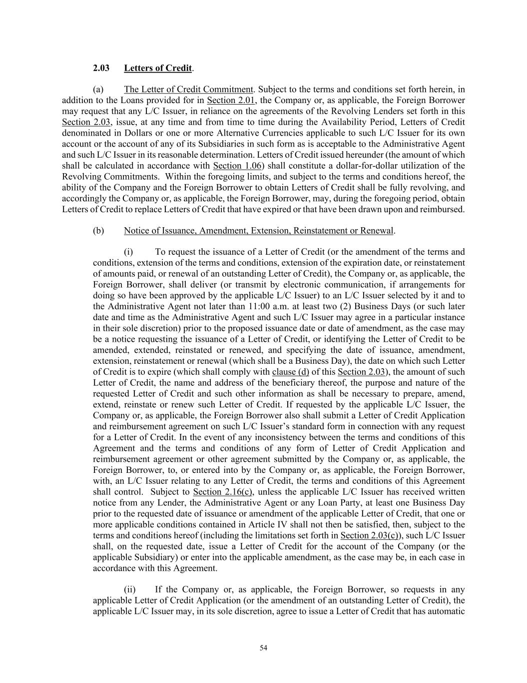 54 2.03 Letters of Credit. (a) The Letter of Credit Commitment. Subject to the terms and conditions set forth herein, in addition to the Loans provided for in Section 2.01, the Company or, as applicable, the Foreign Borrower may request that any L/C Issuer, in reliance on the agreements of the Revolving Lenders set forth in this Section 2.03, issue, at any time and from time to time during the Availability Period, Letters of Credit denominated in Dollars or one or more Alternative Currencies applicable to such L/C Issuer for its own account or the account of any of its Subsidiaries in such form as is acceptable to the Administrative Agent and such L/C Issuer in its reasonable determination. Letters of Credit issued hereunder (the amount of which shall be calculated in accordance with Section 1.06) shall constitute a dollar-for-dollar utilization of the Revolving Commitments. Within the foregoing limits, and subject to the terms and conditions hereof, the ability of the Company and the Foreign Borrower to obtain Letters of Credit shall be fully revolving, and accordingly the Company or, as applicable, the Foreign Borrower, may, during the foregoing period, obtain Letters of Credit to replace Letters of Credit that have expired or that have been drawn upon and reimbursed. (b) Notice of Issuance, Amendment, Extension, Reinstatement or Renewal. (i) To request the issuance of a Letter of Credit (or the amendment of the terms and conditions, extension of the terms and conditions, extension of the expiration date, or reinstatement of amounts paid, or renewal of an outstanding Letter of Credit), the Company or, as applicable, the Foreign Borrower, shall deliver (or transmit by electronic communication, if arrangements for doing so have been approved by the applicable L/C Issuer) to an L/C Issuer selected by it and to the Administrative Agent not later than 11:00 a.m. at least two (2) Business Days (or such later date and time as the Administrative Agent and such L/C Issuer may agree in a particular instance in their sole discretion) prior to the proposed issuance date or date of amendment, as the case may be a notice requesting the issuance of a Letter of Credit, or identifying the Letter of Credit to be amended, extended, reinstated or renewed, and specifying the date of issuance, amendment, extension, reinstatement or renewal (which shall be a Business Day), the date on which such Letter of Credit is to expire (which shall comply with clause (d) of this Section 2.03), the amount of such Letter of Credit, the name and address of the beneficiary thereof, the purpose and nature of the requested Letter of Credit and such other information as shall be necessary to prepare, amend, extend, reinstate or renew such Letter of Credit. If requested by the applicable L/C Issuer, the Company or, as applicable, the Foreign Borrower also shall submit a Letter of Credit Application and reimbursement agreement on such L/C Issuer’s standard form in connection with any request for a Letter of Credit. In the event of any inconsistency between the terms and conditions of this Agreement and the terms and conditions of any form of Letter of Credit Application and reimbursement agreement or other agreement submitted by the Company or, as applicable, the Foreign Borrower, to, or entered into by the Company or, as applicable, the Foreign Borrower, with, an L/C Issuer relating to any Letter of Credit, the terms and conditions of this Agreement shall control. Subject to Section 2.16(c), unless the applicable L/C Issuer has received written notice from any Lender, the Administrative Agent or any Loan Party, at least one Business Day prior to the requested date of issuance or amendment of the applicable Letter of Credit, that one or more applicable conditions contained in Article IV shall not then be satisfied, then, subject to the terms and conditions hereof (including the limitations set forth in Section 2.03(c)), such L/C Issuer shall, on the requested date, issue a Letter of Credit for the account of the Company (or the applicable Subsidiary) or enter into the applicable amendment, as the case may be, in each case in accordance with this Agreement. (ii) If the Company or, as applicable, the Foreign Borrower, so requests in any applicable Letter of Credit Application (or the amendment of an outstanding Letter of Credit), the applicable L/C Issuer may, in its sole discretion, agree to issue a Letter of Credit that has automatic