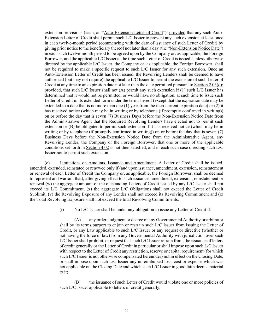 55 extension provisions (each, an “Auto-Extension Letter of Credit”); provided that any such Auto- Extension Letter of Credit shall permit such L/C Issuer to prevent any such extension at least once in each twelve-month period (commencing with the date of issuance of such Letter of Credit) by giving prior notice to the beneficiary thereof not later than a day (the “Non-Extension Notice Date”) in each such twelve-month period to be agreed upon by the Company or, as applicable, the Foreign Borrower, and the applicable L/C Issuer at the time such Letter of Credit is issued. Unless otherwise directed by the applicable L/C Issuer, the Company or, as applicable, the Foreign Borrower, shall not be required to make a specific request to such L/C Issuer for any such extension. Once an Auto-Extension Letter of Credit has been issued, the Revolving Lenders shall be deemed to have authorized (but may not require) the applicable L/C Issuer to permit the extension of such Letter of Credit at any time to an expiration date not later than the date permitted pursuant to Section 2.03(d); provided, that such L/C Issuer shall not (A) permit any such extension if (1) such L/C Issuer has determined that it would not be permitted, or would have no obligation, at such time to issue such Letter of Credit in its extended form under the terms hereof (except that the expiration date may be extended to a date that is no more than one (1) year from the then-current expiration date) or (2) it has received notice (which may be in writing or by telephone (if promptly confirmed in writing)) on or before the day that is seven (7) Business Days before the Non-Extension Notice Date from the Administrative Agent that the Required Revolving Lenders have elected not to permit such extension or (B) be obligated to permit such extension if it has received notice (which may be in writing or by telephone (if promptly confirmed in writing)) on or before the day that is seven (7) Business Days before the Non-Extension Notice Date from the Administrative Agent, any Revolving Lender, the Company or the Foreign Borrower, that one or more of the applicable conditions set forth in Section 4.02 is not then satisfied, and in each such case directing such L/C Issuer not to permit such extension. (c) Limitations on Amounts, Issuance and Amendment. A Letter of Credit shall be issued, amended, extended, reinstated or renewed only if (and upon issuance, amendment, extension, reinstatement or renewal of each Letter of Credit the Company or, as applicable, the Foreign Borrower, shall be deemed to represent and warrant that), after giving effect to such issuance, amendment, extension, reinstatement or renewal (w) the aggregate amount of the outstanding Letters of Credit issued by any L/C Issuer shall not exceed its L/C Commitment, (x) the aggregate L/C Obligations shall not exceed the Letter of Credit Sublimit, (y) the Revolving Exposure of any Lender shall not exceed its Revolving Commitment and (z) the Total Revolving Exposure shall not exceed the total Revolving Commitments. (i) No L/C Issuer shall be under any obligation to issue any Letter of Credit if: (A) any order, judgment or decree of any Governmental Authority or arbitrator shall by its terms purport to enjoin or restrain such L/C Issuer from issuing the Letter of Credit, or any Law applicable to such L/C Issuer or any request or directive (whether or not having the force of law) from any Governmental Authority with jurisdiction over such L/C Issuer shall prohibit, or request that such L/C Issuer refrain from, the issuance of letters of credit generally or the Letter of Credit in particular or shall impose upon such L/C Issuer with respect to the Letter of Credit any restriction, reserve or capital requirement (for which such L/C Issuer is not otherwise compensated hereunder) not in effect on the Closing Date, or shall impose upon such L/C Issuer any unreimbursed loss, cost or expense which was not applicable on the Closing Date and which such L/C Issuer in good faith deems material to it; (B) the issuance of such Letter of Credit would violate one or more policies of such L/C Issuer applicable to letters of credit generally;