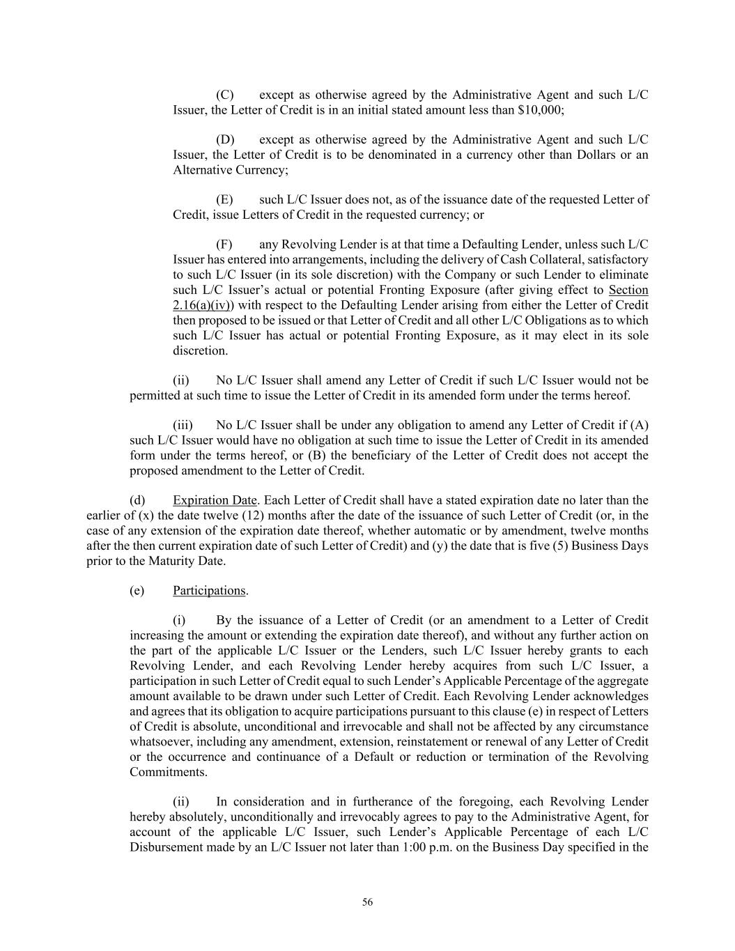 56 (C) except as otherwise agreed by the Administrative Agent and such L/C Issuer, the Letter of Credit is in an initial stated amount less than $10,000; (D) except as otherwise agreed by the Administrative Agent and such L/C Issuer, the Letter of Credit is to be denominated in a currency other than Dollars or an Alternative Currency; (E) such L/C Issuer does not, as of the issuance date of the requested Letter of Credit, issue Letters of Credit in the requested currency; or (F) any Revolving Lender is at that time a Defaulting Lender, unless such L/C Issuer has entered into arrangements, including the delivery of Cash Collateral, satisfactory to such L/C Issuer (in its sole discretion) with the Company or such Lender to eliminate such L/C Issuer’s actual or potential Fronting Exposure (after giving effect to Section 2.16(a)(iv)) with respect to the Defaulting Lender arising from either the Letter of Credit then proposed to be issued or that Letter of Credit and all other L/C Obligations as to which such L/C Issuer has actual or potential Fronting Exposure, as it may elect in its sole discretion. (ii) No L/C Issuer shall amend any Letter of Credit if such L/C Issuer would not be permitted at such time to issue the Letter of Credit in its amended form under the terms hereof. (iii) No L/C Issuer shall be under any obligation to amend any Letter of Credit if (A) such L/C Issuer would have no obligation at such time to issue the Letter of Credit in its amended form under the terms hereof, or (B) the beneficiary of the Letter of Credit does not accept the proposed amendment to the Letter of Credit. (d) Expiration Date. Each Letter of Credit shall have a stated expiration date no later than the earlier of (x) the date twelve (12) months after the date of the issuance of such Letter of Credit (or, in the case of any extension of the expiration date thereof, whether automatic or by amendment, twelve months after the then current expiration date of such Letter of Credit) and (y) the date that is five (5) Business Days prior to the Maturity Date. (e) Participations. (i) By the issuance of a Letter of Credit (or an amendment to a Letter of Credit increasing the amount or extending the expiration date thereof), and without any further action on the part of the applicable L/C Issuer or the Lenders, such L/C Issuer hereby grants to each Revolving Lender, and each Revolving Lender hereby acquires from such L/C Issuer, a participation in such Letter of Credit equal to such Lender’s Applicable Percentage of the aggregate amount available to be drawn under such Letter of Credit. Each Revolving Lender acknowledges and agrees that its obligation to acquire participations pursuant to this clause (e) in respect of Letters of Credit is absolute, unconditional and irrevocable and shall not be affected by any circumstance whatsoever, including any amendment, extension, reinstatement or renewal of any Letter of Credit or the occurrence and continuance of a Default or reduction or termination of the Revolving Commitments. (ii) In consideration and in furtherance of the foregoing, each Revolving Lender hereby absolutely, unconditionally and irrevocably agrees to pay to the Administrative Agent, for account of the applicable L/C Issuer, such Lender’s Applicable Percentage of each L/C Disbursement made by an L/C Issuer not later than 1:00 p.m. on the Business Day specified in the