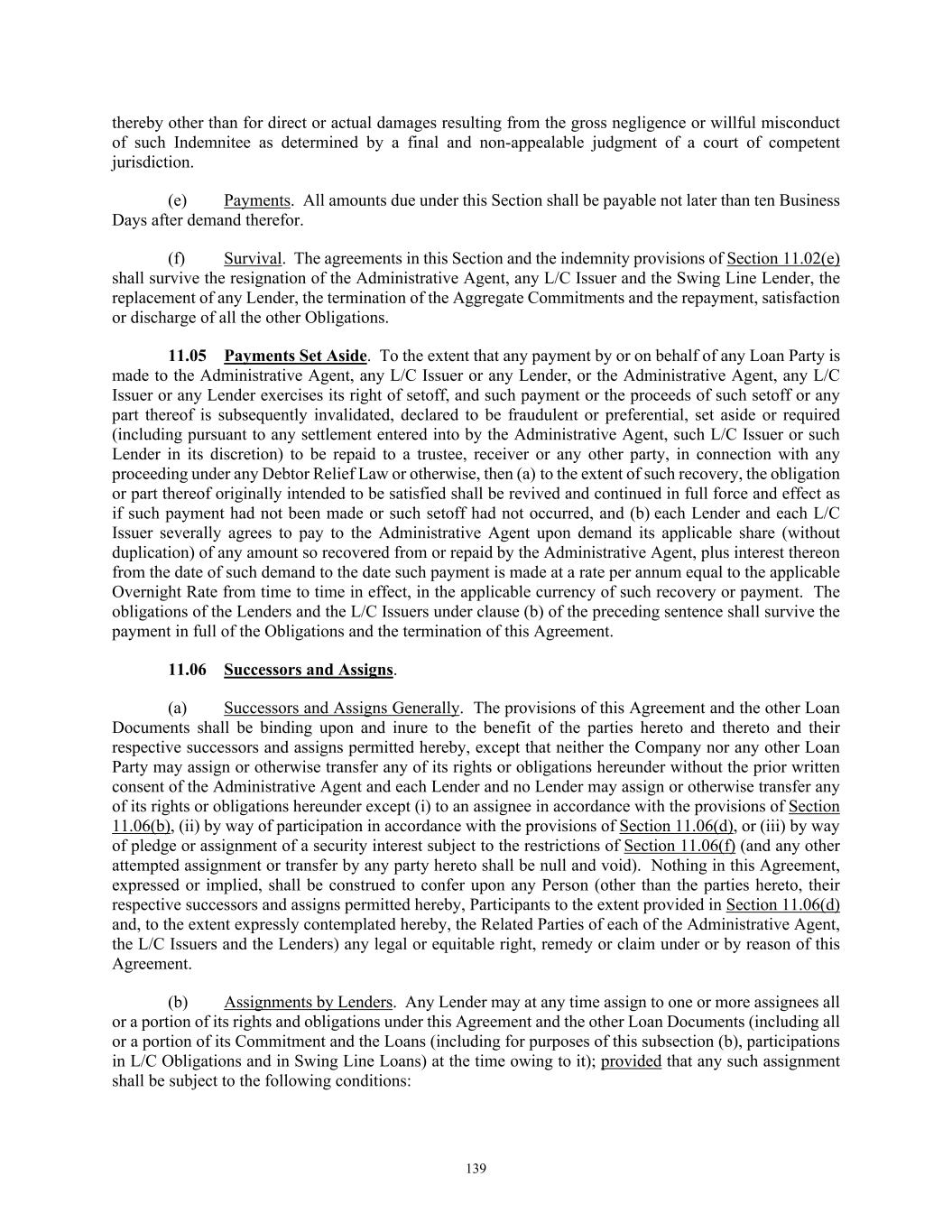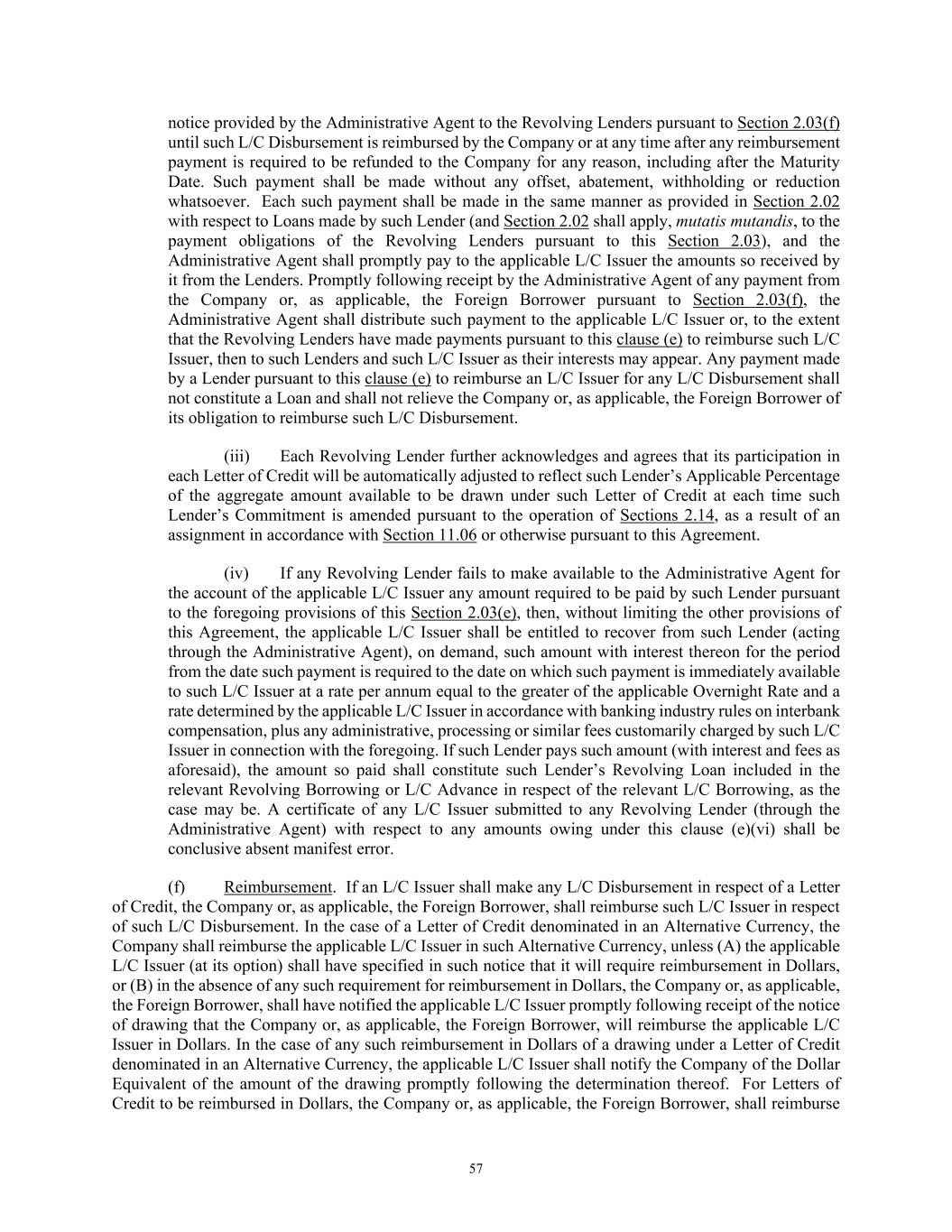 57 notice provided by the Administrative Agent to the Revolving Lenders pursuant to Section 2.03(f) until such L/C Disbursement is reimbursed by the Company or at any time after any reimbursement payment is required to be refunded to the Company for any reason, including after the Maturity Date. Such payment shall be made without any offset, abatement, withholding or reduction whatsoever. Each such payment shall be made in the same manner as provided in Section 2.02 with respect to Loans made by such Lender (and Section 2.02 shall apply, mutatis mutandis, to the payment obligations of the Revolving Lenders pursuant to this Section 2.03), and the Administrative Agent shall promptly pay to the applicable L/C Issuer the amounts so received by it from the Lenders. Promptly following receipt by the Administrative Agent of any payment from the Company or, as applicable, the Foreign Borrower pursuant to Section 2.03(f), the Administrative Agent shall distribute such payment to the applicable L/C Issuer or, to the extent that the Revolving Lenders have made payments pursuant to this clause (e) to reimburse such L/C Issuer, then to such Lenders and such L/C Issuer as their interests may appear. Any payment made by a Lender pursuant to this clause (e) to reimburse an L/C Issuer for any L/C Disbursement shall not constitute a Loan and shall not relieve the Company or, as applicable, the Foreign Borrower of its obligation to reimburse such L/C Disbursement. (iii) Each Revolving Lender further acknowledges and agrees that its participation in each Letter of Credit will be automatically adjusted to reflect such Lender’s Applicable Percentage of the aggregate amount available to be drawn under such Letter of Credit at each time such Lender’s Commitment is amended pursuant to the operation of Sections 2.14, as a result of an assignment in accordance with Section 11.06 or otherwise pursuant to this Agreement. (iv) If any Revolving Lender fails to make available to the Administrative Agent for the account of the applicable L/C Issuer any amount required to be paid by such Lender pursuant to the foregoing provisions of this Section 2.03(e), then, without limiting the other provisions of this Agreement, the applicable L/C Issuer shall be entitled to recover from such Lender (acting through the Administrative Agent), on demand, such amount with interest thereon for the period from the date such payment is required to the date on which such payment is immediately available to such L/C Issuer at a rate per annum equal to the greater of the applicable Overnight Rate and a rate determined by the applicable L/C Issuer in accordance with banking industry rules on interbank compensation, plus any administrative, processing or similar fees customarily charged by such L/C Issuer in connection with the foregoing. If such Lender pays such amount (with interest and fees as aforesaid), the amount so paid shall constitute such Lender’s Revolving Loan included in the relevant Revolving Borrowing or L/C Advance in respect of the relevant L/C Borrowing, as the case may be. A certificate of any L/C Issuer submitted to any Revolving Lender (through the Administrative Agent) with respect to any amounts owing under this clause (e)(vi) shall be conclusive absent manifest error. (f) Reimbursement. If an L/C Issuer shall make any L/C Disbursement in respect of a Letter of Credit, the Company or, as applicable, the Foreign Borrower, shall reimburse such L/C Issuer in respect of such L/C Disbursement. In the case of a Letter of Credit denominated in an Alternative Currency, the Company shall reimburse the applicable L/C Issuer in such Alternative Currency, unless (A) the applicable L/C Issuer (at its option) shall have specified in such notice that it will require reimbursement in Dollars, or (B) in the absence of any such requirement for reimbursement in Dollars, the Company or, as applicable, the Foreign Borrower, shall have notified the applicable L/C Issuer promptly following receipt of the notice of drawing that the Company or, as applicable, the Foreign Borrower, will reimburse the applicable L/C Issuer in Dollars. In the case of any such reimbursement in Dollars of a drawing under a Letter of Credit denominated in an Alternative Currency, the applicable L/C Issuer shall notify the Company of the Dollar Equivalent of the amount of the drawing promptly following the determination thereof. For Letters of Credit to be reimbursed in Dollars, the Company or, as applicable, the Foreign Borrower, shall reimburse