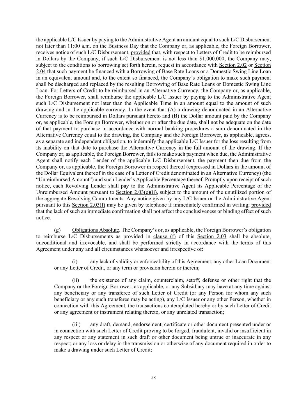 58 the applicable L/C Issuer by paying to the Administrative Agent an amount equal to such L/C Disbursement not later than 11:00 a.m. on the Business Day that the Company or, as applicable, the Foreign Borrower, receives notice of such L/C Disbursement, provided that, with respect to Letters of Credit to be reimbursed in Dollars by the Company, if such L/C Disbursement is not less than $1,000,000, the Company may, subject to the conditions to borrowing set forth herein, request in accordance with Section 2.02 or Section 2.04 that such payment be financed with a Borrowing of Base Rate Loans or a Domestic Swing Line Loan in an equivalent amount and, to the extent so financed, the Company’s obligation to make such payment shall be discharged and replaced by the resulting Borrowing of Base Rate Loans or Domestic Swing Line Loan. For Letters of Credit to be reimbursed in an Alternative Currency, the Company or, as applicable, the Foreign Borrower, shall reimburse the applicable L/C Issuer by paying to the Administrative Agent such L/C Disbursement not later than the Applicable Time in an amount equal to the amount of such drawing and in the applicable currency. In the event that (A) a drawing denominated in an Alternative Currency is to be reimbursed in Dollars pursuant hereto and (B) the Dollar amount paid by the Company or, as applicable, the Foreign Borrower, whether on or after the due date, shall not be adequate on the date of that payment to purchase in accordance with normal banking procedures a sum denominated in the Alternative Currency equal to the drawing, the Company and the Foreign Borrower, as applicable, agrees, as a separate and independent obligation, to indemnify the applicable L/C Issuer for the loss resulting from its inability on that date to purchase the Alternative Currency in the full amount of the drawing. If the Company or, as applicable, the Foreign Borrower, fails to make such payment when due, the Administrative Agent shall notify each Lender of the applicable L/C Disbursement, the payment then due from the Company or, as applicable, the Foreign Borrower in respect thereof (expressed in Dollars in the amount of the Dollar Equivalent thereof in the case of a Letter of Credit denominated in an Alternative Currency) (the “Unreimbursed Amount”) and such Lender’s Applicable Percentage thereof. Promptly upon receipt of such notice, each Revolving Lender shall pay to the Administrative Agent its Applicable Percentage of the Unreimbursed Amount pursuant to Section 2.03(e)(ii), subject to the amount of the unutilized portion of the aggregate Revolving Commitments. Any notice given by any L/C Issuer or the Administrative Agent pursuant to this Section 2.03(f) may be given by telephone if immediately confirmed in writing; provided that the lack of such an immediate confirmation shall not affect the conclusiveness or binding effect of such notice. (g) Obligations Absolute. The Company’s or, as applicable, the Foreign Borrower’s obligation to reimburse L/C Disbursements as provided in clause (f) of this Section 2.03 shall be absolute, unconditional and irrevocable, and shall be performed strictly in accordance with the terms of this Agreement under any and all circumstances whatsoever and irrespective of: (i) any lack of validity or enforceability of this Agreement, any other Loan Document or any Letter of Credit, or any term or provision herein or therein; (ii) the existence of any claim, counterclaim, setoff, defense or other right that the Company or the Foreign Borrower, as applicable, or any Subsidiary may have at any time against any beneficiary or any transferee of such Letter of Credit (or any Person for whom any such beneficiary or any such transferee may be acting), any L/C Issuer or any other Person, whether in connection with this Agreement, the transactions contemplated hereby or by such Letter of Credit or any agreement or instrument relating thereto, or any unrelated transaction; (iii) any draft, demand, endorsement, certificate or other document presented under or in connection with such Letter of Credit proving to be forged, fraudulent, invalid or insufficient in any respect or any statement in such draft or other document being untrue or inaccurate in any respect; or any loss or delay in the transmission or otherwise of any document required in order to make a drawing under such Letter of Credit;