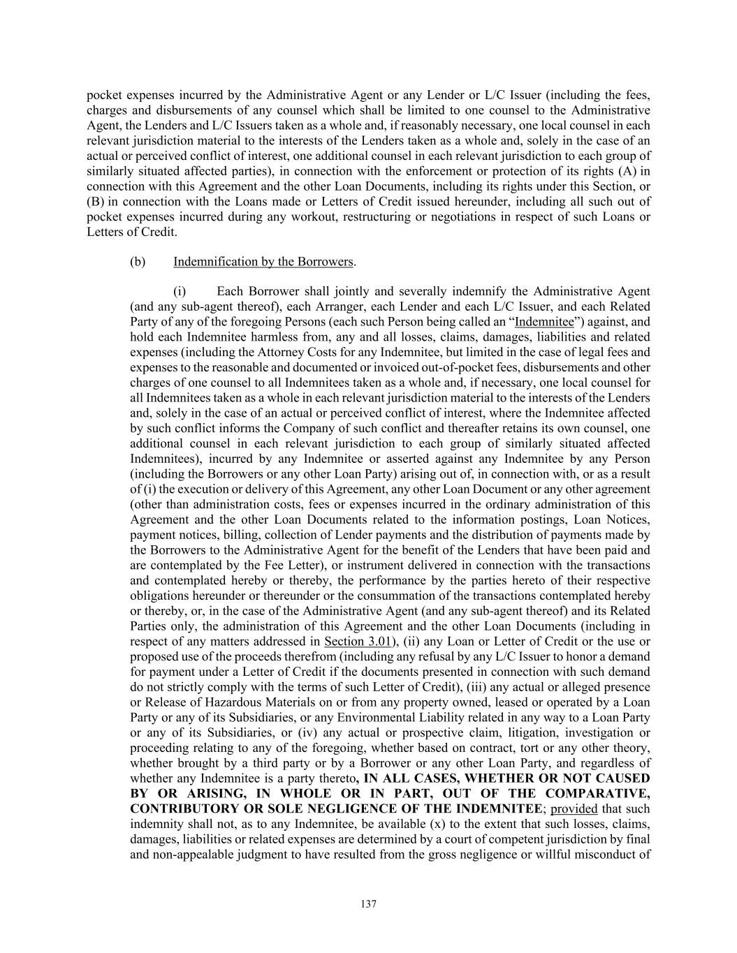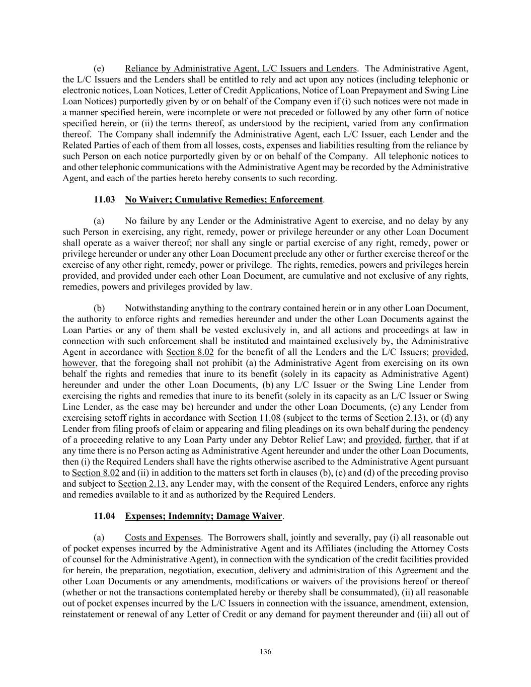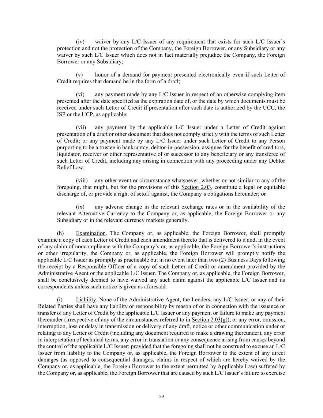 59 (iv) waiver by any L/C Issuer of any requirement that exists for such L/C Issuer’s protection and not the protection of the Company, the Foreign Borrower, or any Subsidiary or any waiver by such L/C Issuer which does not in fact materially prejudice the Company, the Foreign Borrower or any Subsidiary; (v) honor of a demand for payment presented electronically even if such Letter of Credit requires that demand be in the form of a draft; (vi) any payment made by any L/C Issuer in respect of an otherwise complying item presented after the date specified as the expiration date of, or the date by which documents must be received under such Letter of Credit if presentation after such date is authorized by the UCC, the ISP or the UCP, as applicable; (vii) any payment by the applicable L/C Issuer under a Letter of Credit against presentation of a draft or other document that does not comply strictly with the terms of such Letter of Credit; or any payment made by any L/C Issuer under such Letter of Credit to any Person purporting to be a trustee in bankruptcy, debtor-in-possession, assignee for the benefit of creditors, liquidator, receiver or other representative of or successor to any beneficiary or any transferee of such Letter of Credit, including any arising in connection with any proceeding under any Debtor Relief Law; (viii) any other event or circumstance whatsoever, whether or not similar to any of the foregoing, that might, but for the provisions of this Section 2.03, constitute a legal or equitable discharge of, or provide a right of setoff against, the Company’s obligations hereunder; or (ix) any adverse change in the relevant exchange rates or in the availability of the relevant Alternative Currency to the Company or, as applicable, the Foreign Borrower or any Subsidiary or in the relevant currency markets generally. (h) Examination. The Company or, as applicable, the Foreign Borrower, shall promptly examine a copy of each Letter of Credit and each amendment thereto that is delivered to it and, in the event of any claim of noncompliance with the Company’s or, as applicable, the Foreign Borrower’s instructions or other irregularity, the Company or, as applicable, the Foreign Borrower will promptly notify the applicable L/C Issuer as promptly as practicable but in no event later than two (2) Business Days following the receipt by a Responsible Officer of a copy of such Letter of Credit or amendment provided by the Administrative Agent or the applicable L/C Issuer. The Company or, as applicable, the Foreign Borrower, shall be conclusively deemed to have waived any such claim against the applicable L/C Issuer and its correspondents unless such notice is given as aforesaid. (i) Liability. None of the Administrative Agent, the Lenders, any L/C Issuer, or any of their Related Parties shall have any liability or responsibility by reason of or in connection with the issuance or transfer of any Letter of Credit by the applicable L/C Issuer or any payment or failure to make any payment thereunder (irrespective of any of the circumstances referred to in Section 2.03(g)), or any error, omission, interruption, loss or delay in transmission or delivery of any draft, notice or other communication under or relating to any Letter of Credit (including any document required to make a drawing thereunder), any error in interpretation of technical terms, any error in translation or any consequence arising from causes beyond the control of the applicable L/C Issuer; provided that the foregoing shall not be construed to excuse an L/C Issuer from liability to the Company or, as applicable, the Foreign Borrower to the extent of any direct damages (as opposed to consequential damages, claims in respect of which are hereby waived by the Company or, as applicable, the Foreign Borrower to the extent permitted by Applicable Law) suffered by the Company or, as applicable, the Foreign Borrower that are caused by such L/C Issuer’s failure to exercise