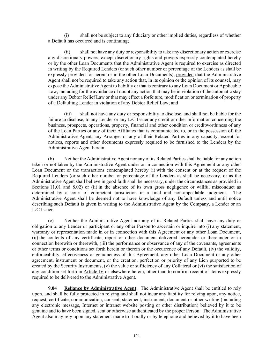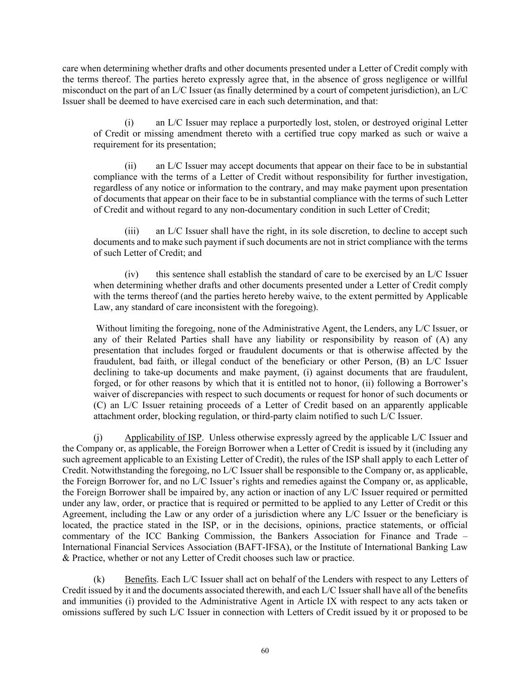 60 care when determining whether drafts and other documents presented under a Letter of Credit comply with the terms thereof. The parties hereto expressly agree that, in the absence of gross negligence or willful misconduct on the part of an L/C Issuer (as finally determined by a court of competent jurisdiction), an L/C Issuer shall be deemed to have exercised care in each such determination, and that: (i) an L/C Issuer may replace a purportedly lost, stolen, or destroyed original Letter of Credit or missing amendment thereto with a certified true copy marked as such or waive a requirement for its presentation; (ii) an L/C Issuer may accept documents that appear on their face to be in substantial compliance with the terms of a Letter of Credit without responsibility for further investigation, regardless of any notice or information to the contrary, and may make payment upon presentation of documents that appear on their face to be in substantial compliance with the terms of such Letter of Credit and without regard to any non-documentary condition in such Letter of Credit; (iii) an L/C Issuer shall have the right, in its sole discretion, to decline to accept such documents and to make such payment if such documents are not in strict compliance with the terms of such Letter of Credit; and (iv) this sentence shall establish the standard of care to be exercised by an L/C Issuer when determining whether drafts and other documents presented under a Letter of Credit comply with the terms thereof (and the parties hereto hereby waive, to the extent permitted by Applicable Law, any standard of care inconsistent with the foregoing). Without limiting the foregoing, none of the Administrative Agent, the Lenders, any L/C Issuer, or any of their Related Parties shall have any liability or responsibility by reason of (A) any presentation that includes forged or fraudulent documents or that is otherwise affected by the fraudulent, bad faith, or illegal conduct of the beneficiary or other Person, (B) an L/C Issuer declining to take-up documents and make payment, (i) against documents that are fraudulent, forged, or for other reasons by which that it is entitled not to honor, (ii) following a Borrower’s waiver of discrepancies with respect to such documents or request for honor of such documents or (C) an L/C Issuer retaining proceeds of a Letter of Credit based on an apparently applicable attachment order, blocking regulation, or third-party claim notified to such L/C Issuer. (j) Applicability of ISP. Unless otherwise expressly agreed by the applicable L/C Issuer and the Company or, as applicable, the Foreign Borrower when a Letter of Credit is issued by it (including any such agreement applicable to an Existing Letter of Credit), the rules of the ISP shall apply to each Letter of Credit. Notwithstanding the foregoing, no L/C Issuer shall be responsible to the Company or, as applicable, the Foreign Borrower for, and no L/C Issuer’s rights and remedies against the Company or, as applicable, the Foreign Borrower shall be impaired by, any action or inaction of any L/C Issuer required or permitted under any law, order, or practice that is required or permitted to be applied to any Letter of Credit or this Agreement, including the Law or any order of a jurisdiction where any L/C Issuer or the beneficiary is located, the practice stated in the ISP, or in the decisions, opinions, practice statements, or official commentary of the ICC Banking Commission, the Bankers Association for Finance and Trade – International Financial Services Association (BAFT-IFSA), or the Institute of International Banking Law & Practice, whether or not any Letter of Credit chooses such law or practice. (k) Benefits. Each L/C Issuer shall act on behalf of the Lenders with respect to any Letters of Credit issued by it and the documents associated therewith, and each L/C Issuer shall have all of the benefits and immunities (i) provided to the Administrative Agent in Article IX with respect to any acts taken or omissions suffered by such L/C Issuer in connection with Letters of Credit issued by it or proposed to be
