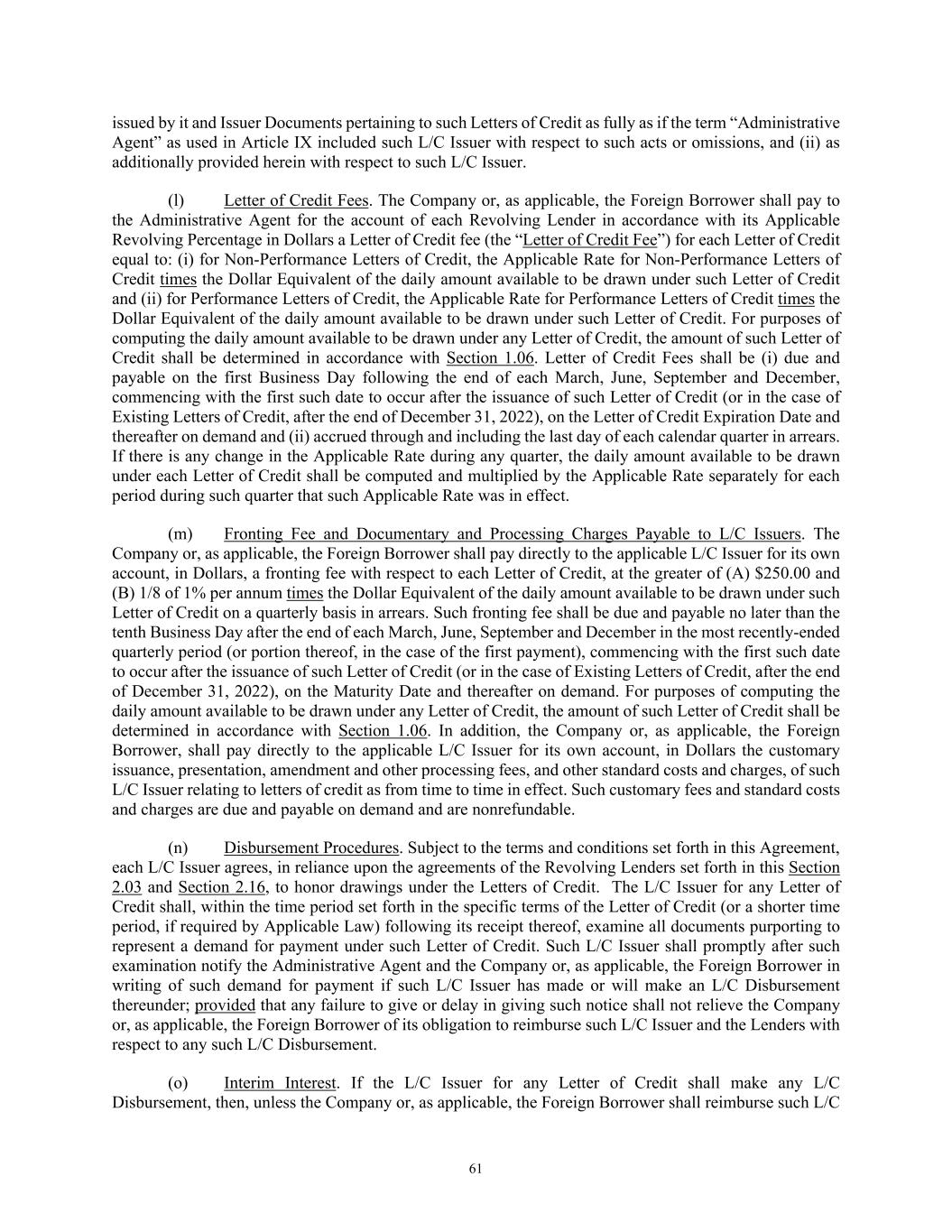 61 issued by it and Issuer Documents pertaining to such Letters of Credit as fully as if the term “Administrative Agent” as used in Article IX included such L/C Issuer with respect to such acts or omissions, and (ii) as additionally provided herein with respect to such L/C Issuer. (l) Letter of Credit Fees. The Company or, as applicable, the Foreign Borrower shall pay to the Administrative Agent for the account of each Revolving Lender in accordance with its Applicable Revolving Percentage in Dollars a Letter of Credit fee (the “Letter of Credit Fee”) for each Letter of Credit equal to: (i) for Non-Performance Letters of Credit, the Applicable Rate for Non-Performance Letters of Credit times the Dollar Equivalent of the daily amount available to be drawn under such Letter of Credit and (ii) for Performance Letters of Credit, the Applicable Rate for Performance Letters of Credit times the Dollar Equivalent of the daily amount available to be drawn under such Letter of Credit. For purposes of computing the daily amount available to be drawn under any Letter of Credit, the amount of such Letter of Credit shall be determined in accordance with Section 1.06. Letter of Credit Fees shall be (i) due and payable on the first Business Day following the end of each March, June, September and December, commencing with the first such date to occur after the issuance of such Letter of Credit (or in the case of Existing Letters of Credit, after the end of December 31, 2022), on the Letter of Credit Expiration Date and thereafter on demand and (ii) accrued through and including the last day of each calendar quarter in arrears. If there is any change in the Applicable Rate during any quarter, the daily amount available to be drawn under each Letter of Credit shall be computed and multiplied by the Applicable Rate separately for each period during such quarter that such Applicable Rate was in effect. (m) Fronting Fee and Documentary and Processing Charges Payable to L/C Issuers. The Company or, as applicable, the Foreign Borrower shall pay directly to the applicable L/C Issuer for its own account, in Dollars, a fronting fee with respect to each Letter of Credit, at the greater of (A) $250.00 and (B) 1/8 of 1% per annum times the Dollar Equivalent of the daily amount available to be drawn under such Letter of Credit on a quarterly basis in arrears. Such fronting fee shall be due and payable no later than the tenth Business Day after the end of each March, June, September and December in the most recently-ended quarterly period (or portion thereof, in the case of the first payment), commencing with the first such date to occur after the issuance of such Letter of Credit (or in the case of Existing Letters of Credit, after the end of December 31, 2022), on the Maturity Date and thereafter on demand. For purposes of computing the daily amount available to be drawn under any Letter of Credit, the amount of such Letter of Credit shall be determined in accordance with Section 1.06. In addition, the Company or, as applicable, the Foreign Borrower, shall pay directly to the applicable L/C Issuer for its own account, in Dollars the customary issuance, presentation, amendment and other processing fees, and other standard costs and charges, of such L/C Issuer relating to letters of credit as from time to time in effect. Such customary fees and standard costs and charges are due and payable on demand and are nonrefundable. (n) Disbursement Procedures. Subject to the terms and conditions set forth in this Agreement, each L/C Issuer agrees, in reliance upon the agreements of the Revolving Lenders set forth in this Section 2.03 and Section 2.16, to honor drawings under the Letters of Credit. The L/C Issuer for any Letter of Credit shall, within the time period set forth in the specific terms of the Letter of Credit (or a shorter time period, if required by Applicable Law) following its receipt thereof, examine all documents purporting to represent a demand for payment under such Letter of Credit. Such L/C Issuer shall promptly after such examination notify the Administrative Agent and the Company or, as applicable, the Foreign Borrower in writing of such demand for payment if such L/C Issuer has made or will make an L/C Disbursement thereunder; provided that any failure to give or delay in giving such notice shall not relieve the Company or, as applicable, the Foreign Borrower of its obligation to reimburse such L/C Issuer and the Lenders with respect to any such L/C Disbursement. (o) Interim Interest. If the L/C Issuer for any Letter of Credit shall make any L/C Disbursement, then, unless the Company or, as applicable, the Foreign Borrower shall reimburse such L/C