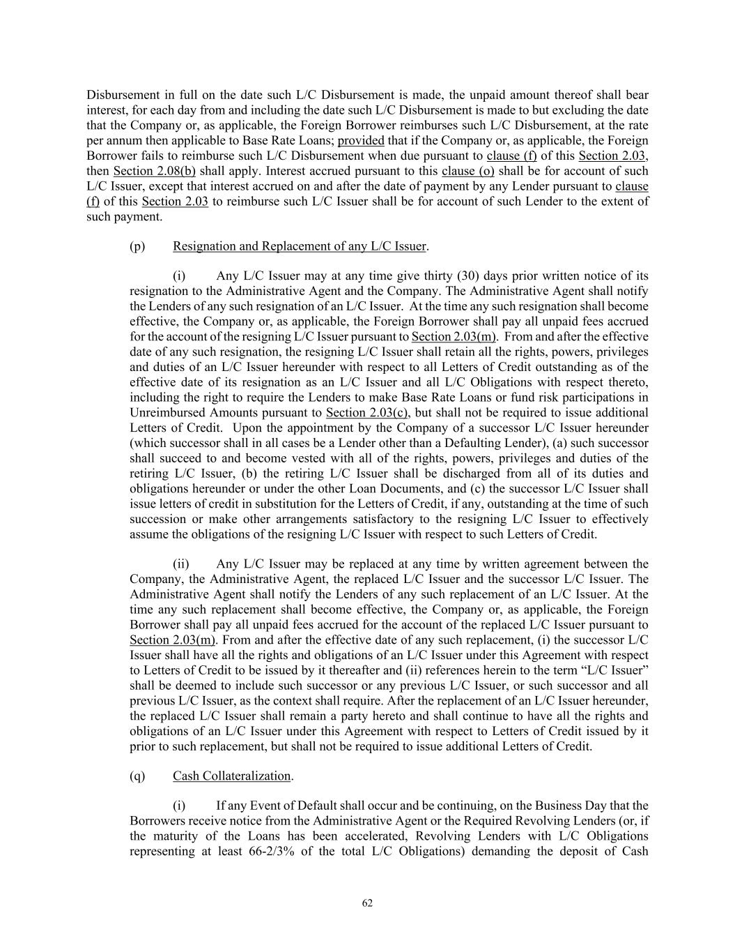 62 Disbursement in full on the date such L/C Disbursement is made, the unpaid amount thereof shall bear interest, for each day from and including the date such L/C Disbursement is made to but excluding the date that the Company or, as applicable, the Foreign Borrower reimburses such L/C Disbursement, at the rate per annum then applicable to Base Rate Loans; provided that if the Company or, as applicable, the Foreign Borrower fails to reimburse such L/C Disbursement when due pursuant to clause (f) of this Section 2.03, then Section 2.08(b) shall apply. Interest accrued pursuant to this clause (o) shall be for account of such L/C Issuer, except that interest accrued on and after the date of payment by any Lender pursuant to clause (f) of this Section 2.03 to reimburse such L/C Issuer shall be for account of such Lender to the extent of such payment. (p) Resignation and Replacement of any L/C Issuer. (i) Any L/C Issuer may at any time give thirty (30) days prior written notice of its resignation to the Administrative Agent and the Company. The Administrative Agent shall notify the Lenders of any such resignation of an L/C Issuer. At the time any such resignation shall become effective, the Company or, as applicable, the Foreign Borrower shall pay all unpaid fees accrued for the account of the resigning L/C Issuer pursuant to Section 2.03(m). From and after the effective date of any such resignation, the resigning L/C Issuer shall retain all the rights, powers, privileges and duties of an L/C Issuer hereunder with respect to all Letters of Credit outstanding as of the effective date of its resignation as an L/C Issuer and all L/C Obligations with respect thereto, including the right to require the Lenders to make Base Rate Loans or fund risk participations in Unreimbursed Amounts pursuant to Section 2.03(c), but shall not be required to issue additional Letters of Credit. Upon the appointment by the Company of a successor L/C Issuer hereunder (which successor shall in all cases be a Lender other than a Defaulting Lender), (a) such successor shall succeed to and become vested with all of the rights, powers, privileges and duties of the retiring L/C Issuer, (b) the retiring L/C Issuer shall be discharged from all of its duties and obligations hereunder or under the other Loan Documents, and (c) the successor L/C Issuer shall issue letters of credit in substitution for the Letters of Credit, if any, outstanding at the time of such succession or make other arrangements satisfactory to the resigning L/C Issuer to effectively assume the obligations of the resigning L/C Issuer with respect to such Letters of Credit. (ii) Any L/C Issuer may be replaced at any time by written agreement between the Company, the Administrative Agent, the replaced L/C Issuer and the successor L/C Issuer. The Administrative Agent shall notify the Lenders of any such replacement of an L/C Issuer. At the time any such replacement shall become effective, the Company or, as applicable, the Foreign Borrower shall pay all unpaid fees accrued for the account of the replaced L/C Issuer pursuant to Section 2.03(m). From and after the effective date of any such replacement, (i) the successor L/C Issuer shall have all the rights and obligations of an L/C Issuer under this Agreement with respect to Letters of Credit to be issued by it thereafter and (ii) references herein to the term “L/C Issuer” shall be deemed to include such successor or any previous L/C Issuer, or such successor and all previous L/C Issuer, as the context shall require. After the replacement of an L/C Issuer hereunder, the replaced L/C Issuer shall remain a party hereto and shall continue to have all the rights and obligations of an L/C Issuer under this Agreement with respect to Letters of Credit issued by it prior to such replacement, but shall not be required to issue additional Letters of Credit. (q) Cash Collateralization. (i) If any Event of Default shall occur and be continuing, on the Business Day that the Borrowers receive notice from the Administrative Agent or the Required Revolving Lenders (or, if the maturity of the Loans has been accelerated, Revolving Lenders with L/C Obligations representing at least 66-2/3% of the total L/C Obligations) demanding the deposit of Cash