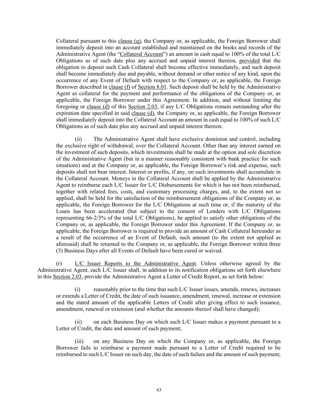 63 Collateral pursuant to this clause (q), the Company or, as applicable, the Foreign Borrower shall immediately deposit into an account established and maintained on the books and records of the Administrative Agent (the “Collateral Account”) an amount in cash equal to 100% of the total L/C Obligations as of such date plus any accrued and unpaid interest thereon, provided that the obligation to deposit such Cash Collateral shall become effective immediately, and such deposit shall become immediately due and payable, without demand or other notice of any kind, upon the occurrence of any Event of Default with respect to the Company or, as applicable, the Foreign Borrower described in clause (f) of Section 8.01. Such deposit shall be held by the Administrative Agent as collateral for the payment and performance of the obligations of the Company or, as applicable, the Foreign Borrower under this Agreement. In addition, and without limiting the foregoing or clause (d) of this Section 2.03, if any L/C Obligations remain outstanding after the expiration date specified in said clause (d), the Company or, as applicable, the Foreign Borrower shall immediately deposit into the Collateral Account an amount in cash equal to 100% of such L/C Obligations as of such date plus any accrued and unpaid interest thereon. (ii) The Administrative Agent shall have exclusive dominion and control, including the exclusive right of withdrawal, over the Collateral Account. Other than any interest earned on the investment of such deposits, which investments shall be made at the option and sole discretion of the Administrative Agent (but in a manner reasonably consistent with bank practice for such situations) and at the Company or, as applicable, the Foreign Borrower’s risk and expense, such deposits shall not bear interest. Interest or profits, if any, on such investments shall accumulate in the Collateral Account. Moneys in the Collateral Account shall be applied by the Administrative Agent to reimburse each L/C Issuer for L/C Disbursements for which it has not been reimbursed, together with related fees, costs, and customary processing charges, and, to the extent not so applied, shall be held for the satisfaction of the reimbursement obligations of the Company or, as applicable, the Foreign Borrower for the L/C Obligations at such time or, if the maturity of the Loans has been accelerated (but subject to the consent of Lenders with L/C Obligations representing 66-2/3% of the total L/C Obligations), be applied to satisfy other obligations of the Company or, as applicable, the Foreign Borrower under this Agreement. If the Company or, as applicable, the Foreign Borrower is required to provide an amount of Cash Collateral hereunder as a result of the occurrence of an Event of Default, such amount (to the extent not applied as aforesaid) shall be returned to the Company or, as applicable, the Foreign Borrower within three (3) Business Days after all Events of Default have been cured or waived. (r) L/C Issuer Reports to the Administrative Agent. Unless otherwise agreed by the Administrative Agent, each L/C Issuer shall, in addition to its notification obligations set forth elsewhere in this Section 2.03, provide the Administrative Agent a Letter of Credit Report, as set forth below: (i) reasonably prior to the time that such L/C Issuer issues, amends, renews, increases or extends a Letter of Credit, the date of such issuance, amendment, renewal, increase or extension and the stated amount of the applicable Letters of Credit after giving effect to such issuance, amendment, renewal or extension (and whether the amounts thereof shall have changed); (ii) on each Business Day on which such L/C Issuer makes a payment pursuant to a Letter of Credit, the date and amount of such payment; (iii) on any Business Day on which the Company or, as applicable, the Foreign Borrower fails to reimburse a payment made pursuant to a Letter of Credit required to be reimbursed to such L/C Issuer on such day, the date of such failure and the amount of such payment;