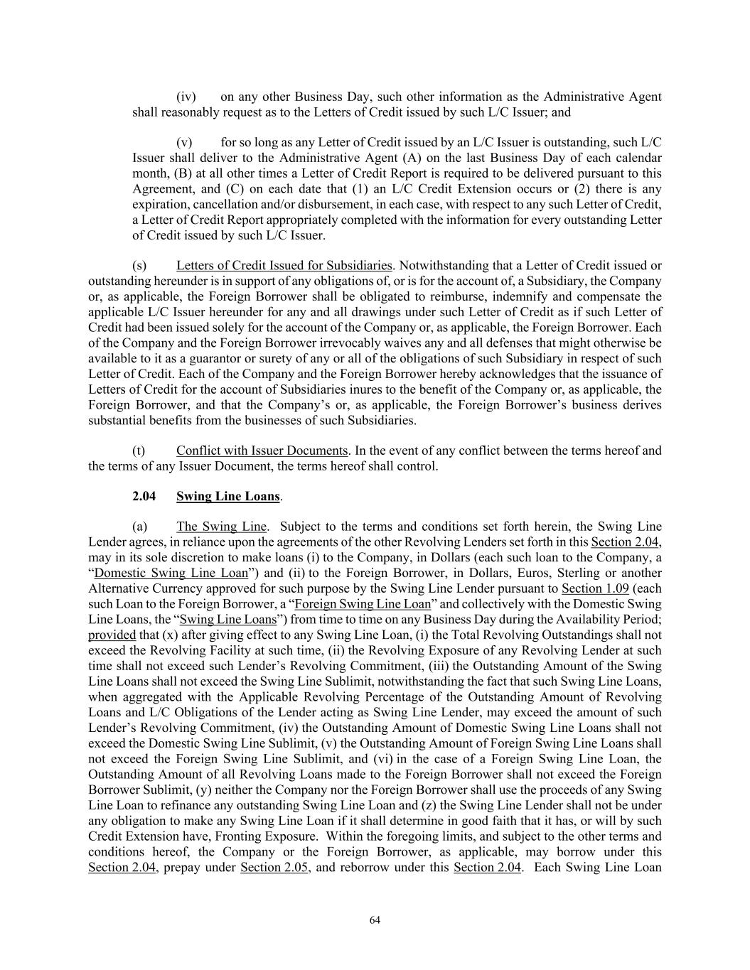 64 (iv) on any other Business Day, such other information as the Administrative Agent shall reasonably request as to the Letters of Credit issued by such L/C Issuer; and (v) for so long as any Letter of Credit issued by an L/C Issuer is outstanding, such L/C Issuer shall deliver to the Administrative Agent (A) on the last Business Day of each calendar month, (B) at all other times a Letter of Credit Report is required to be delivered pursuant to this Agreement, and (C) on each date that (1) an L/C Credit Extension occurs or (2) there is any expiration, cancellation and/or disbursement, in each case, with respect to any such Letter of Credit, a Letter of Credit Report appropriately completed with the information for every outstanding Letter of Credit issued by such L/C Issuer. (s) Letters of Credit Issued for Subsidiaries. Notwithstanding that a Letter of Credit issued or outstanding hereunder is in support of any obligations of, or is for the account of, a Subsidiary, the Company or, as applicable, the Foreign Borrower shall be obligated to reimburse, indemnify and compensate the applicable L/C Issuer hereunder for any and all drawings under such Letter of Credit as if such Letter of Credit had been issued solely for the account of the Company or, as applicable, the Foreign Borrower. Each of the Company and the Foreign Borrower irrevocably waives any and all defenses that might otherwise be available to it as a guarantor or surety of any or all of the obligations of such Subsidiary in respect of such Letter of Credit. Each of the Company and the Foreign Borrower hereby acknowledges that the issuance of Letters of Credit for the account of Subsidiaries inures to the benefit of the Company or, as applicable, the Foreign Borrower, and that the Company’s or, as applicable, the Foreign Borrower’s business derives substantial benefits from the businesses of such Subsidiaries. (t) Conflict with Issuer Documents. In the event of any conflict between the terms hereof and the terms of any Issuer Document, the terms hereof shall control. 2.04 Swing Line Loans. (a) The Swing Line. Subject to the terms and conditions set forth herein, the Swing Line Lender agrees, in reliance upon the agreements of the other Revolving Lenders set forth in this Section 2.04, may in its sole discretion to make loans (i) to the Company, in Dollars (each such loan to the Company, a “Domestic Swing Line Loan”) and (ii) to the Foreign Borrower, in Dollars, Euros, Sterling or another Alternative Currency approved for such purpose by the Swing Line Lender pursuant to Section 1.09 (each such Loan to the Foreign Borrower, a “Foreign Swing Line Loan” and collectively with the Domestic Swing Line Loans, the “Swing Line Loans”) from time to time on any Business Day during the Availability Period; provided that (x) after giving effect to any Swing Line Loan, (i) the Total Revolving Outstandings shall not exceed the Revolving Facility at such time, (ii) the Revolving Exposure of any Revolving Lender at such time shall not exceed such Lender’s Revolving Commitment, (iii) the Outstanding Amount of the Swing Line Loans shall not exceed the Swing Line Sublimit, notwithstanding the fact that such Swing Line Loans, when aggregated with the Applicable Revolving Percentage of the Outstanding Amount of Revolving Loans and L/C Obligations of the Lender acting as Swing Line Lender, may exceed the amount of such Lender’s Revolving Commitment, (iv) the Outstanding Amount of Domestic Swing Line Loans shall not exceed the Domestic Swing Line Sublimit, (v) the Outstanding Amount of Foreign Swing Line Loans shall not exceed the Foreign Swing Line Sublimit, and (vi) in the case of a Foreign Swing Line Loan, the Outstanding Amount of all Revolving Loans made to the Foreign Borrower shall not exceed the Foreign Borrower Sublimit, (y) neither the Company nor the Foreign Borrower shall use the proceeds of any Swing Line Loan to refinance any outstanding Swing Line Loan and (z) the Swing Line Lender shall not be under any obligation to make any Swing Line Loan if it shall determine in good faith that it has, or will by such Credit Extension have, Fronting Exposure. Within the foregoing limits, and subject to the other terms and conditions hereof, the Company or the Foreign Borrower, as applicable, may borrow under this Section 2.04, prepay under Section 2.05, and reborrow under this Section 2.04. Each Swing Line Loan