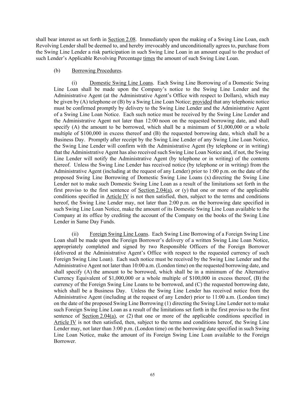 65 shall bear interest as set forth in Section 2.08. Immediately upon the making of a Swing Line Loan, each Revolving Lender shall be deemed to, and hereby irrevocably and unconditionally agrees to, purchase from the Swing Line Lender a risk participation in such Swing Line Loan in an amount equal to the product of such Lender’s Applicable Revolving Percentage times the amount of such Swing Line Loan. (b) Borrowing Procedures. (i) Domestic Swing Line Loans. Each Swing Line Borrowing of a Domestic Swing Line Loan shall be made upon the Company’s notice to the Swing Line Lender and the Administrative Agent (at the Administrative Agent’s Office with respect to Dollars), which may be given by (A) telephone or (B) by a Swing Line Loan Notice; provided that any telephonic notice must be confirmed promptly by delivery to the Swing Line Lender and the Administrative Agent of a Swing Line Loan Notice. Each such notice must be received by the Swing Line Lender and the Administrative Agent not later than 12:00 noon on the requested borrowing date, and shall specify (A) the amount to be borrowed, which shall be a minimum of $1,000,000 or a whole multiple of $100,000 in excess thereof and (B) the requested borrowing date, which shall be a Business Day. Promptly after receipt by the Swing Line Lender of any Swing Line Loan Notice, the Swing Line Lender will confirm with the Administrative Agent (by telephone or in writing) that the Administrative Agent has also received such Swing Line Loan Notice and, if not, the Swing Line Lender will notify the Administrative Agent (by telephone or in writing) of the contents thereof. Unless the Swing Line Lender has received notice (by telephone or in writing) from the Administrative Agent (including at the request of any Lender) prior to 1:00 p.m. on the date of the proposed Swing Line Borrowing of Domestic Swing Line Loans (x) directing the Swing Line Lender not to make such Domestic Swing Line Loan as a result of the limitations set forth in the first proviso to the first sentence of Section 2.04(a), or (y) that one or more of the applicable conditions specified in Article IV is not then satisfied, then, subject to the terms and conditions hereof, the Swing Line Lender may, not later than 2:00 p.m. on the borrowing date specified in such Swing Line Loan Notice, make the amount of its Domestic Swing Line Loan available to the Company at its office by crediting the account of the Company on the books of the Swing Line Lender in Same Day Funds. (ii) Foreign Swing Line Loans. Each Swing Line Borrowing of a Foreign Swing Line Loan shall be made upon the Foreign Borrower’s delivery of a written Swing Line Loan Notice, appropriately completed and signed by two Responsible Officers of the Foreign Borrower (delivered at the Administrative Agent’s Office with respect to the requested currency of such Foreign Swing Line Loan). Each such notice must be received by the Swing Line Lender and the Administrative Agent not later than 10:00 a.m. (London time) on the requested borrowing date, and shall specify (A) the amount to be borrowed, which shall be in a minimum of the Alternative Currency Equivalent of $1,000,000 or a whole multiple of $100,000 in excess thereof, (B) the currency of the Foreign Swing Line Loans to be borrowed, and (C) the requested borrowing date, which shall be a Business Day. Unless the Swing Line Lender has received notice from the Administrative Agent (including at the request of any Lender) prior to 11:00 a.m. (London time) on the date of the proposed Swing Line Borrowing (1) directing the Swing Line Lender not to make such Foreign Swing Line Loan as a result of the limitations set forth in the first proviso to the first sentence of Section 2.04(a), or (2) that one or more of the applicable conditions specified in Article IV is not then satisfied, then, subject to the terms and conditions hereof, the Swing Line Lender may, not later than 3:00 p.m. (London time) on the borrowing date specified in such Swing Line Loan Notice, make the amount of its Foreign Swing Line Loan available to the Foreign Borrower.
