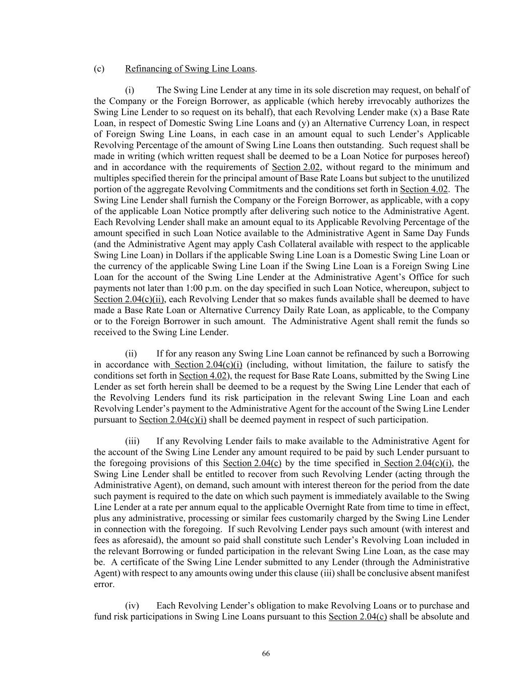 66 (c) Refinancing of Swing Line Loans. (i) The Swing Line Lender at any time in its sole discretion may request, on behalf of the Company or the Foreign Borrower, as applicable (which hereby irrevocably authorizes the Swing Line Lender to so request on its behalf), that each Revolving Lender make (x) a Base Rate Loan, in respect of Domestic Swing Line Loans and (y) an Alternative Currency Loan, in respect of Foreign Swing Line Loans, in each case in an amount equal to such Lender’s Applicable Revolving Percentage of the amount of Swing Line Loans then outstanding. Such request shall be made in writing (which written request shall be deemed to be a Loan Notice for purposes hereof) and in accordance with the requirements of Section 2.02, without regard to the minimum and multiples specified therein for the principal amount of Base Rate Loans but subject to the unutilized portion of the aggregate Revolving Commitments and the conditions set forth in Section 4.02. The Swing Line Lender shall furnish the Company or the Foreign Borrower, as applicable, with a copy of the applicable Loan Notice promptly after delivering such notice to the Administrative Agent. Each Revolving Lender shall make an amount equal to its Applicable Revolving Percentage of the amount specified in such Loan Notice available to the Administrative Agent in Same Day Funds (and the Administrative Agent may apply Cash Collateral available with respect to the applicable Swing Line Loan) in Dollars if the applicable Swing Line Loan is a Domestic Swing Line Loan or the currency of the applicable Swing Line Loan if the Swing Line Loan is a Foreign Swing Line Loan for the account of the Swing Line Lender at the Administrative Agent’s Office for such payments not later than 1:00 p.m. on the day specified in such Loan Notice, whereupon, subject to Section 2.04(c)(ii), each Revolving Lender that so makes funds available shall be deemed to have made a Base Rate Loan or Alternative Currency Daily Rate Loan, as applicable, to the Company or to the Foreign Borrower in such amount. The Administrative Agent shall remit the funds so received to the Swing Line Lender. (ii) If for any reason any Swing Line Loan cannot be refinanced by such a Borrowing in accordance with Section 2.04(c)(i) (including, without limitation, the failure to satisfy the conditions set forth in Section 4.02), the request for Base Rate Loans, submitted by the Swing Line Lender as set forth herein shall be deemed to be a request by the Swing Line Lender that each of the Revolving Lenders fund its risk participation in the relevant Swing Line Loan and each Revolving Lender’s payment to the Administrative Agent for the account of the Swing Line Lender pursuant to Section 2.04(c)(i) shall be deemed payment in respect of such participation. (iii) If any Revolving Lender fails to make available to the Administrative Agent for the account of the Swing Line Lender any amount required to be paid by such Lender pursuant to the foregoing provisions of this Section 2.04(c) by the time specified in Section 2.04(c)(i), the Swing Line Lender shall be entitled to recover from such Revolving Lender (acting through the Administrative Agent), on demand, such amount with interest thereon for the period from the date such payment is required to the date on which such payment is immediately available to the Swing Line Lender at a rate per annum equal to the applicable Overnight Rate from time to time in effect, plus any administrative, processing or similar fees customarily charged by the Swing Line Lender in connection with the foregoing. If such Revolving Lender pays such amount (with interest and fees as aforesaid), the amount so paid shall constitute such Lender’s Revolving Loan included in the relevant Borrowing or funded participation in the relevant Swing Line Loan, as the case may be. A certificate of the Swing Line Lender submitted to any Lender (through the Administrative Agent) with respect to any amounts owing under this clause (iii) shall be conclusive absent manifest error. (iv) Each Revolving Lender’s obligation to make Revolving Loans or to purchase and fund risk participations in Swing Line Loans pursuant to this Section 2.04(c) shall be absolute and