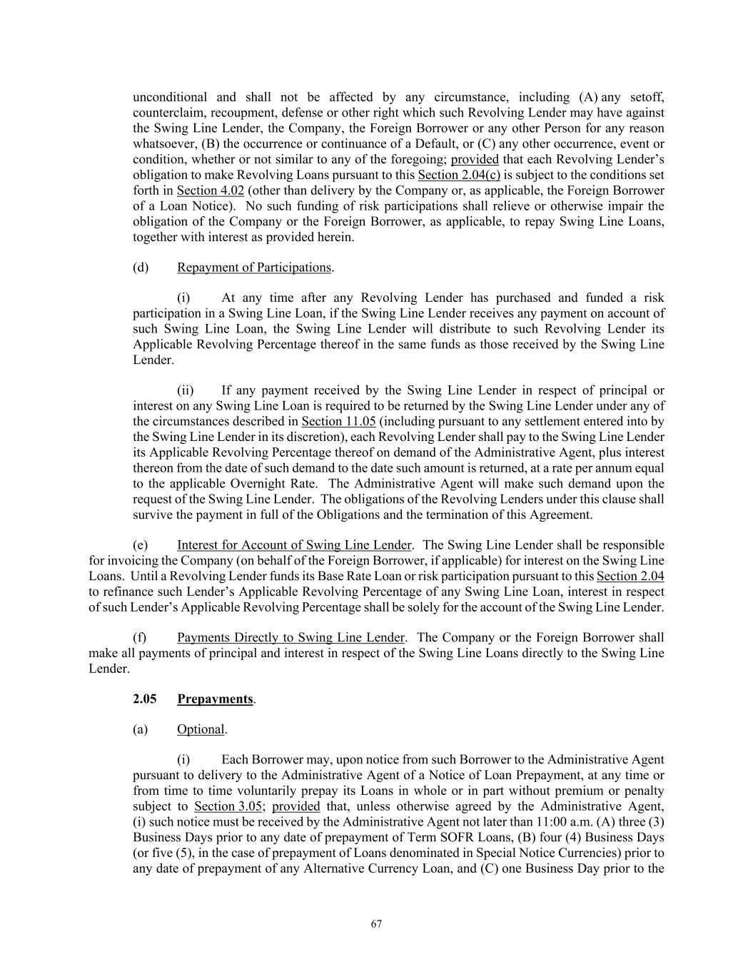 67 unconditional and shall not be affected by any circumstance, including (A) any setoff, counterclaim, recoupment, defense or other right which such Revolving Lender may have against the Swing Line Lender, the Company, the Foreign Borrower or any other Person for any reason whatsoever, (B) the occurrence or continuance of a Default, or (C) any other occurrence, event or condition, whether or not similar to any of the foregoing; provided that each Revolving Lender’s obligation to make Revolving Loans pursuant to this Section 2.04(c) is subject to the conditions set forth in Section 4.02 (other than delivery by the Company or, as applicable, the Foreign Borrower of a Loan Notice). No such funding of risk participations shall relieve or otherwise impair the obligation of the Company or the Foreign Borrower, as applicable, to repay Swing Line Loans, together with interest as provided herein. (d) Repayment of Participations. (i) At any time after any Revolving Lender has purchased and funded a risk participation in a Swing Line Loan, if the Swing Line Lender receives any payment on account of such Swing Line Loan, the Swing Line Lender will distribute to such Revolving Lender its Applicable Revolving Percentage thereof in the same funds as those received by the Swing Line Lender. (ii) If any payment received by the Swing Line Lender in respect of principal or interest on any Swing Line Loan is required to be returned by the Swing Line Lender under any of the circumstances described in Section 11.05 (including pursuant to any settlement entered into by the Swing Line Lender in its discretion), each Revolving Lender shall pay to the Swing Line Lender its Applicable Revolving Percentage thereof on demand of the Administrative Agent, plus interest thereon from the date of such demand to the date such amount is returned, at a rate per annum equal to the applicable Overnight Rate. The Administrative Agent will make such demand upon the request of the Swing Line Lender. The obligations of the Revolving Lenders under this clause shall survive the payment in full of the Obligations and the termination of this Agreement. (e) Interest for Account of Swing Line Lender. The Swing Line Lender shall be responsible for invoicing the Company (on behalf of the Foreign Borrower, if applicable) for interest on the Swing Line Loans. Until a Revolving Lender funds its Base Rate Loan or risk participation pursuant to this Section 2.04 to refinance such Lender’s Applicable Revolving Percentage of any Swing Line Loan, interest in respect of such Lender’s Applicable Revolving Percentage shall be solely for the account of the Swing Line Lender. (f) Payments Directly to Swing Line Lender. The Company or the Foreign Borrower shall make all payments of principal and interest in respect of the Swing Line Loans directly to the Swing Line Lender. 2.05 Prepayments. (a) Optional. (i) Each Borrower may, upon notice from such Borrower to the Administrative Agent pursuant to delivery to the Administrative Agent of a Notice of Loan Prepayment, at any time or from time to time voluntarily prepay its Loans in whole or in part without premium or penalty subject to Section 3.05; provided that, unless otherwise agreed by the Administrative Agent, (i) such notice must be received by the Administrative Agent not later than 11:00 a.m. (A) three (3) Business Days prior to any date of prepayment of Term SOFR Loans, (B) four (4) Business Days (or five (5), in the case of prepayment of Loans denominated in Special Notice Currencies) prior to any date of prepayment of any Alternative Currency Loan, and (C) one Business Day prior to the