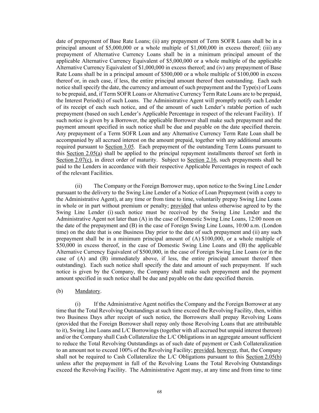 68 date of prepayment of Base Rate Loans; (ii) any prepayment of Term SOFR Loans shall be in a principal amount of $5,000,000 or a whole multiple of $1,000,000 in excess thereof; (iii) any prepayment of Alternative Currency Loans shall be in a minimum principal amount of the applicable Alternative Currency Equivalent of $5,000,000 or a whole multiple of the applicable Alternative Currency Equivalent of $1,000,000 in excess thereof; and (iv) any prepayment of Base Rate Loans shall be in a principal amount of $500,000 or a whole multiple of $100,000 in excess thereof or, in each case, if less, the entire principal amount thereof then outstanding. Each such notice shall specify the date, the currency and amount of such prepayment and the Type(s) of Loans to be prepaid, and, if Term SOFR Loans or Alternative Currency Term Rate Loans are to be prepaid, the Interest Period(s) of such Loans. The Administrative Agent will promptly notify each Lender of its receipt of each such notice, and of the amount of such Lender’s ratable portion of such prepayment (based on such Lender’s Applicable Percentage in respect of the relevant Facility). If such notice is given by a Borrower, the applicable Borrower shall make such prepayment and the payment amount specified in such notice shall be due and payable on the date specified therein. Any prepayment of a Term SOFR Loan and any Alternative Currency Term Rate Loan shall be accompanied by all accrued interest on the amount prepaid, together with any additional amounts required pursuant to Section 3.05. Each prepayment of the outstanding Term Loans pursuant to this Section 2.05(a) shall be applied to the principal repayment installments thereof set forth in Section 2.07(c), in direct order of maturity. Subject to Section 2.16, such prepayments shall be paid to the Lenders in accordance with their respective Applicable Percentages in respect of each of the relevant Facilities. (ii) The Company or the Foreign Borrower may, upon notice to the Swing Line Lender pursuant to the delivery to the Swing Line Lender of a Notice of Loan Prepayment (with a copy to the Administrative Agent), at any time or from time to time, voluntarily prepay Swing Line Loans in whole or in part without premium or penalty; provided that unless otherwise agreed to by the Swing Line Lender (i) such notice must be received by the Swing Line Lender and the Administrative Agent not later than (A) in the case of Domestic Swing Line Loans, 12:00 noon on the date of the prepayment and (B) in the case of Foreign Swing Line Loans, 10:00 a.m. (London time) on the date that is one Business Day prior to the date of such prepayment and (ii) any such prepayment shall be in a minimum principal amount of (A) $100,000, or a whole multiple of $50,000 in excess thereof, in the case of Domestic Swing Line Loans and (B) the applicable Alternative Currency Equivalent of $500,000, in the case of Foreign Swing Line Loans (or in the case of (A) and (B) immediately above, if less, the entire principal amount thereof then outstanding). Each such notice shall specify the date and amount of such prepayment. If such notice is given by the Company, the Company shall make such prepayment and the payment amount specified in such notice shall be due and payable on the date specified therein. (b) Mandatory. (i) If the Administrative Agent notifies the Company and the Foreign Borrower at any time that the Total Revolving Outstandings at such time exceed the Revolving Facility, then, within two Business Days after receipt of such notice, the Borrowers shall prepay Revolving Loans (provided that the Foreign Borrower shall repay only those Revolving Loans that are attributable to it), Swing Line Loans and L/C Borrowings (together with all accrued but unpaid interest thereon) and/or the Company shall Cash Collateralize the L/C Obligations in an aggregate amount sufficient to reduce the Total Revolving Outstandings as of such date of payment or Cash Collateralization to an amount not to exceed 100% of the Revolving Facility; provided, however, that, the Company shall not be required to Cash Collateralize the L/C Obligations pursuant to this Section 2.05(b) unless after the prepayment in full of the Revolving Loans the Total Revolving Outstandings exceed the Revolving Facility. The Administrative Agent may, at any time and from time to time