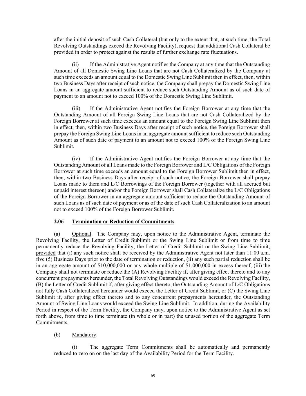 69 after the initial deposit of such Cash Collateral (but only to the extent that, at such time, the Total Revolving Outstandings exceed the Revolving Facility), request that additional Cash Collateral be provided in order to protect against the results of further exchange rate fluctuations. (ii) If the Administrative Agent notifies the Company at any time that the Outstanding Amount of all Domestic Swing Line Loans that are not Cash Collateralized by the Company at such time exceeds an amount equal to the Domestic Swing Line Sublimit then in effect, then, within two Business Days after receipt of such notice, the Company shall prepay the Domestic Swing Line Loans in an aggregate amount sufficient to reduce such Outstanding Amount as of such date of payment to an amount not to exceed 100% of the Domestic Swing Line Sublimit. (iii) If the Administrative Agent notifies the Foreign Borrower at any time that the Outstanding Amount of all Foreign Swing Line Loans that are not Cash Collateralized by the Foreign Borrower at such time exceeds an amount equal to the Foreign Swing Line Sublimit then in effect, then, within two Business Days after receipt of such notice, the Foreign Borrower shall prepay the Foreign Swing Line Loans in an aggregate amount sufficient to reduce such Outstanding Amount as of such date of payment to an amount not to exceed 100% of the Foreign Swing Line Sublimit. (iv) If the Administrative Agent notifies the Foreign Borrower at any time that the Outstanding Amount of all Loans made to the Foreign Borrower and L/C Obligations of the Foreign Borrower at such time exceeds an amount equal to the Foreign Borrower Sublimit then in effect, then, within two Business Days after receipt of such notice, the Foreign Borrower shall prepay Loans made to them and L/C Borrowings of the Foreign Borrower (together with all accrued but unpaid interest thereon) and/or the Foreign Borrower shall Cash Collateralize the L/C Obligations of the Foreign Borrower in an aggregate amount sufficient to reduce the Outstanding Amount of such Loans as of such date of payment or as of the date of such Cash Collateralization to an amount not to exceed 100% of the Foreign Borrower Sublimit. 2.06 Termination or Reduction of Commitments. (a) Optional. The Company may, upon notice to the Administrative Agent, terminate the Revolving Facility, the Letter of Credit Sublimit or the Swing Line Sublimit or from time to time permanently reduce the Revolving Facility, the Letter of Credit Sublimit or the Swing Line Sublimit; provided that (i) any such notice shall be received by the Administrative Agent not later than 11:00 a.m. five (5) Business Days prior to the date of termination or reduction, (ii) any such partial reduction shall be in an aggregate amount of $10,000,000 or any whole multiple of $1,000,000 in excess thereof, (iii) the Company shall not terminate or reduce the (A) Revolving Facility if, after giving effect thereto and to any concurrent prepayments hereunder, the Total Revolving Outstandings would exceed the Revolving Facility, (B) the Letter of Credit Sublimit if, after giving effect thereto, the Outstanding Amount of L/C Obligations not fully Cash Collateralized hereunder would exceed the Letter of Credit Sublimit, or (C) the Swing Line Sublimit if, after giving effect thereto and to any concurrent prepayments hereunder, the Outstanding Amount of Swing Line Loans would exceed the Swing Line Sublimit. In addition, during the Availability Period in respect of the Term Facility, the Company may, upon notice to the Administrative Agent as set forth above, from time to time terminate (in whole or in part) the unused portion of the aggregate Term Commitments. (b) Mandatory. (i) The aggregate Term Commitments shall be automatically and permanently reduced to zero on on the last day of the Availability Period for the Term Facility.