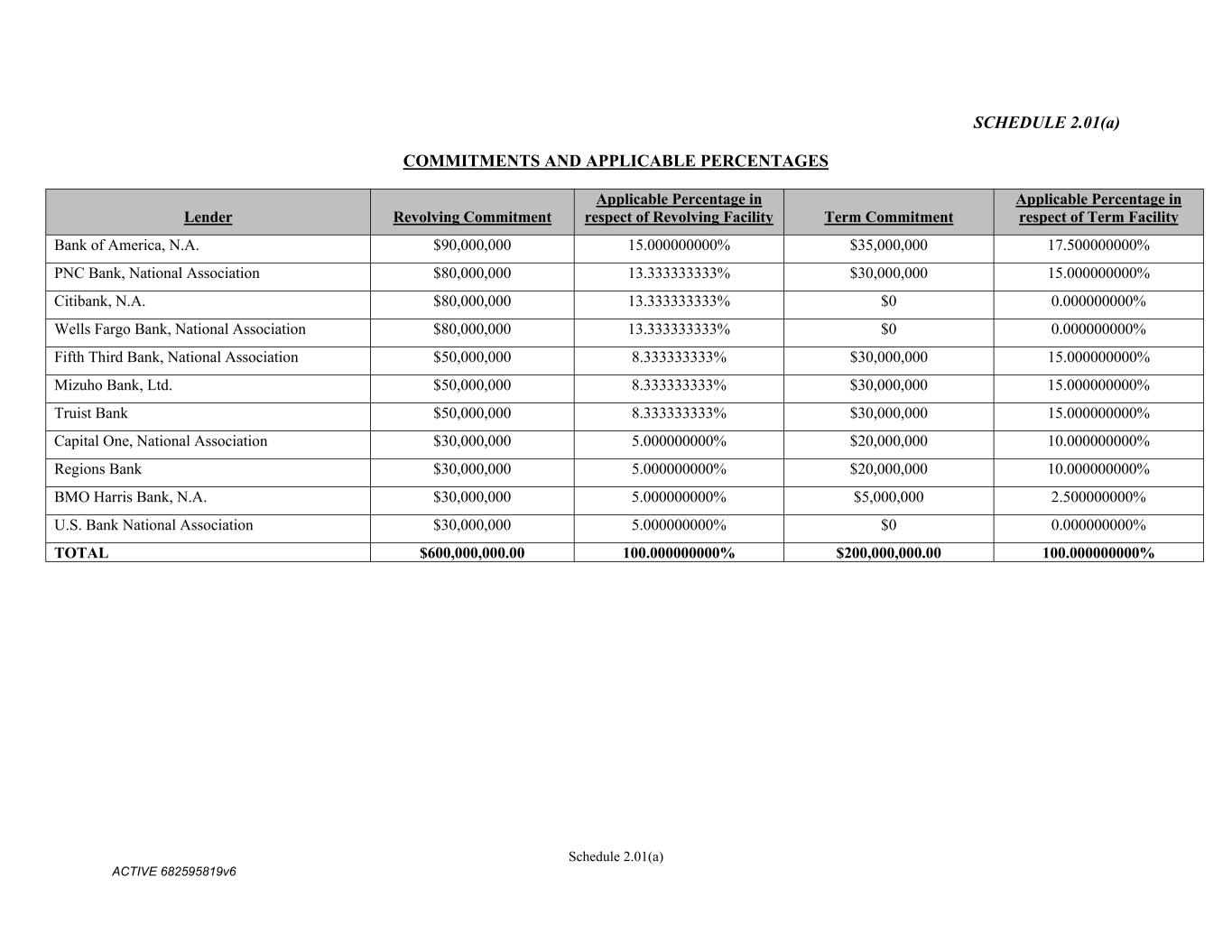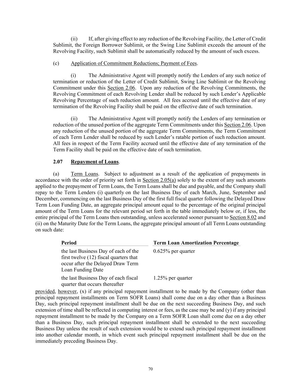 70 (ii) If, after giving effect to any reduction of the Revolving Facility, the Letter of Credit Sublimit, the Foreign Borrower Sublimit, or the Swing Line Sublimit exceeds the amount of the Revolving Facility, such Sublimit shall be automatically reduced by the amount of such excess. (c) Application of Commitment Reductions; Payment of Fees. (i) The Administrative Agent will promptly notify the Lenders of any such notice of termination or reduction of the Letter of Credit Sublimit, Swing Line Sublimit or the Revolving Commitment under this Section 2.06. Upon any reduction of the Revolving Commitments, the Revolving Commitment of each Revolving Lender shall be reduced by such Lender’s Applicable Revolving Percentage of such reduction amount. All fees accrued until the effective date of any termination of the Revolving Facility shall be paid on the effective date of such termination. (ii) The Administrative Agent will promptly notify the Lenders of any termination or reduction of the unused portion of the aggregate Term Commitments under this Section 2.06. Upon any reduction of the unused portion of the aggregate Term Commitments, the Term Commitment of each Term Lender shall be reduced by such Lender’s ratable portion of such reduction amount. All fees in respect of the Term Facility accrued until the effective date of any termination of the Term Facility shall be paid on the effective date of such termination. 2.07 Repayment of Loans. (a) Term Loans. Subject to adjustment as a result of the application of prepayments in accordance with the order of priority set forth in Section 2.05(a) solely to the extent of any such amounts applied to the prepayment of Term Loans, the Term Loans shall be due and payable, and the Company shall repay to the Term Lenders (i) quarterly on the last Business Day of each March, June, September and December, commencing on the last Business Day of the first full fiscal quarter following the Delayed Draw Term Loan Funding Date, an aggregate principal amount equal to the percentage of the original principal amount of the Term Loans for the relevant period set forth in the table immediately below or, if less, the entire principal of the Term Loans then outstanding, unless accelerated sooner pursuant to Section 8.02 and (ii) on the Maturity Date for the Term Loans, the aggregate principal amount of all Term Loans outstanding on such date: Period Term Loan Amortization Percentage the last Business Day of each of the first twelve (12) fiscal quarters that occur after the Delayed Draw Term Loan Funding Date 0.625% per quarter the last Business Day of each fiscal quarter that occurs thereafter 1.25% per quarter provided, however, (x) if any principal repayment installment to be made by the Company (other than principal repayment installments on Term SOFR Loans) shall come due on a day other than a Business Day, such principal repayment installment shall be due on the next succeeding Business Day, and such extension of time shall be reflected in computing interest or fees, as the case may be and (y) if any principal repayment installment to be made by the Company on a Term SOFR Loan shall come due on a day other than a Business Day, such principal repayment installment shall be extended to the next succeeding Business Day unless the result of such extension would be to extend such principal repayment installment into another calendar month, in which event such principal repayment installment shall be due on the immediately preceding Business Day.