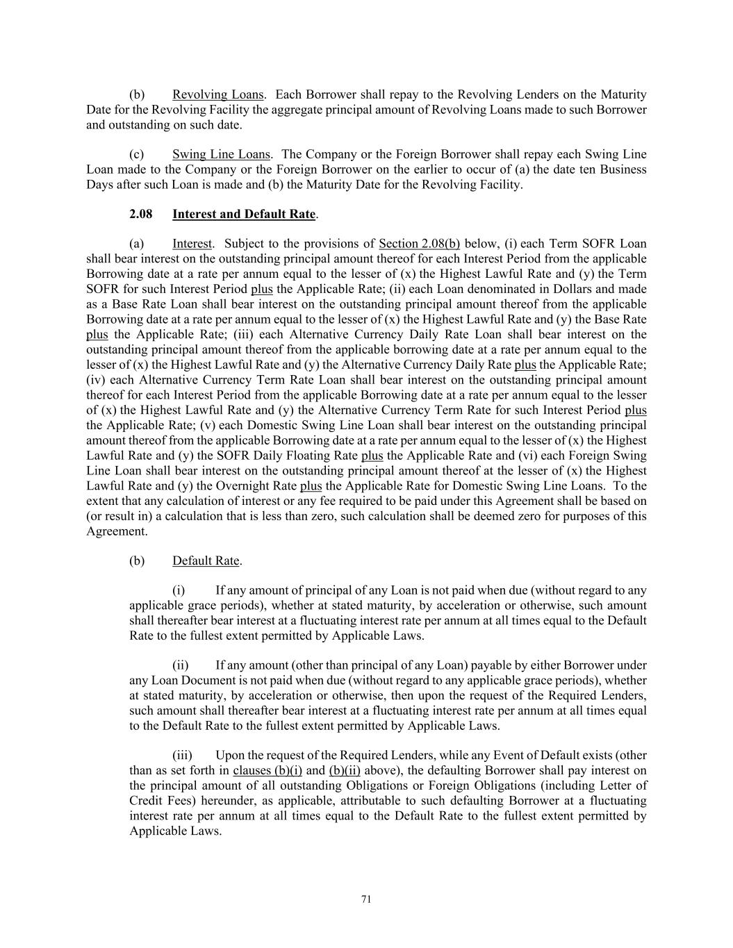 71 (b) Revolving Loans. Each Borrower shall repay to the Revolving Lenders on the Maturity Date for the Revolving Facility the aggregate principal amount of Revolving Loans made to such Borrower and outstanding on such date. (c) Swing Line Loans. The Company or the Foreign Borrower shall repay each Swing Line Loan made to the Company or the Foreign Borrower on the earlier to occur of (a) the date ten Business Days after such Loan is made and (b) the Maturity Date for the Revolving Facility. 2.08 Interest and Default Rate. (a) Interest. Subject to the provisions of Section 2.08(b) below, (i) each Term SOFR Loan shall bear interest on the outstanding principal amount thereof for each Interest Period from the applicable Borrowing date at a rate per annum equal to the lesser of (x) the Highest Lawful Rate and (y) the Term SOFR for such Interest Period plus the Applicable Rate; (ii) each Loan denominated in Dollars and made as a Base Rate Loan shall bear interest on the outstanding principal amount thereof from the applicable Borrowing date at a rate per annum equal to the lesser of (x) the Highest Lawful Rate and (y) the Base Rate plus the Applicable Rate; (iii) each Alternative Currency Daily Rate Loan shall bear interest on the outstanding principal amount thereof from the applicable borrowing date at a rate per annum equal to the lesser of (x) the Highest Lawful Rate and (y) the Alternative Currency Daily Rate plus the Applicable Rate; (iv) each Alternative Currency Term Rate Loan shall bear interest on the outstanding principal amount thereof for each Interest Period from the applicable Borrowing date at a rate per annum equal to the lesser of (x) the Highest Lawful Rate and (y) the Alternative Currency Term Rate for such Interest Period plus the Applicable Rate; (v) each Domestic Swing Line Loan shall bear interest on the outstanding principal amount thereof from the applicable Borrowing date at a rate per annum equal to the lesser of (x) the Highest Lawful Rate and (y) the SOFR Daily Floating Rate plus the Applicable Rate and (vi) each Foreign Swing Line Loan shall bear interest on the outstanding principal amount thereof at the lesser of (x) the Highest Lawful Rate and (y) the Overnight Rate plus the Applicable Rate for Domestic Swing Line Loans. To the extent that any calculation of interest or any fee required to be paid under this Agreement shall be based on (or result in) a calculation that is less than zero, such calculation shall be deemed zero for purposes of this Agreement. (b) Default Rate. (i) If any amount of principal of any Loan is not paid when due (without regard to any applicable grace periods), whether at stated maturity, by acceleration or otherwise, such amount shall thereafter bear interest at a fluctuating interest rate per annum at all times equal to the Default Rate to the fullest extent permitted by Applicable Laws. (ii) If any amount (other than principal of any Loan) payable by either Borrower under any Loan Document is not paid when due (without regard to any applicable grace periods), whether at stated maturity, by acceleration or otherwise, then upon the request of the Required Lenders, such amount shall thereafter bear interest at a fluctuating interest rate per annum at all times equal to the Default Rate to the fullest extent permitted by Applicable Laws. (iii) Upon the request of the Required Lenders, while any Event of Default exists (other than as set forth in clauses (b)(i) and (b)(ii) above), the defaulting Borrower shall pay interest on the principal amount of all outstanding Obligations or Foreign Obligations (including Letter of Credit Fees) hereunder, as applicable, attributable to such defaulting Borrower at a fluctuating interest rate per annum at all times equal to the Default Rate to the fullest extent permitted by Applicable Laws.