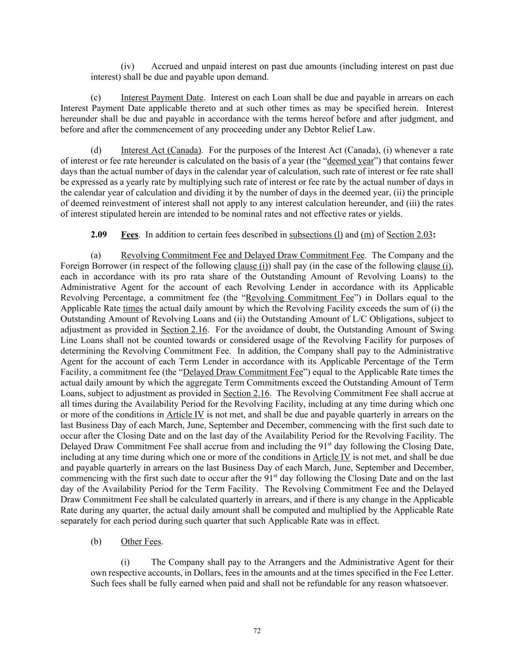 72 (iv) Accrued and unpaid interest on past due amounts (including interest on past due interest) shall be due and payable upon demand. (c) Interest Payment Date. Interest on each Loan shall be due and payable in arrears on each Interest Payment Date applicable thereto and at such other times as may be specified herein. Interest hereunder shall be due and payable in accordance with the terms hereof before and after judgment, and before and after the commencement of any proceeding under any Debtor Relief Law. (d) Interest Act (Canada). For the purposes of the Interest Act (Canada), (i) whenever a rate of interest or fee rate hereunder is calculated on the basis of a year (the “deemed year”) that contains fewer days than the actual number of days in the calendar year of calculation, such rate of interest or fee rate shall be expressed as a yearly rate by multiplying such rate of interest or fee rate by the actual number of days in the calendar year of calculation and dividing it by the number of days in the deemed year, (ii) the principle of deemed reinvestment of interest shall not apply to any interest calculation hereunder, and (iii) the rates of interest stipulated herein are intended to be nominal rates and not effective rates or yields. 2.09 Fees. In addition to certain fees described in subsections (l) and (m) of Section 2.03: (a) Revolving Commitment Fee and Delayed Draw Commitment Fee. The Company and the Foreign Borrower (in respect of the following clause (i)) shall pay (in the case of the following clause (i), each in accordance with its pro rata share of the Outstanding Amount of Revolving Loans) to the Administrative Agent for the account of each Revolving Lender in accordance with its Applicable Revolving Percentage, a commitment fee (the “Revolving Commitment Fee”) in Dollars equal to the Applicable Rate times the actual daily amount by which the Revolving Facility exceeds the sum of (i) the Outstanding Amount of Revolving Loans and (ii) the Outstanding Amount of L/C Obligations, subject to adjustment as provided in Section 2.16. For the avoidance of doubt, the Outstanding Amount of Swing Line Loans shall not be counted towards or considered usage of the Revolving Facility for purposes of determining the Revolving Commitment Fee. In addition, the Company shall pay to the Administrative Agent for the account of each Term Lender in accordance with its Applicable Percentage of the Term Facility, a commitment fee (the “Delayed Draw Commitment Fee”) equal to the Applicable Rate times the actual daily amount by which the aggregate Term Commitments exceed the Outstanding Amount of Term Loans, subject to adjustment as provided in Section 2.16. The Revolving Commitment Fee shall accrue at all times during the Availability Period for the Revolving Facility, including at any time during which one or more of the conditions in Article IV is not met, and shall be due and payable quarterly in arrears on the last Business Day of each March, June, September and December, commencing with the first such date to occur after the Closing Date and on the last day of the Availability Period for the Revolving Facility. The Delayed Draw Commitment Fee shall accrue from and including the 91st day following the Closing Date, including at any time during which one or more of the conditions in Article IV is not met, and shall be due and payable quarterly in arrears on the last Business Day of each March, June, September and December, commencing with the first such date to occur after the 91st day following the Closing Date and on the last day of the Availability Period for the Term Facility. The Revolving Commitment Fee and the Delayed Draw Commitment Fee shall be calculated quarterly in arrears, and if there is any change in the Applicable Rate during any quarter, the actual daily amount shall be computed and multiplied by the Applicable Rate separately for each period during such quarter that such Applicable Rate was in effect. (b) Other Fees. (i) The Company shall pay to the Arrangers and the Administrative Agent for their own respective accounts, in Dollars, fees in the amounts and at the times specified in the Fee Letter. Such fees shall be fully earned when paid and shall not be refundable for any reason whatsoever.