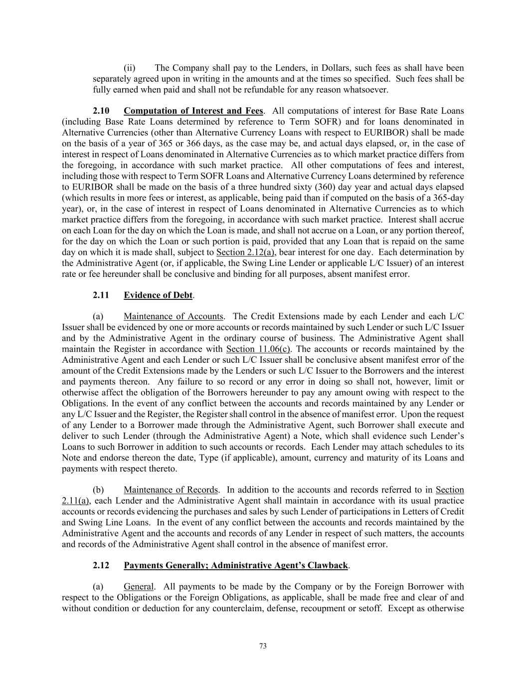 73 (ii) The Company shall pay to the Lenders, in Dollars, such fees as shall have been separately agreed upon in writing in the amounts and at the times so specified. Such fees shall be fully earned when paid and shall not be refundable for any reason whatsoever. 2.10 Computation of Interest and Fees. All computations of interest for Base Rate Loans (including Base Rate Loans determined by reference to Term SOFR) and for loans denominated in Alternative Currencies (other than Alternative Currency Loans with respect to EURIBOR) shall be made on the basis of a year of 365 or 366 days, as the case may be, and actual days elapsed, or, in the case of interest in respect of Loans denominated in Alternative Currencies as to which market practice differs from the foregoing, in accordance with such market practice. All other computations of fees and interest, including those with respect to Term SOFR Loans and Alternative Currency Loans determined by reference to EURIBOR shall be made on the basis of a three hundred sixty (360) day year and actual days elapsed (which results in more fees or interest, as applicable, being paid than if computed on the basis of a 365-day year), or, in the case of interest in respect of Loans denominated in Alternative Currencies as to which market practice differs from the foregoing, in accordance with such market practice. Interest shall accrue on each Loan for the day on which the Loan is made, and shall not accrue on a Loan, or any portion thereof, for the day on which the Loan or such portion is paid, provided that any Loan that is repaid on the same day on which it is made shall, subject to Section 2.12(a), bear interest for one day. Each determination by the Administrative Agent (or, if applicable, the Swing Line Lender or applicable L/C Issuer) of an interest rate or fee hereunder shall be conclusive and binding for all purposes, absent manifest error. 2.11 Evidence of Debt. (a) Maintenance of Accounts. The Credit Extensions made by each Lender and each L/C Issuer shall be evidenced by one or more accounts or records maintained by such Lender or such L/C Issuer and by the Administrative Agent in the ordinary course of business. The Administrative Agent shall maintain the Register in accordance with Section 11.06(c). The accounts or records maintained by the Administrative Agent and each Lender or such L/C Issuer shall be conclusive absent manifest error of the amount of the Credit Extensions made by the Lenders or such L/C Issuer to the Borrowers and the interest and payments thereon. Any failure to so record or any error in doing so shall not, however, limit or otherwise affect the obligation of the Borrowers hereunder to pay any amount owing with respect to the Obligations. In the event of any conflict between the accounts and records maintained by any Lender or any L/C Issuer and the Register, the Register shall control in the absence of manifest error. Upon the request of any Lender to a Borrower made through the Administrative Agent, such Borrower shall execute and deliver to such Lender (through the Administrative Agent) a Note, which shall evidence such Lender’s Loans to such Borrower in addition to such accounts or records. Each Lender may attach schedules to its Note and endorse thereon the date, Type (if applicable), amount, currency and maturity of its Loans and payments with respect thereto. (b) Maintenance of Records. In addition to the accounts and records referred to in Section 2.11(a), each Lender and the Administrative Agent shall maintain in accordance with its usual practice accounts or records evidencing the purchases and sales by such Lender of participations in Letters of Credit and Swing Line Loans. In the event of any conflict between the accounts and records maintained by the Administrative Agent and the accounts and records of any Lender in respect of such matters, the accounts and records of the Administrative Agent shall control in the absence of manifest error. 2.12 Payments Generally; Administrative Agent’s Clawback. (a) General. All payments to be made by the Company or by the Foreign Borrower with respect to the Obligations or the Foreign Obligations, as applicable, shall be made free and clear of and without condition or deduction for any counterclaim, defense, recoupment or setoff. Except as otherwise