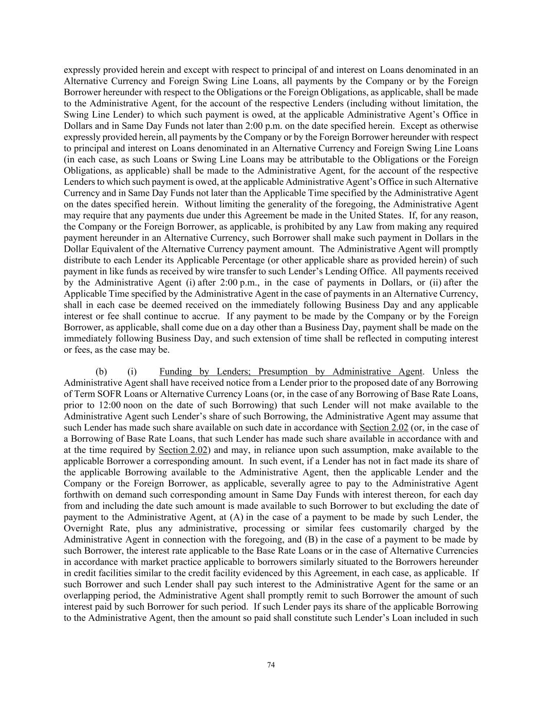 74 expressly provided herein and except with respect to principal of and interest on Loans denominated in an Alternative Currency and Foreign Swing Line Loans, all payments by the Company or by the Foreign Borrower hereunder with respect to the Obligations or the Foreign Obligations, as applicable, shall be made to the Administrative Agent, for the account of the respective Lenders (including without limitation, the Swing Line Lender) to which such payment is owed, at the applicable Administrative Agent’s Office in Dollars and in Same Day Funds not later than 2:00 p.m. on the date specified herein. Except as otherwise expressly provided herein, all payments by the Company or by the Foreign Borrower hereunder with respect to principal and interest on Loans denominated in an Alternative Currency and Foreign Swing Line Loans (in each case, as such Loans or Swing Line Loans may be attributable to the Obligations or the Foreign Obligations, as applicable) shall be made to the Administrative Agent, for the account of the respective Lenders to which such payment is owed, at the applicable Administrative Agent’s Office in such Alternative Currency and in Same Day Funds not later than the Applicable Time specified by the Administrative Agent on the dates specified herein. Without limiting the generality of the foregoing, the Administrative Agent may require that any payments due under this Agreement be made in the United States. If, for any reason, the Company or the Foreign Borrower, as applicable, is prohibited by any Law from making any required payment hereunder in an Alternative Currency, such Borrower shall make such payment in Dollars in the Dollar Equivalent of the Alternative Currency payment amount. The Administrative Agent will promptly distribute to each Lender its Applicable Percentage (or other applicable share as provided herein) of such payment in like funds as received by wire transfer to such Lender’s Lending Office. All payments received by the Administrative Agent (i) after 2:00 p.m., in the case of payments in Dollars, or (ii) after the Applicable Time specified by the Administrative Agent in the case of payments in an Alternative Currency, shall in each case be deemed received on the immediately following Business Day and any applicable interest or fee shall continue to accrue. If any payment to be made by the Company or by the Foreign Borrower, as applicable, shall come due on a day other than a Business Day, payment shall be made on the immediately following Business Day, and such extension of time shall be reflected in computing interest or fees, as the case may be. (b) (i) Funding by Lenders; Presumption by Administrative Agent. Unless the Administrative Agent shall have received notice from a Lender prior to the proposed date of any Borrowing of Term SOFR Loans or Alternative Currency Loans (or, in the case of any Borrowing of Base Rate Loans, prior to 12:00 noon on the date of such Borrowing) that such Lender will not make available to the Administrative Agent such Lender’s share of such Borrowing, the Administrative Agent may assume that such Lender has made such share available on such date in accordance with Section 2.02 (or, in the case of a Borrowing of Base Rate Loans, that such Lender has made such share available in accordance with and at the time required by Section 2.02) and may, in reliance upon such assumption, make available to the applicable Borrower a corresponding amount. In such event, if a Lender has not in fact made its share of the applicable Borrowing available to the Administrative Agent, then the applicable Lender and the Company or the Foreign Borrower, as applicable, severally agree to pay to the Administrative Agent forthwith on demand such corresponding amount in Same Day Funds with interest thereon, for each day from and including the date such amount is made available to such Borrower to but excluding the date of payment to the Administrative Agent, at (A) in the case of a payment to be made by such Lender, the Overnight Rate, plus any administrative, processing or similar fees customarily charged by the Administrative Agent in connection with the foregoing, and (B) in the case of a payment to be made by such Borrower, the interest rate applicable to the Base Rate Loans or in the case of Alternative Currencies in accordance with market practice applicable to borrowers similarly situated to the Borrowers hereunder in credit facilities similar to the credit facility evidenced by this Agreement, in each case, as applicable. If such Borrower and such Lender shall pay such interest to the Administrative Agent for the same or an overlapping period, the Administrative Agent shall promptly remit to such Borrower the amount of such interest paid by such Borrower for such period. If such Lender pays its share of the applicable Borrowing to the Administrative Agent, then the amount so paid shall constitute such Lender’s Loan included in such