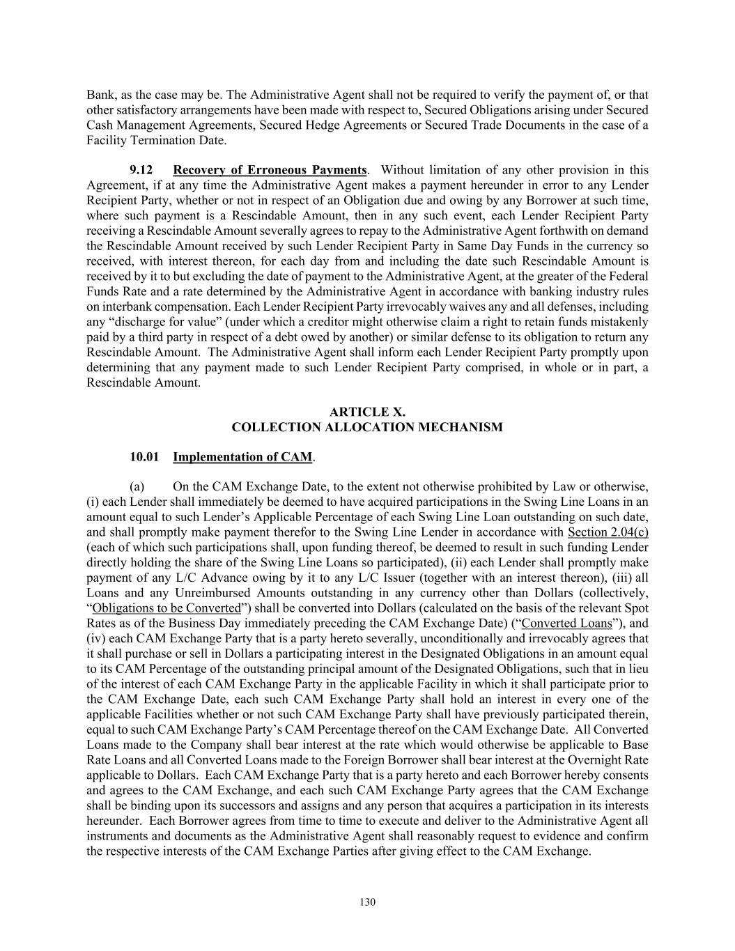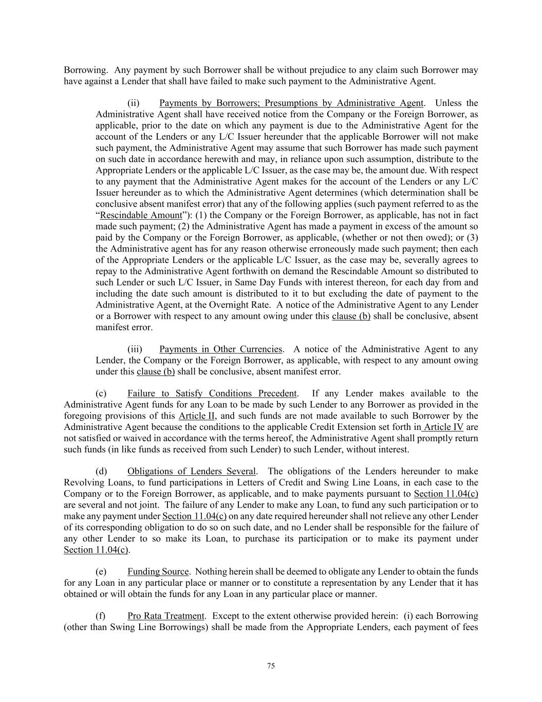 75 Borrowing. Any payment by such Borrower shall be without prejudice to any claim such Borrower may have against a Lender that shall have failed to make such payment to the Administrative Agent. (ii) Payments by Borrowers; Presumptions by Administrative Agent. Unless the Administrative Agent shall have received notice from the Company or the Foreign Borrower, as applicable, prior to the date on which any payment is due to the Administrative Agent for the account of the Lenders or any L/C Issuer hereunder that the applicable Borrower will not make such payment, the Administrative Agent may assume that such Borrower has made such payment on such date in accordance herewith and may, in reliance upon such assumption, distribute to the Appropriate Lenders or the applicable L/C Issuer, as the case may be, the amount due. With respect to any payment that the Administrative Agent makes for the account of the Lenders or any L/C Issuer hereunder as to which the Administrative Agent determines (which determination shall be conclusive absent manifest error) that any of the following applies (such payment referred to as the “Rescindable Amount”): (1) the Company or the Foreign Borrower, as applicable, has not in fact made such payment; (2) the Administrative Agent has made a payment in excess of the amount so paid by the Company or the Foreign Borrower, as applicable, (whether or not then owed); or (3) the Administrative agent has for any reason otherwise erroneously made such payment; then each of the Appropriate Lenders or the applicable L/C Issuer, as the case may be, severally agrees to repay to the Administrative Agent forthwith on demand the Rescindable Amount so distributed to such Lender or such L/C Issuer, in Same Day Funds with interest thereon, for each day from and including the date such amount is distributed to it to but excluding the date of payment to the Administrative Agent, at the Overnight Rate. A notice of the Administrative Agent to any Lender or a Borrower with respect to any amount owing under this clause (b) shall be conclusive, absent manifest error. (iii) Payments in Other Currencies. A notice of the Administrative Agent to any Lender, the Company or the Foreign Borrower, as applicable, with respect to any amount owing under this clause (b) shall be conclusive, absent manifest error. (c) Failure to Satisfy Conditions Precedent. If any Lender makes available to the Administrative Agent funds for any Loan to be made by such Lender to any Borrower as provided in the foregoing provisions of this Article II, and such funds are not made available to such Borrower by the Administrative Agent because the conditions to the applicable Credit Extension set forth in Article IV are not satisfied or waived in accordance with the terms hereof, the Administrative Agent shall promptly return such funds (in like funds as received from such Lender) to such Lender, without interest. (d) Obligations of Lenders Several. The obligations of the Lenders hereunder to make Revolving Loans, to fund participations in Letters of Credit and Swing Line Loans, in each case to the Company or to the Foreign Borrower, as applicable, and to make payments pursuant to Section 11.04(c) are several and not joint. The failure of any Lender to make any Loan, to fund any such participation or to make any payment under Section 11.04(c) on any date required hereunder shall not relieve any other Lender of its corresponding obligation to do so on such date, and no Lender shall be responsible for the failure of any other Lender to so make its Loan, to purchase its participation or to make its payment under Section 11.04(c). (e) Funding Source. Nothing herein shall be deemed to obligate any Lender to obtain the funds for any Loan in any particular place or manner or to constitute a representation by any Lender that it has obtained or will obtain the funds for any Loan in any particular place or manner. (f) Pro Rata Treatment. Except to the extent otherwise provided herein: (i) each Borrowing (other than Swing Line Borrowings) shall be made from the Appropriate Lenders, each payment of fees