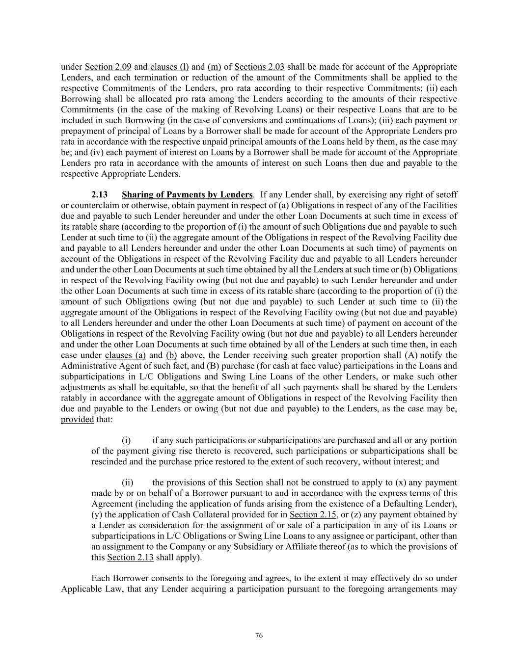 76 under Section 2.09 and clauses (l) and (m) of Sections 2.03 shall be made for account of the Appropriate Lenders, and each termination or reduction of the amount of the Commitments shall be applied to the respective Commitments of the Lenders, pro rata according to their respective Commitments; (ii) each Borrowing shall be allocated pro rata among the Lenders according to the amounts of their respective Commitments (in the case of the making of Revolving Loans) or their respective Loans that are to be included in such Borrowing (in the case of conversions and continuations of Loans); (iii) each payment or prepayment of principal of Loans by a Borrower shall be made for account of the Appropriate Lenders pro rata in accordance with the respective unpaid principal amounts of the Loans held by them, as the case may be; and (iv) each payment of interest on Loans by a Borrower shall be made for account of the Appropriate Lenders pro rata in accordance with the amounts of interest on such Loans then due and payable to the respective Appropriate Lenders. 2.13 Sharing of Payments by Lenders. If any Lender shall, by exercising any right of setoff or counterclaim or otherwise, obtain payment in respect of (a) Obligations in respect of any of the Facilities due and payable to such Lender hereunder and under the other Loan Documents at such time in excess of its ratable share (according to the proportion of (i) the amount of such Obligations due and payable to such Lender at such time to (ii) the aggregate amount of the Obligations in respect of the Revolving Facility due and payable to all Lenders hereunder and under the other Loan Documents at such time) of payments on account of the Obligations in respect of the Revolving Facility due and payable to all Lenders hereunder and under the other Loan Documents at such time obtained by all the Lenders at such time or (b) Obligations in respect of the Revolving Facility owing (but not due and payable) to such Lender hereunder and under the other Loan Documents at such time in excess of its ratable share (according to the proportion of (i) the amount of such Obligations owing (but not due and payable) to such Lender at such time to (ii) the aggregate amount of the Obligations in respect of the Revolving Facility owing (but not due and payable) to all Lenders hereunder and under the other Loan Documents at such time) of payment on account of the Obligations in respect of the Revolving Facility owing (but not due and payable) to all Lenders hereunder and under the other Loan Documents at such time obtained by all of the Lenders at such time then, in each case under clauses (a) and (b) above, the Lender receiving such greater proportion shall (A) notify the Administrative Agent of such fact, and (B) purchase (for cash at face value) participations in the Loans and subparticipations in L/C Obligations and Swing Line Loans of the other Lenders, or make such other adjustments as shall be equitable, so that the benefit of all such payments shall be shared by the Lenders ratably in accordance with the aggregate amount of Obligations in respect of the Revolving Facility then due and payable to the Lenders or owing (but not due and payable) to the Lenders, as the case may be, provided that: (i) if any such participations or subparticipations are purchased and all or any portion of the payment giving rise thereto is recovered, such participations or subparticipations shall be rescinded and the purchase price restored to the extent of such recovery, without interest; and (ii) the provisions of this Section shall not be construed to apply to (x) any payment made by or on behalf of a Borrower pursuant to and in accordance with the express terms of this Agreement (including the application of funds arising from the existence of a Defaulting Lender), (y) the application of Cash Collateral provided for in Section 2.15, or (z) any payment obtained by a Lender as consideration for the assignment of or sale of a participation in any of its Loans or subparticipations in L/C Obligations or Swing Line Loans to any assignee or participant, other than an assignment to the Company or any Subsidiary or Affiliate thereof (as to which the provisions of this Section 2.13 shall apply). Each Borrower consents to the foregoing and agrees, to the extent it may effectively do so under Applicable Law, that any Lender acquiring a participation pursuant to the foregoing arrangements may