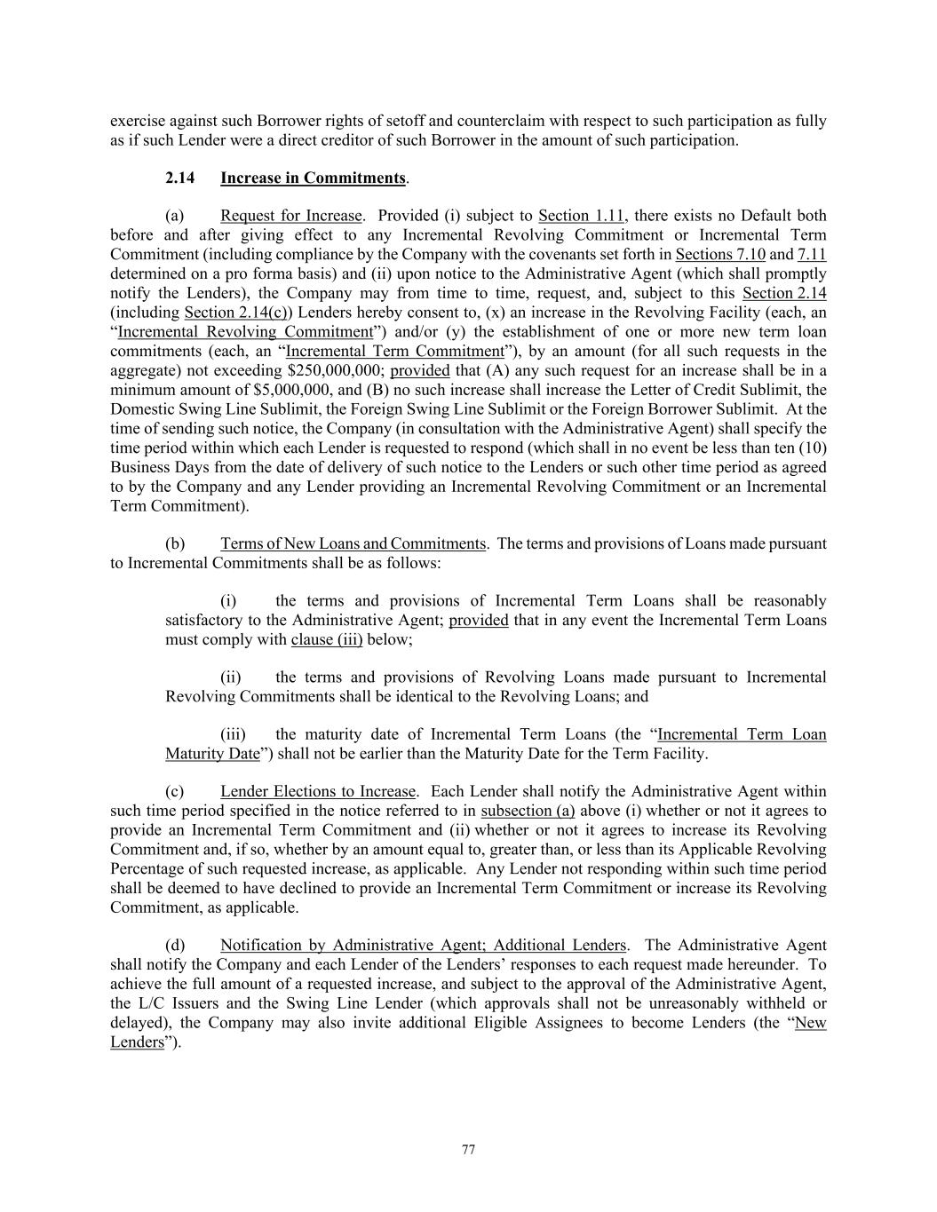77 exercise against such Borrower rights of setoff and counterclaim with respect to such participation as fully as if such Lender were a direct creditor of such Borrower in the amount of such participation. 2.14 Increase in Commitments. (a) Request for Increase. Provided (i) subject to Section 1.11, there exists no Default both before and after giving effect to any Incremental Revolving Commitment or Incremental Term Commitment (including compliance by the Company with the covenants set forth in Sections 7.10 and 7.11 determined on a pro forma basis) and (ii) upon notice to the Administrative Agent (which shall promptly notify the Lenders), the Company may from time to time, request, and, subject to this Section 2.14 (including Section 2.14(c)) Lenders hereby consent to, (x) an increase in the Revolving Facility (each, an “Incremental Revolving Commitment”) and/or (y) the establishment of one or more new term loan commitments (each, an “Incremental Term Commitment”), by an amount (for all such requests in the aggregate) not exceeding $250,000,000; provided that (A) any such request for an increase shall be in a minimum amount of $5,000,000, and (B) no such increase shall increase the Letter of Credit Sublimit, the Domestic Swing Line Sublimit, the Foreign Swing Line Sublimit or the Foreign Borrower Sublimit. At the time of sending such notice, the Company (in consultation with the Administrative Agent) shall specify the time period within which each Lender is requested to respond (which shall in no event be less than ten (10) Business Days from the date of delivery of such notice to the Lenders or such other time period as agreed to by the Company and any Lender providing an Incremental Revolving Commitment or an Incremental Term Commitment). (b) Terms of New Loans and Commitments. The terms and provisions of Loans made pursuant to Incremental Commitments shall be as follows: (i) the terms and provisions of Incremental Term Loans shall be reasonably satisfactory to the Administrative Agent; provided that in any event the Incremental Term Loans must comply with clause (iii) below; (ii) the terms and provisions of Revolving Loans made pursuant to Incremental Revolving Commitments shall be identical to the Revolving Loans; and (iii) the maturity date of Incremental Term Loans (the “Incremental Term Loan Maturity Date”) shall not be earlier than the Maturity Date for the Term Facility. (c) Lender Elections to Increase. Each Lender shall notify the Administrative Agent within such time period specified in the notice referred to in subsection (a) above (i) whether or not it agrees to provide an Incremental Term Commitment and (ii) whether or not it agrees to increase its Revolving Commitment and, if so, whether by an amount equal to, greater than, or less than its Applicable Revolving Percentage of such requested increase, as applicable. Any Lender not responding within such time period shall be deemed to have declined to provide an Incremental Term Commitment or increase its Revolving Commitment, as applicable. (d) Notification by Administrative Agent; Additional Lenders. The Administrative Agent shall notify the Company and each Lender of the Lenders’ responses to each request made hereunder. To achieve the full amount of a requested increase, and subject to the approval of the Administrative Agent, the L/C Issuers and the Swing Line Lender (which approvals shall not be unreasonably withheld or delayed), the Company may also invite additional Eligible Assignees to become Lenders (the “New Lenders”).