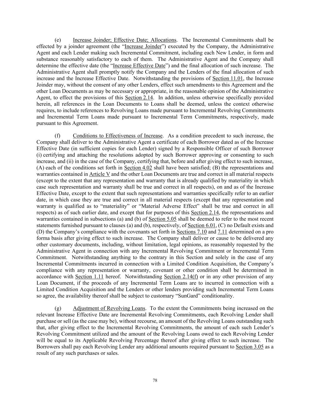 78 (e) Increase Joinder; Effective Date; Allocations. The Incremental Commitments shall be effected by a joinder agreement (the “Increase Joinder”) executed by the Company, the Administrative Agent and each Lender making such Incremental Commitment, including each New Lender, in form and substance reasonably satisfactory to each of them. The Administrative Agent and the Company shall determine the effective date (the “Increase Effective Date”) and the final allocation of such increase. The Administrative Agent shall promptly notify the Company and the Lenders of the final allocation of such increase and the Increase Effective Date. Notwithstanding the provisions of Section 11.01, the Increase Joinder may, without the consent of any other Lenders, effect such amendments to this Agreement and the other Loan Documents as may be necessary or appropriate, in the reasonable opinion of the Administrative Agent, to effect the provisions of this Section 2.14. In addition, unless otherwise specifically provided herein, all references in the Loan Documents to Loans shall be deemed, unless the context otherwise requires, to include references to Revolving Loans made pursuant to Incremental Revolving Commitments and Incremental Term Loans made pursuant to Incremental Term Commitments, respectively, made pursuant to this Agreement. (f) Conditions to Effectiveness of Increase. As a condition precedent to such increase, the Company shall deliver to the Administrative Agent a certificate of each Borrower dated as of the Increase Effective Date (in sufficient copies for each Lender) signed by a Responsible Officer of such Borrower (i) certifying and attaching the resolutions adopted by such Borrower approving or consenting to such increase, and (ii) in the case of the Company, certifying that, before and after giving effect to such increase, (A) each of the conditions set forth in Section 4.02 shall have been satisfied; (B) the representations and warranties contained in Article V and the other Loan Documents are true and correct in all material respects (except to the extent that any representation and warranty that is already qualified by materiality in which case such representation and warranty shall be true and correct in all respects), on and as of the Increase Effective Date, except to the extent that such representations and warranties specifically refer to an earlier date, in which case they are true and correct in all material respects (except that any representation and warranty is qualified as to “materiality” or “Material Adverse Effect” shall be true and correct in all respects) as of such earlier date, and except that for purposes of this Section 2.14, the representations and warranties contained in subsections (a) and (b) of Section 5.05 shall be deemed to refer to the most recent statements furnished pursuant to clauses (a) and (b), respectively, of Section 6.01, (C) no Default exists and (D) the Company’s compliance with the covenants set forth in Sections 7.10 and 7.11 determined on a pro forma basis after giving effect to such increase. The Company shall deliver or cause to be delivered any other customary documents, including, without limitation, legal opinions, as reasonably requested by the Administrative Agent in connection with any Incremental Revolving Commitment or Incremental Term Commitment. Notwithstanding anything to the contrary in this Section and solely in the case of any Incremental Commitments incurred in connection with a Limited Condition Acquisition, the Company’s compliance with any representation or warranty, covenant or other condition shall be determined in accordance with Section 1.11 hereof. Notwithstanding Section 2.14(f) or in any other provision of any Loan Document, if the proceeds of any Incremental Term Loans are to incurred in connection with a Limited Condition Acquisition and the Lenders or other lenders providing such Incremental Term Loans so agree, the availability thereof shall be subject to customary “SunGard” conditionality. (g) Adjustment of Revolving Loans. To the extent the Commitments being increased on the relevant Increase Effective Date are Incremental Revolving Commitments, each Revolving Lender shall purchase or sell (as the case may be), without recourse, an amount of the Revolving Loans outstanding such that, after giving effect to the Incremental Revolving Commitments, the amount of each such Lender’s Revolving Commitment utilized and the amount of the Revolving Loans owed to each Revolving Lender will be equal to its Applicable Revolving Percentage thereof after giving effect to such increase. The Borrowers shall pay each Revolving Lender any additional amounts required pursuant to Section 3.05 as a result of any such purchases or sales.