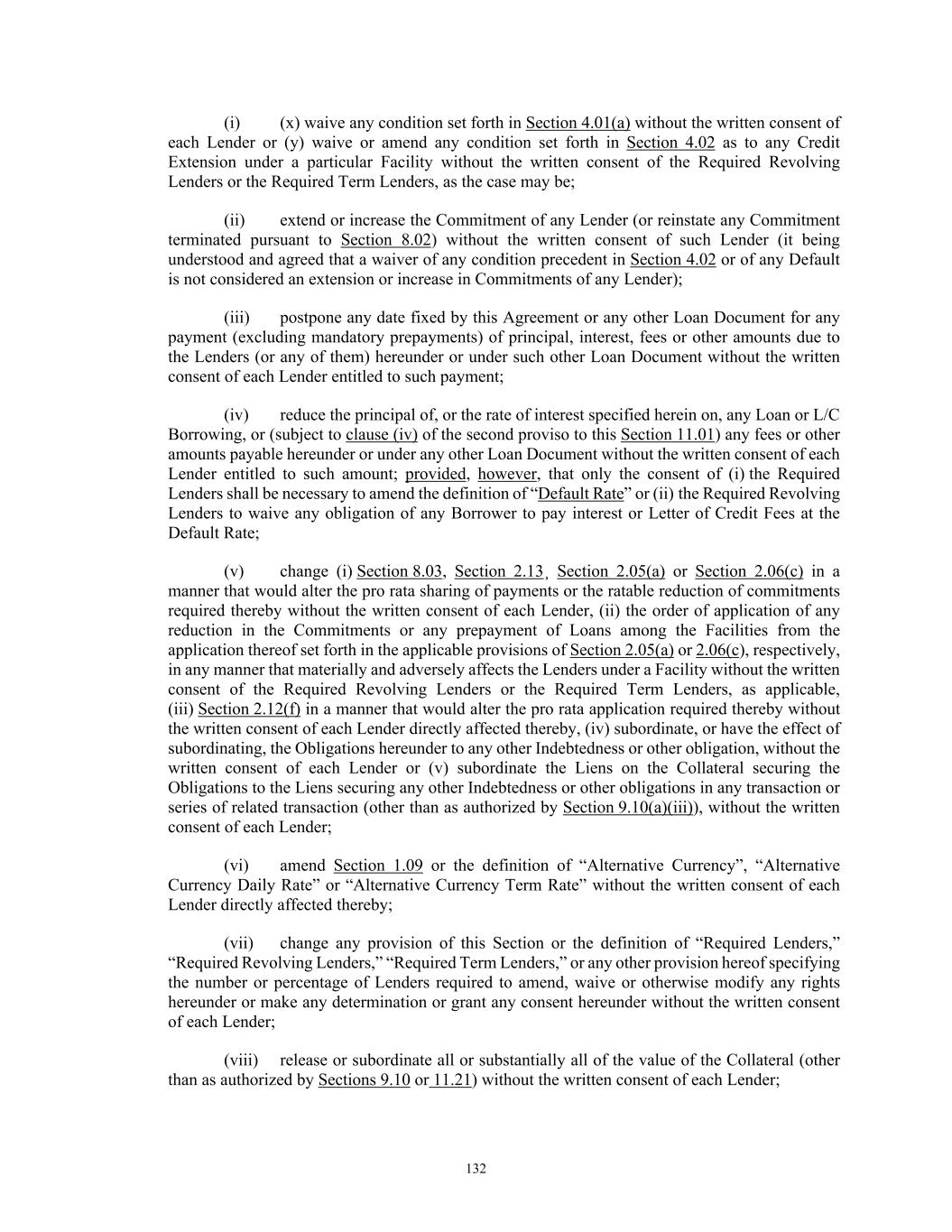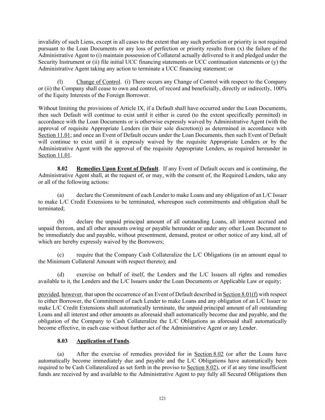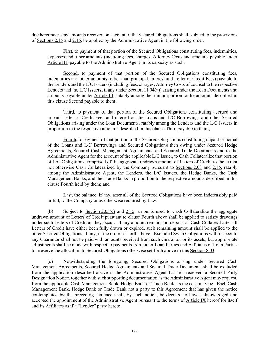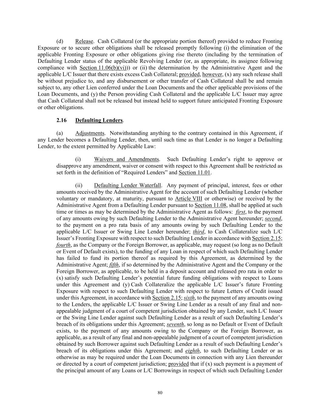 80 (d) Release. Cash Collateral (or the appropriate portion thereof) provided to reduce Fronting Exposure or to secure other obligations shall be released promptly following (i) the elimination of the applicable Fronting Exposure or other obligations giving rise thereto (including by the termination of Defaulting Lender status of the applicable Revolving Lender (or, as appropriate, its assignee following compliance with Section 11.06(b)(vi))) or (ii) the determination by the Administrative Agent and the applicable L/C Issuer that there exists excess Cash Collateral; provided, however, (x) any such release shall be without prejudice to, and any disbursement or other transfer of Cash Collateral shall be and remain subject to, any other Lien conferred under the Loan Documents and the other applicable provisions of the Loan Documents, and (y) the Person providing Cash Collateral and the applicable L/C Issuer may agree that Cash Collateral shall not be released but instead held to support future anticipated Fronting Exposure or other obligations. 2.16 Defaulting Lenders. (a) Adjustments. Notwithstanding anything to the contrary contained in this Agreement, if any Lender becomes a Defaulting Lender, then, until such time as that Lender is no longer a Defaulting Lender, to the extent permitted by Applicable Law: (i) Waivers and Amendments. Such Defaulting Lender’s right to approve or disapprove any amendment, waiver or consent with respect to this Agreement shall be restricted as set forth in the definition of “Required Lenders” and Section 11.01. (ii) Defaulting Lender Waterfall. Any payment of principal, interest, fees or other amounts received by the Administrative Agent for the account of such Defaulting Lender (whether voluntary or mandatory, at maturity, pursuant to Article VIII or otherwise) or received by the Administrative Agent from a Defaulting Lender pursuant to Section 11.08, shall be applied at such time or times as may be determined by the Administrative Agent as follows: first, to the payment of any amounts owing by such Defaulting Lender to the Administrative Agent hereunder; second, to the payment on a pro rata basis of any amounts owing by such Defaulting Lender to the applicable L/C Issuer or Swing Line Lender hereunder; third, to Cash Collateralize such L/C Issuer’s Fronting Exposure with respect to such Defaulting Lender in accordance with Section 2.15; fourth, as the Company or the Foreign Borrower, as applicable, may request (so long as no Default or Event of Default exists), to the funding of any Loan in respect of which such Defaulting Lender has failed to fund its portion thereof as required by this Agreement, as determined by the Administrative Agent; fifth, if so determined by the Administrative Agent and the Company or the Foreign Borrower, as applicable, to be held in a deposit account and released pro rata in order to (x) satisfy such Defaulting Lender’s potential future funding obligations with respect to Loans under this Agreement and (y) Cash Collateralize the applicable L/C Issuer’s future Fronting Exposure with respect to such Defaulting Lender with respect to future Letters of Credit issued under this Agreement, in accordance with Section 2.15; sixth, to the payment of any amounts owing to the Lenders, the applicable L/C Issuer or Swing Line Lender as a result of any final and non- appealable judgment of a court of competent jurisdiction obtained by any Lender, such L/C Issuer or the Swing Line Lender against such Defaulting Lender as a result of such Defaulting Lender’s breach of its obligations under this Agreement; seventh, so long as no Default or Event of Default exists, to the payment of any amounts owing to the Company or the Foreign Borrower, as applicable, as a result of any final and non-appealable judgment of a court of competent jurisdiction obtained by such Borrower against such Defaulting Lender as a result of such Defaulting Lender’s breach of its obligations under this Agreement; and eighth, to such Defaulting Lender or as otherwise as may be required under the Loan Documents in connection with any Lien thereunder or directed by a court of competent jurisdiction; provided that if (x) such payment is a payment of the principal amount of any Loans or L/C Borrowings in respect of which such Defaulting Lender