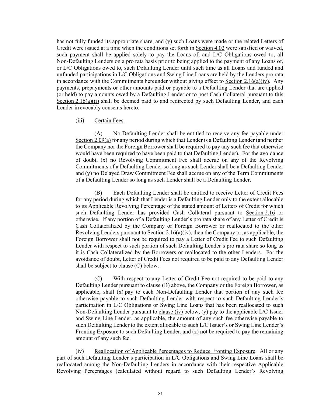 81 has not fully funded its appropriate share, and (y) such Loans were made or the related Letters of Credit were issued at a time when the conditions set forth in Section 4.02 were satisfied or waived, such payment shall be applied solely to pay the Loans of, and L/C Obligations owed to, all Non-Defaulting Lenders on a pro rata basis prior to being applied to the payment of any Loans of, or L/C Obligations owed to, such Defaulting Lender until such time as all Loans and funded and unfunded participations in L/C Obligations and Swing Line Loans are held by the Lenders pro rata in accordance with the Commitments hereunder without giving effect to Section 2.16(a)(iv). Any payments, prepayments or other amounts paid or payable to a Defaulting Lender that are applied (or held) to pay amounts owed by a Defaulting Lender or to post Cash Collateral pursuant to this Section 2.16(a)(ii) shall be deemed paid to and redirected by such Defaulting Lender, and each Lender irrevocably consents hereto. (iii) Certain Fees. (A) No Defaulting Lender shall be entitled to receive any fee payable under Section 2.09(a) for any period during which that Lender is a Defaulting Lender (and neither the Company nor the Foreign Borrower shall be required to pay any such fee that otherwise would have been required to have been paid to that Defaulting Lender). For the avoidance of doubt, (x) no Revolving Commitment Fee shall accrue on any of the Revolving Commitments of a Defaulting Lender so long as such Lender shall be a Defaulting Lender and (y) no Delayed Draw Commitment Fee shall accrue on any of the Term Commitments of a Defaulting Lender so long as such Lender shall be a Defaulting Lender. (B) Each Defaulting Lender shall be entitled to receive Letter of Credit Fees for any period during which that Lender is a Defaulting Lender only to the extent allocable to its Applicable Revolving Percentage of the stated amount of Letters of Credit for which such Defaulting Lender has provided Cash Collateral pursuant to Section 2.16 or otherwise. If any portion of a Defaulting Lender’s pro rata share of any Letter of Credit is Cash Collateralized by the Company or Foreign Borrower or reallocated to the other Revolving Lenders pursuant to Section 2.16(a)(iv), then the Company or, as applicable, the Foreign Borrower shall not be required to pay a Letter of Credit Fee to such Defaulting Lender with respect to such portion of such Defaulting Lender’s pro rata share so long as it is Cash Collateralized by the Borrowers or reallocated to the other Lenders. For the avoidance of doubt, Letter of Credit Fees not required to be paid to any Defaulting Lender shall be subject to clause (C) below. (C) With respect to any Letter of Credit Fee not required to be paid to any Defaulting Lender pursuant to clause (B) above, the Company or the Foreign Borrower, as applicable, shall (x) pay to each Non-Defaulting Lender that portion of any such fee otherwise payable to such Defaulting Lender with respect to such Defaulting Lender’s participation in L/C Obligations or Swing Line Loans that has been reallocated to such Non-Defaulting Lender pursuant to clause (iv) below, (y) pay to the applicable L/C Issuer and Swing Line Lender, as applicable, the amount of any such fee otherwise payable to such Defaulting Lender to the extent allocable to such L/C Issuer’s or Swing Line Lender’s Fronting Exposure to such Defaulting Lender, and (z) not be required to pay the remaining amount of any such fee. (iv) Reallocation of Applicable Percentages to Reduce Fronting Exposure. All or any part of such Defaulting Lender’s participation in L/C Obligations and Swing Line Loans shall be reallocated among the Non-Defaulting Lenders in accordance with their respective Applicable Revolving Percentages (calculated without regard to such Defaulting Lender’s Revolving