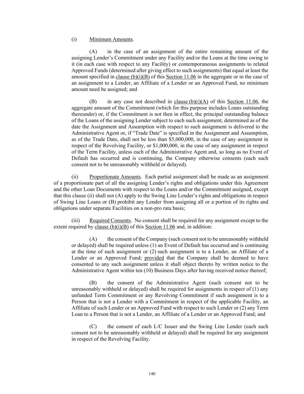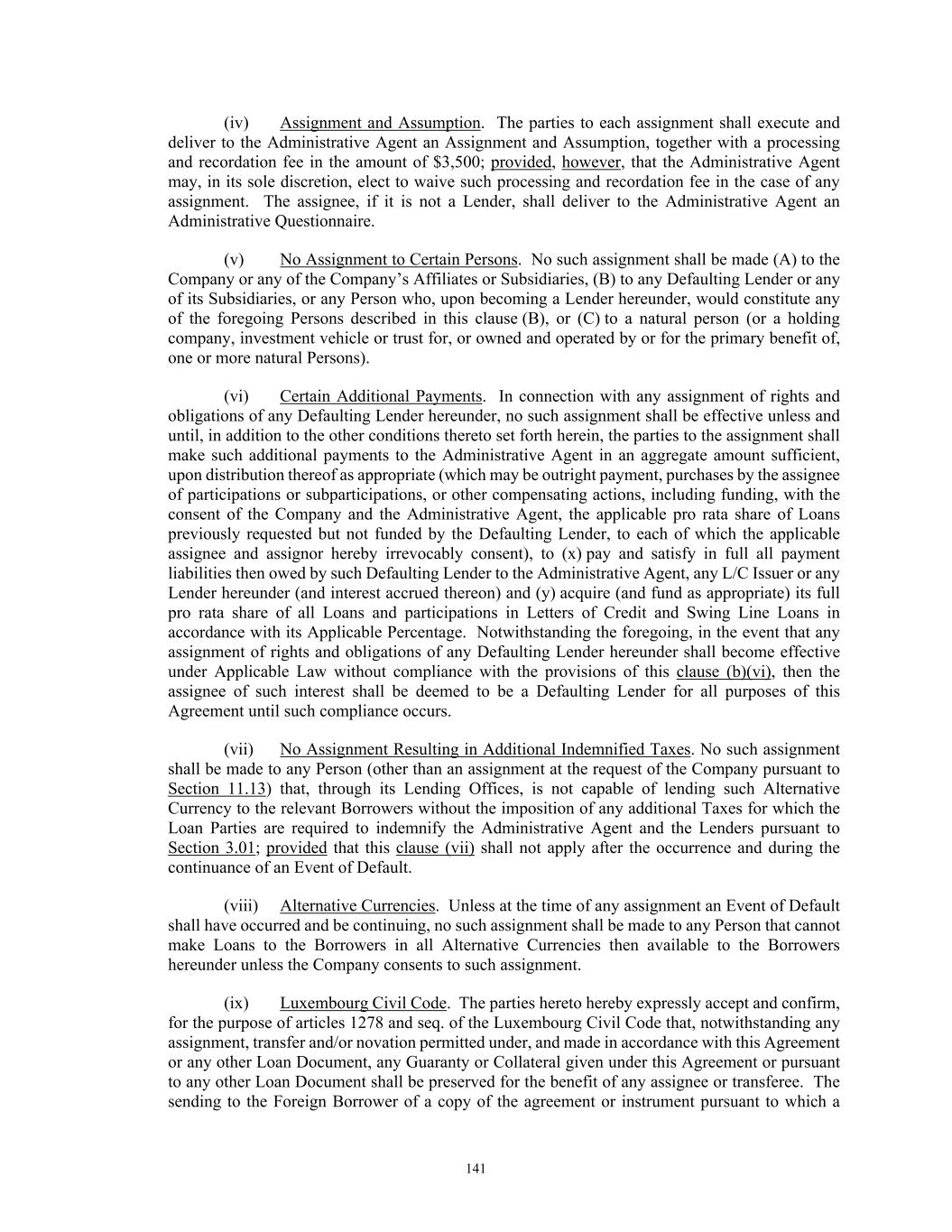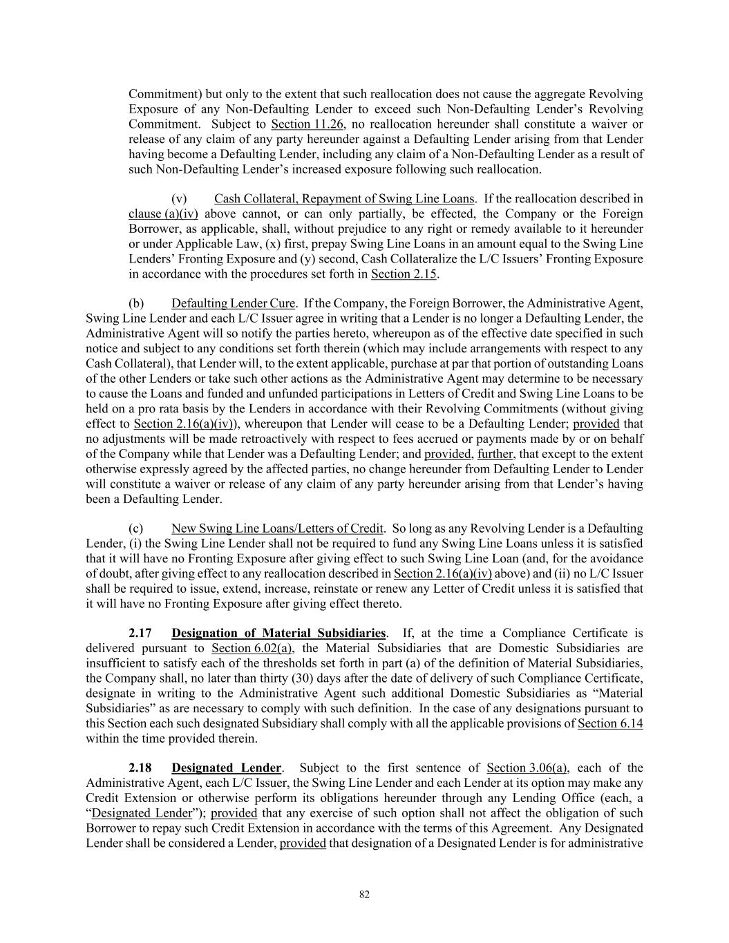 82 Commitment) but only to the extent that such reallocation does not cause the aggregate Revolving Exposure of any Non-Defaulting Lender to exceed such Non-Defaulting Lender’s Revolving Commitment. Subject to Section 11.26, no reallocation hereunder shall constitute a waiver or release of any claim of any party hereunder against a Defaulting Lender arising from that Lender having become a Defaulting Lender, including any claim of a Non-Defaulting Lender as a result of such Non-Defaulting Lender’s increased exposure following such reallocation. (v) Cash Collateral, Repayment of Swing Line Loans. If the reallocation described in clause (a)(iv) above cannot, or can only partially, be effected, the Company or the Foreign Borrower, as applicable, shall, without prejudice to any right or remedy available to it hereunder or under Applicable Law, (x) first, prepay Swing Line Loans in an amount equal to the Swing Line Lenders’ Fronting Exposure and (y) second, Cash Collateralize the L/C Issuers’ Fronting Exposure in accordance with the procedures set forth in Section 2.15. (b) Defaulting Lender Cure. If the Company, the Foreign Borrower, the Administrative Agent, Swing Line Lender and each L/C Issuer agree in writing that a Lender is no longer a Defaulting Lender, the Administrative Agent will so notify the parties hereto, whereupon as of the effective date specified in such notice and subject to any conditions set forth therein (which may include arrangements with respect to any Cash Collateral), that Lender will, to the extent applicable, purchase at par that portion of outstanding Loans of the other Lenders or take such other actions as the Administrative Agent may determine to be necessary to cause the Loans and funded and unfunded participations in Letters of Credit and Swing Line Loans to be held on a pro rata basis by the Lenders in accordance with their Revolving Commitments (without giving effect to Section 2.16(a)(iv)), whereupon that Lender will cease to be a Defaulting Lender; provided that no adjustments will be made retroactively with respect to fees accrued or payments made by or on behalf of the Company while that Lender was a Defaulting Lender; and provided, further, that except to the extent otherwise expressly agreed by the affected parties, no change hereunder from Defaulting Lender to Lender will constitute a waiver or release of any claim of any party hereunder arising from that Lender’s having been a Defaulting Lender. (c) New Swing Line Loans/Letters of Credit. So long as any Revolving Lender is a Defaulting Lender, (i) the Swing Line Lender shall not be required to fund any Swing Line Loans unless it is satisfied that it will have no Fronting Exposure after giving effect to such Swing Line Loan (and, for the avoidance of doubt, after giving effect to any reallocation described in Section 2.16(a)(iv) above) and (ii) no L/C Issuer shall be required to issue, extend, increase, reinstate or renew any Letter of Credit unless it is satisfied that it will have no Fronting Exposure after giving effect thereto. 2.17 Designation of Material Subsidiaries. If, at the time a Compliance Certificate is delivered pursuant to Section 6.02(a), the Material Subsidiaries that are Domestic Subsidiaries are insufficient to satisfy each of the thresholds set forth in part (a) of the definition of Material Subsidiaries, the Company shall, no later than thirty (30) days after the date of delivery of such Compliance Certificate, designate in writing to the Administrative Agent such additional Domestic Subsidiaries as “Material Subsidiaries” as are necessary to comply with such definition. In the case of any designations pursuant to this Section each such designated Subsidiary shall comply with all the applicable provisions of Section 6.14 within the time provided therein. 2.18 Designated Lender. Subject to the first sentence of Section 3.06(a), each of the Administrative Agent, each L/C Issuer, the Swing Line Lender and each Lender at its option may make any Credit Extension or otherwise perform its obligations hereunder through any Lending Office (each, a “Designated Lender”); provided that any exercise of such option shall not affect the obligation of such Borrower to repay such Credit Extension in accordance with the terms of this Agreement. Any Designated Lender shall be considered a Lender, provided that designation of a Designated Lender is for administrative