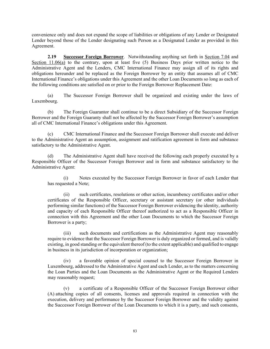 83 convenience only and does not expand the scope of liabilities or obligations of any Lender or Designated Lender beyond those of the Lender designating such Person as a Designated Lender as provided in this Agreement. 2.19 Successor Foreign Borrower. Notwithstanding anything set forth in Section 7.04 and Section 11.06(a) to the contrary, upon at least five (5) Business Days prior written notice to the Administrative Agent and the Lenders, CMC International Finance may assign all of its rights and obligations hereunder and be replaced as the Foreign Borrower by an entity that assumes all of CMC International Finance’s obligations under this Agreement and the other Loan Documents so long as each of the following conditions are satisfied on or prior to the Foreign Borrower Replacement Date: (a) The Successor Foreign Borrower shall be organized and existing under the laws of Luxembourg. (b) The Foreign Guarantor shall continue to be a direct Subsidiary of the Successor Foreign Borrower and the Foreign Guaranty shall not be affected by the Successor Foreign Borrower’s assumption all of CMC International Finance’s obligations under this Agreement. (c) CMC International Finance and the Successor Foreign Borrower shall execute and deliver to the Administrative Agent an assumption, assignment and ratification agreement in form and substance satisfactory to the Administrative Agent. (d) The Administrative Agent shall have received the following each properly executed by a Responsible Officer of the Successor Foreign Borrower and in form and substance satisfactory to the Administrative Agent: (i) Notes executed by the Successor Foreign Borrower in favor of each Lender that has requested a Note; (ii) such certificates, resolutions or other action, incumbency certificates and/or other certificates of the Responsible Officer, secretary or assistant secretary (or other individuals performing similar functions) of the Successor Foreign Borrower evidencing the identity, authority and capacity of each Responsible Officer thereof authorized to act as a Responsible Officer in connection with this Agreement and the other Loan Documents to which the Successor Foreign Borrower is a party; (iii) such documents and certifications as the Administrative Agent may reasonably require to evidence that the Successor Foreign Borrower is duly organized or formed, and is validly existing, in good standing or the equivalent thereof (to the extent applicable) and qualified to engage in business in its jurisdiction of incorporation or organization; (iv) a favorable opinion of special counsel to the Successor Foreign Borrower in Luxembourg, addressed to the Administrative Agent and each Lender, as to the matters concerning the Loan Parties and the Loan Documents as the Administrative Agent or the Required Lenders may reasonably request; (v) a certificate of a Responsible Officer of the Successor Foreign Borrower either (A) attaching copies of all consents, licenses and approvals required in connection with the execution, delivery and performance by the Successor Foreign Borrower and the validity against the Successor Foreign Borrower of the Loan Documents to which it is a party, and such consents,