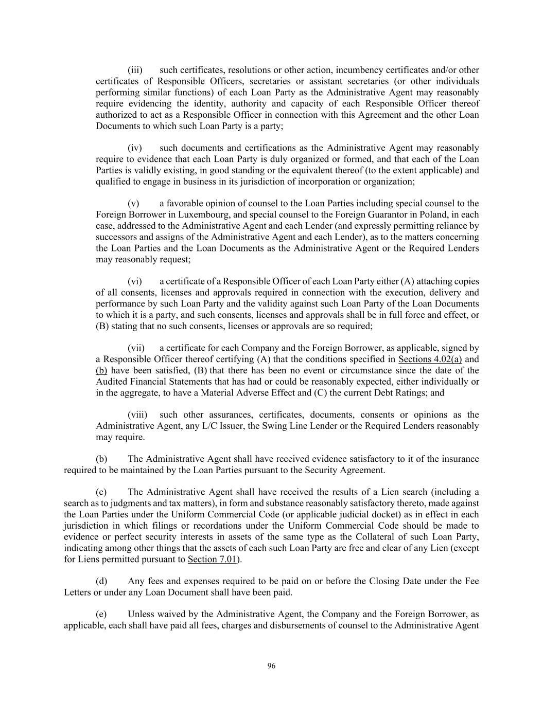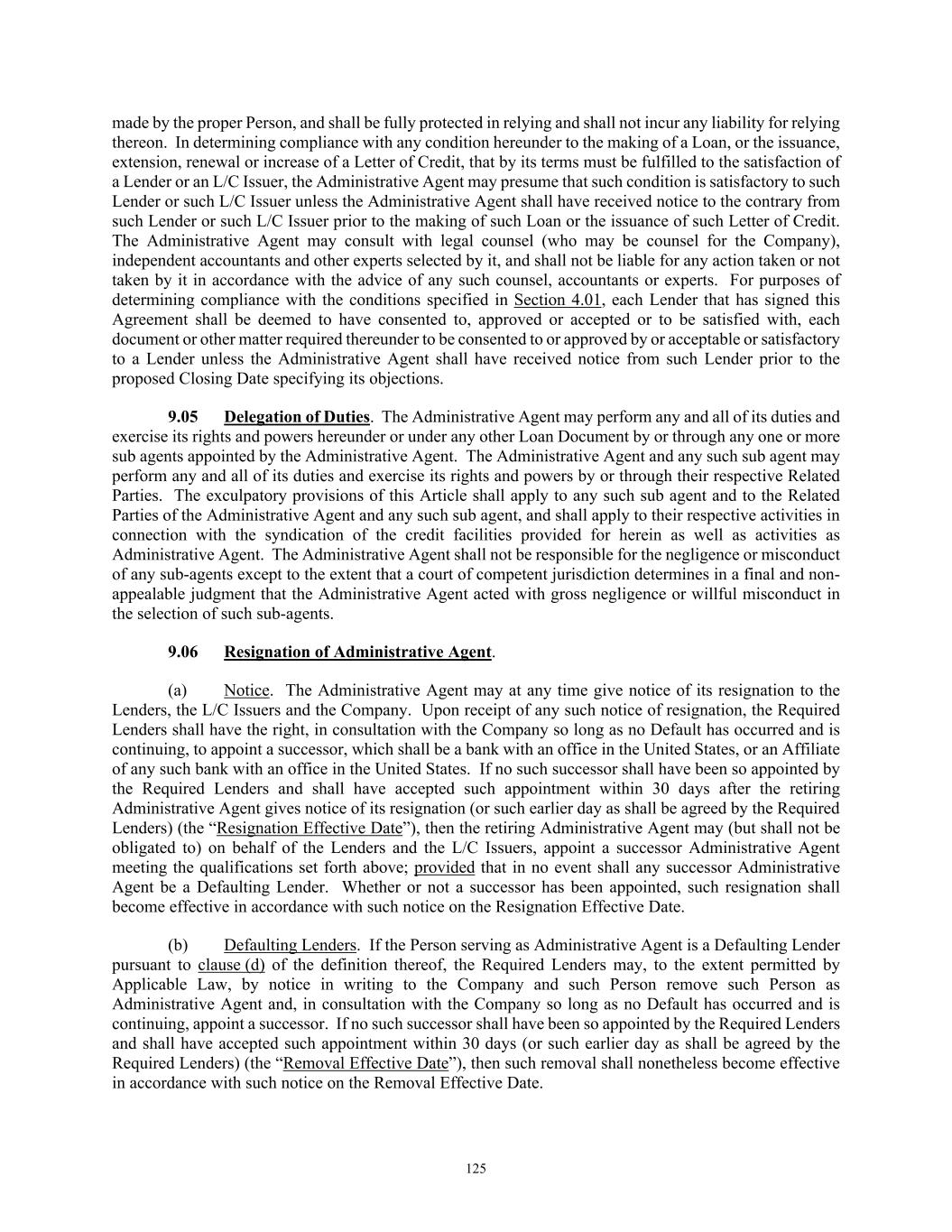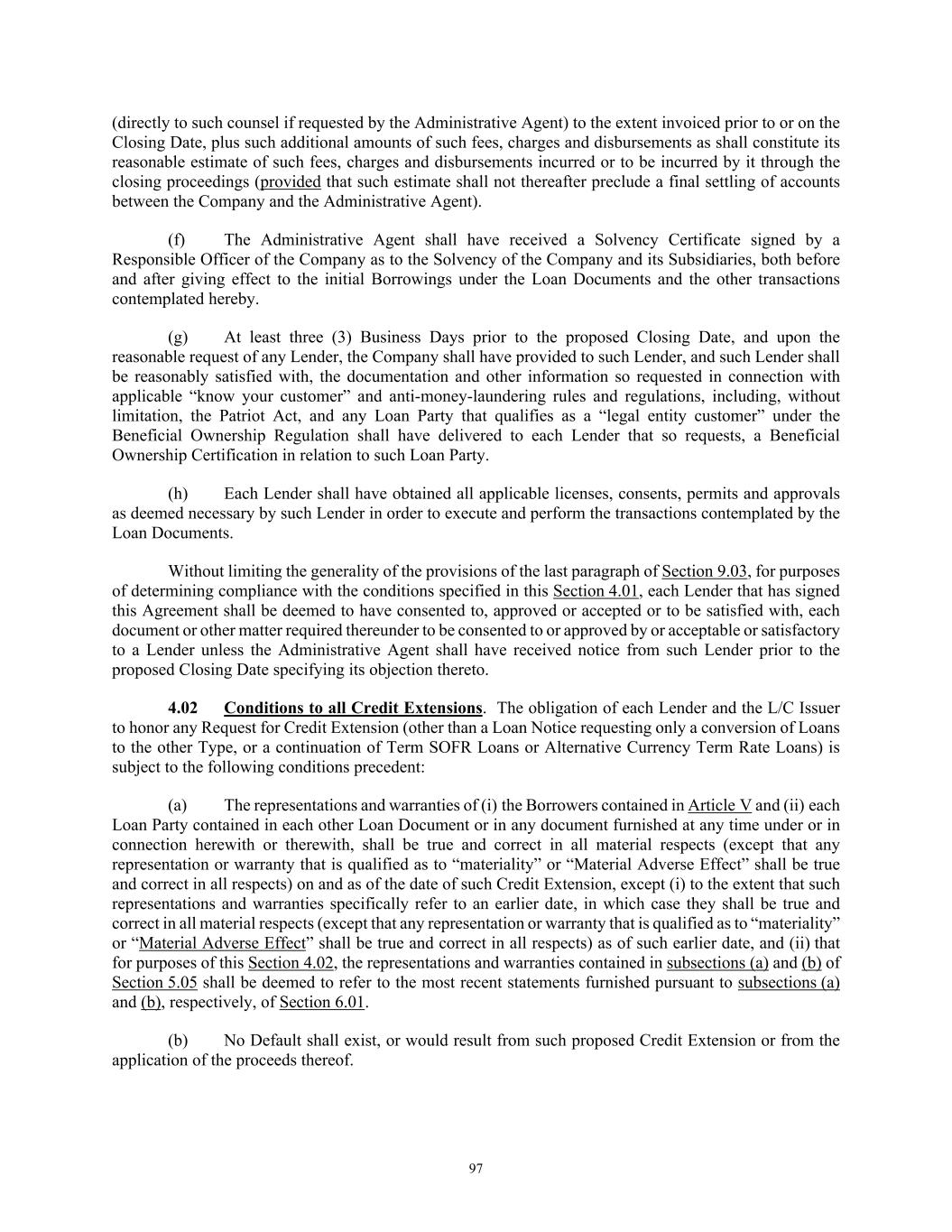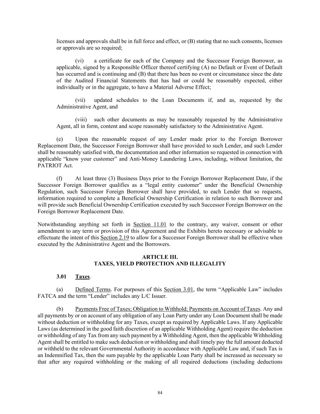 84 licenses and approvals shall be in full force and effect, or (B) stating that no such consents, licenses or approvals are so required; (vi) a certificate for each of the Company and the Successor Foreign Borrower, as applicable, signed by a Responsible Officer thereof certifying (A) no Default or Event of Default has occurred and is continuing and (B) that there has been no event or circumstance since the date of the Audited Financial Statements that has had or could be reasonably expected, either individually or in the aggregate, to have a Material Adverse Effect; (vii) updated schedules to the Loan Documents if, and as, requested by the Administrative Agent, and (viii) such other documents as may be reasonably requested by the Administrative Agent, all in form, content and scope reasonably satisfactory to the Administrative Agent. (e) Upon the reasonable request of any Lender made prior to the Foreign Borrower Replacement Date, the Successor Foreign Borrower shall have provided to such Lender, and such Lender shall be reasonably satisfied with, the documentation and other information so requested in connection with applicable “know your customer” and Anti-Money Laundering Laws, including, without limitation, the PATRIOT Act. (f) At least three (3) Business Days prior to the Foreign Borrower Replacement Date, if the Successor Foreign Borrower qualifies as a “legal entity customer” under the Beneficial Ownership Regulation, such Successor Foreign Borrower shall have provided, to each Lender that so requests, information required to complete a Beneficial Ownership Certification in relation to such Borrower and will provide such Beneficial Ownership Certification executed by such Successor Foreign Borrower on the Foreign Borrower Replacement Date. Notwithstanding anything set forth in Section 11.01 to the contrary, any waiver, consent or other amendment to any term or provision of this Agreement and the Exhibits hereto necessary or advisable to effectuate the intent of this Section 2.19 to allow for a Successor Foreign Borrower shall be effective when executed by the Administrative Agent and the Borrowers. ARTICLE III. TAXES, YIELD PROTECTION AND ILLEGALITY 3.01 Taxes. (a) Defined Terms. For purposes of this Section 3.01, the term “Applicable Law” includes FATCA and the term “Lender” includes any L/C Issuer. (b) Payments Free of Taxes; Obligation to Withhold; Payments on Account of Taxes. Any and all payments by or on account of any obligation of any Loan Party under any Loan Document shall be made without deduction or withholding for any Taxes, except as required by Applicable Laws. If any Applicable Laws (as determined in the good faith discretion of an applicable Withholding Agent) require the deduction or withholding of any Tax from any such payment by a Withholding Agent, then the applicable Withholding Agent shall be entitled to make such deduction or withholding and shall timely pay the full amount deducted or withheld to the relevant Governmental Authority in accordance with Applicable Law and, if such Tax is an Indemnified Tax, then the sum payable by the applicable Loan Party shall be increased as necessary so that after any required withholding or the making of all required deductions (including deductions