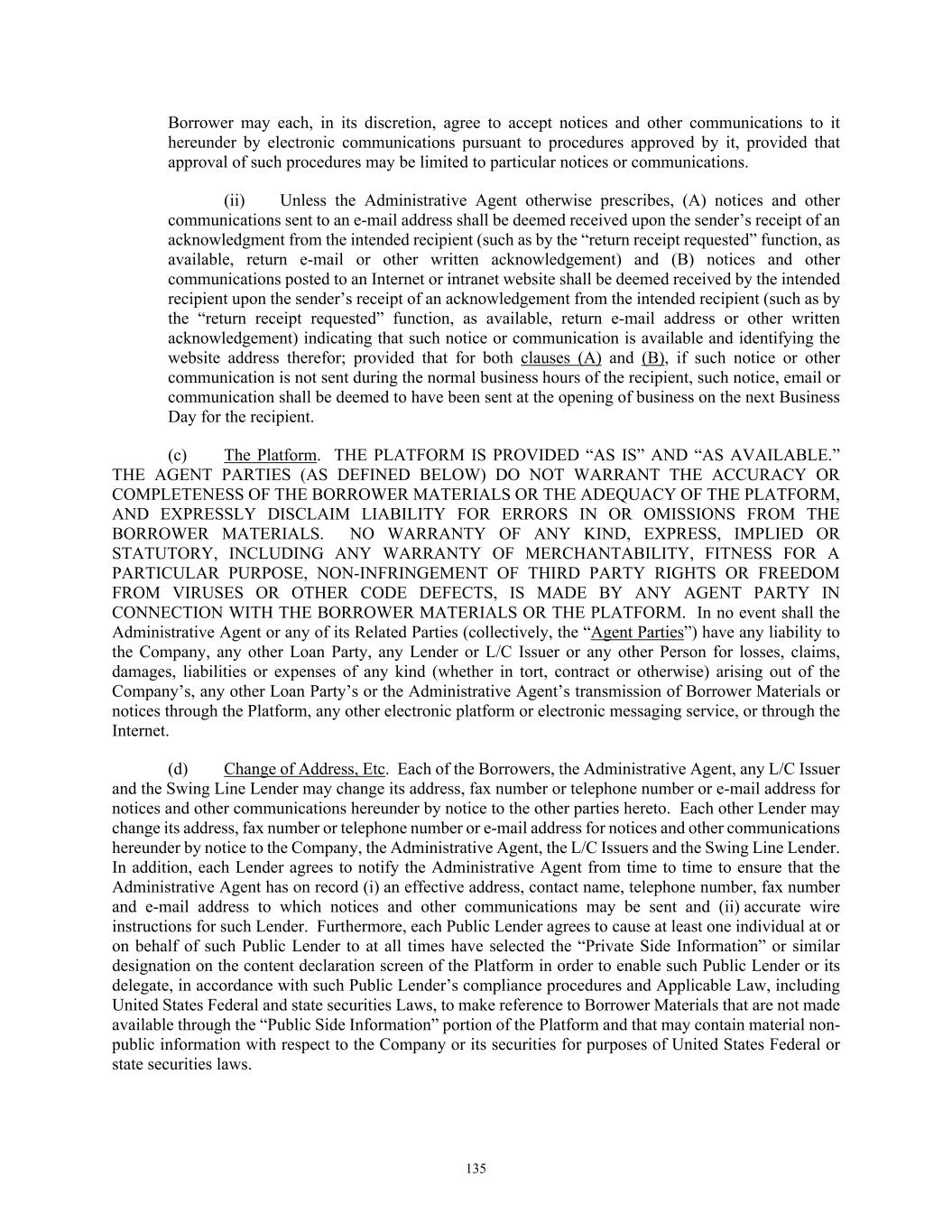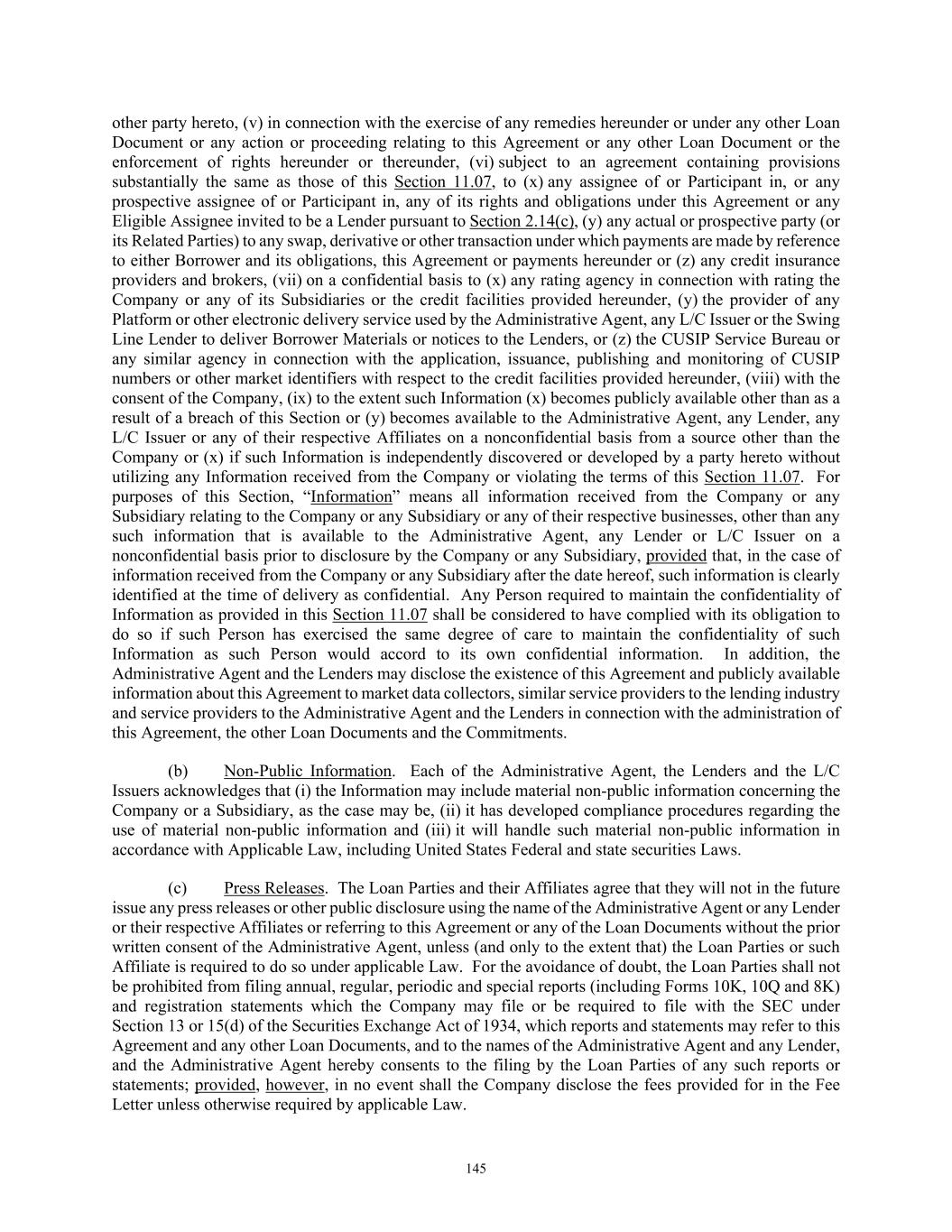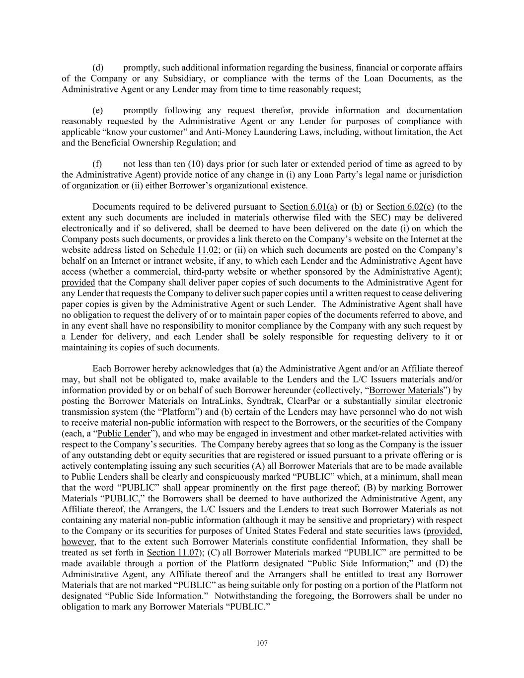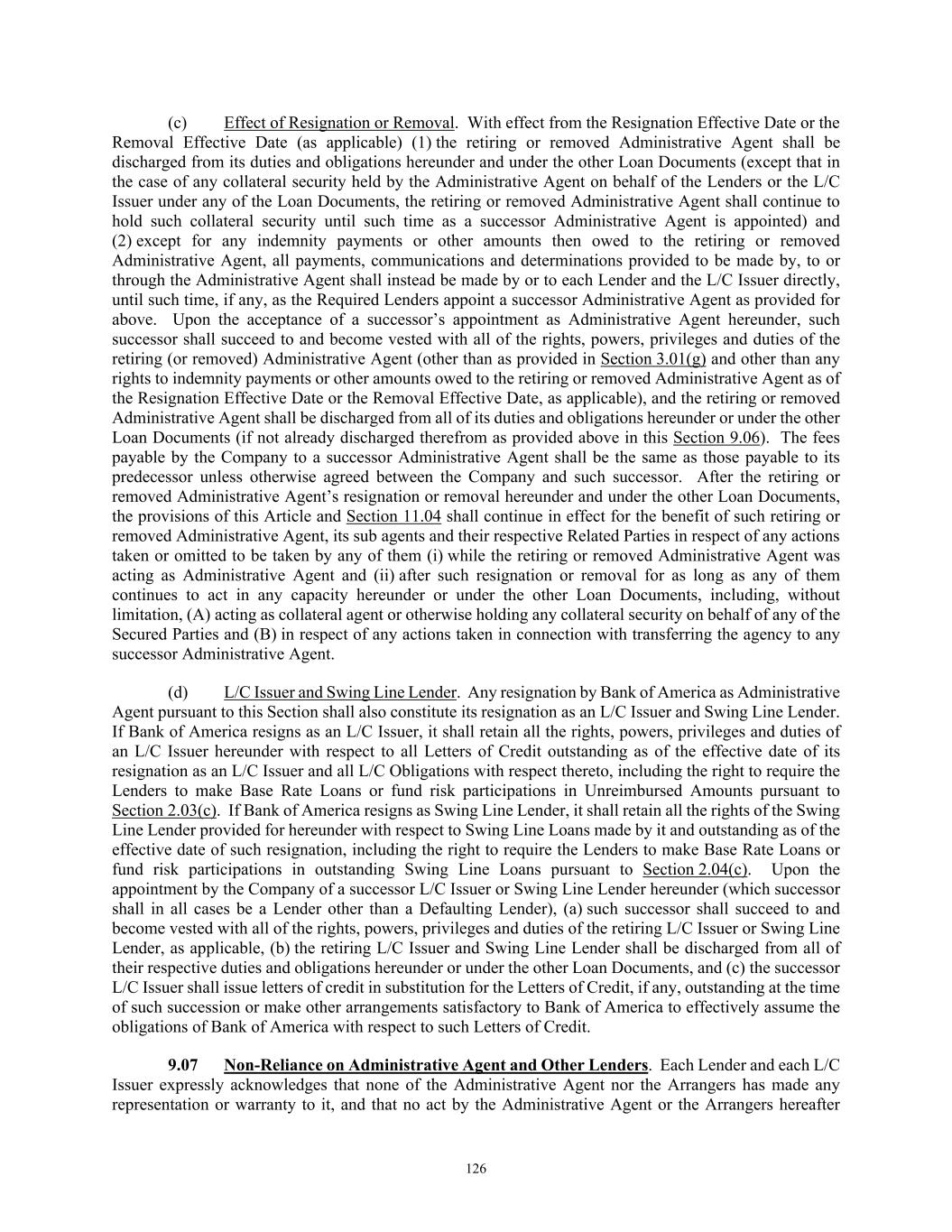 84 licenses and approvals shall be in full force and effect, or (B) stating that no such consents, licenses or approvals are so required; (vi) a certificate for each of the Company and the Successor Foreign Borrower, as applicable, signed by a Responsible Officer thereof certifying (A) no Default or Event of Default has occurred and is continuing and (B) that there has been no event or circumstance since the date of the Audited Financial Statements that has had or could be reasonably expected, either individually or in the aggregate, to have a Material Adverse Effect; (vii) updated schedules to the Loan Documents if, and as, requested by the Administrative Agent, and (viii) such other documents as may be reasonably requested by the Administrative Agent, all in form, content and scope reasonably satisfactory to the Administrative Agent. (e) Upon the reasonable request of any Lender made prior to the Foreign Borrower Replacement Date, the Successor Foreign Borrower shall have provided to such Lender, and such Lender shall be reasonably satisfied with, the documentation and other information so requested in connection with applicable “know your customer” and Anti-Money Laundering Laws, including, without limitation, the PATRIOT Act. (f) At least three (3) Business Days prior to the Foreign Borrower Replacement Date, if the Successor Foreign Borrower qualifies as a “legal entity customer” under the Beneficial Ownership Regulation, such Successor Foreign Borrower shall have provided, to each Lender that so requests, information required to complete a Beneficial Ownership Certification in relation to such Borrower and will provide such Beneficial Ownership Certification executed by such Successor Foreign Borrower on the Foreign Borrower Replacement Date. Notwithstanding anything set forth in Section 11.01 to the contrary, any waiver, consent or other amendment to any term or provision of this Agreement and the Exhibits hereto necessary or advisable to effectuate the intent of this Section 2.19 to allow for a Successor Foreign Borrower shall be effective when executed by the Administrative Agent and the Borrowers. ARTICLE III. TAXES, YIELD PROTECTION AND ILLEGALITY 3.01 Taxes. (a) Defined Terms. For purposes of this Section 3.01, the term “Applicable Law” includes FATCA and the term “Lender” includes any L/C Issuer. (b) Payments Free of Taxes; Obligation to Withhold; Payments on Account of Taxes. Any and all payments by or on account of any obligation of any Loan Party under any Loan Document shall be made without deduction or withholding for any Taxes, except as required by Applicable Laws. If any Applicable Laws (as determined in the good faith discretion of an applicable Withholding Agent) require the deduction or withholding of any Tax from any such payment by a Withholding Agent, then the applicable Withholding Agent shall be entitled to make such deduction or withholding and shall timely pay the full amount deducted or withheld to the relevant Governmental Authority in accordance with Applicable Law and, if such Tax is an Indemnified Tax, then the sum payable by the applicable Loan Party shall be increased as necessary so that after any required withholding or the making of all required deductions (including deductions