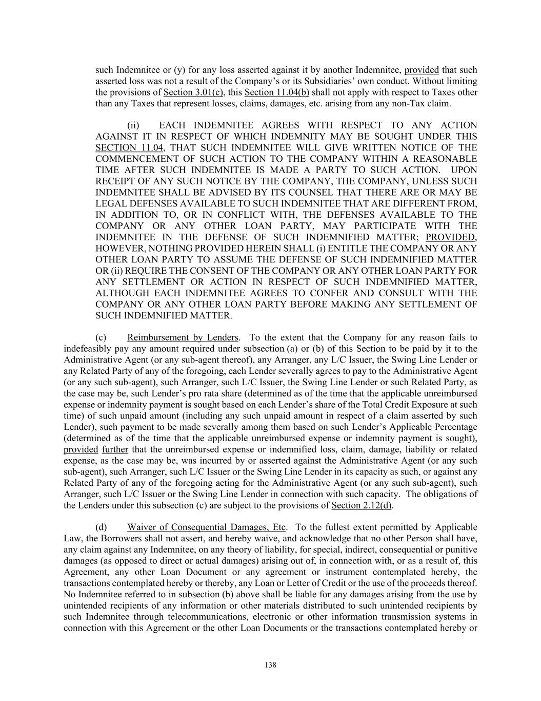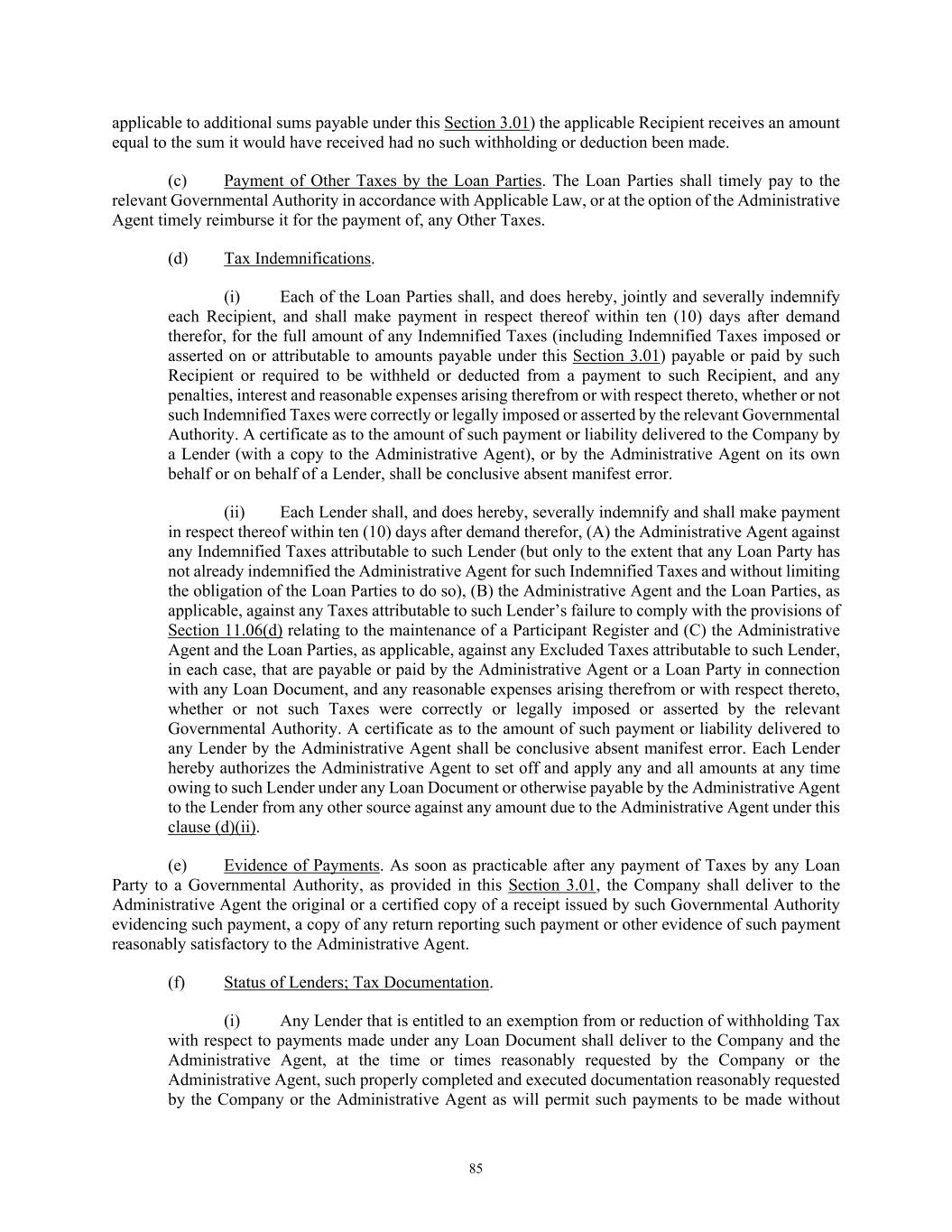 85 applicable to additional sums payable under this Section 3.01) the applicable Recipient receives an amount equal to the sum it would have received had no such withholding or deduction been made. (c) Payment of Other Taxes by the Loan Parties. The Loan Parties shall timely pay to the relevant Governmental Authority in accordance with Applicable Law, or at the option of the Administrative Agent timely reimburse it for the payment of, any Other Taxes. (d) Tax Indemnifications. (i) Each of the Loan Parties shall, and does hereby, jointly and severally indemnify each Recipient, and shall make payment in respect thereof within ten (10) days after demand therefor, for the full amount of any Indemnified Taxes (including Indemnified Taxes imposed or asserted on or attributable to amounts payable under this Section 3.01) payable or paid by such Recipient or required to be withheld or deducted from a payment to such Recipient, and any penalties, interest and reasonable expenses arising therefrom or with respect thereto, whether or not such Indemnified Taxes were correctly or legally imposed or asserted by the relevant Governmental Authority. A certificate as to the amount of such payment or liability delivered to the Company by a Lender (with a copy to the Administrative Agent), or by the Administrative Agent on its own behalf or on behalf of a Lender, shall be conclusive absent manifest error. (ii) Each Lender shall, and does hereby, severally indemnify and shall make payment in respect thereof within ten (10) days after demand therefor, (A) the Administrative Agent against any Indemnified Taxes attributable to such Lender (but only to the extent that any Loan Party has not already indemnified the Administrative Agent for such Indemnified Taxes and without limiting the obligation of the Loan Parties to do so), (B) the Administrative Agent and the Loan Parties, as applicable, against any Taxes attributable to such Lender’s failure to comply with the provisions of Section 11.06(d) relating to the maintenance of a Participant Register and (C) the Administrative Agent and the Loan Parties, as applicable, against any Excluded Taxes attributable to such Lender, in each case, that are payable or paid by the Administrative Agent or a Loan Party in connection with any Loan Document, and any reasonable expenses arising therefrom or with respect thereto, whether or not such Taxes were correctly or legally imposed or asserted by the relevant Governmental Authority. A certificate as to the amount of such payment or liability delivered to any Lender by the Administrative Agent shall be conclusive absent manifest error. Each Lender hereby authorizes the Administrative Agent to set off and apply any and all amounts at any time owing to such Lender under any Loan Document or otherwise payable by the Administrative Agent to the Lender from any other source against any amount due to the Administrative Agent under this clause (d)(ii). (e) Evidence of Payments. As soon as practicable after any payment of Taxes by any Loan Party to a Governmental Authority, as provided in this Section 3.01, the Company shall deliver to the Administrative Agent the original or a certified copy of a receipt issued by such Governmental Authority evidencing such payment, a copy of any return reporting such payment or other evidence of such payment reasonably satisfactory to the Administrative Agent. (f) Status of Lenders; Tax Documentation. (i) Any Lender that is entitled to an exemption from or reduction of withholding Tax with respect to payments made under any Loan Document shall deliver to the Company and the Administrative Agent, at the time or times reasonably requested by the Company or the Administrative Agent, such properly completed and executed documentation reasonably requested by the Company or the Administrative Agent as will permit such payments to be made without