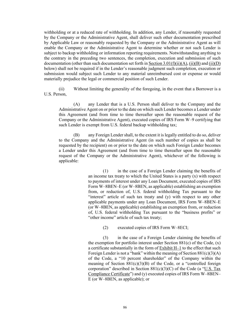 86 withholding or at a reduced rate of withholding. In addition, any Lender, if reasonably requested by the Company or the Administrative Agent, shall deliver such other documentation prescribed by Applicable Law or reasonably requested by the Company or the Administrative Agent as will enable the Company or the Administrative Agent to determine whether or not such Lender is subject to backup withholding or information reporting requirements. Notwithstanding anything to the contrary in the preceding two sentences, the completion, execution and submission of such documentation (other than such documentation set forth in Section 3.01(f)(ii)(A), (ii)(B) and (ii)(D) below) shall not be required if in the Lender’s reasonable judgment such completion, execution or submission would subject such Lender to any material unreimbursed cost or expense or would materially prejudice the legal or commercial position of such Lender. (ii) Without limiting the generality of the foregoing, in the event that a Borrower is a U.S. Person, (A) any Lender that is a U.S. Person shall deliver to the Company and the Administrative Agent on or prior to the date on which such Lender becomes a Lender under this Agreement (and from time to time thereafter upon the reasonable request of the Company or the Administrative Agent), executed copies of IRS Form W–9 certifying that such Lender is exempt from U.S. federal backup withholding tax; (B) any Foreign Lender shall, to the extent it is legally entitled to do so, deliver to the Company and the Administrative Agent (in such number of copies as shall be requested by the recipient) on or prior to the date on which such Foreign Lender becomes a Lender under this Agreement (and from time to time thereafter upon the reasonable request of the Company or the Administrative Agent), whichever of the following is applicable: (1) in the case of a Foreign Lender claiming the benefits of an income tax treaty to which the United States is a party (x) with respect to payments of interest under any Loan Document, executed copies of IRS Form W–8BEN–E (or W–8BEN, as applicable) establishing an exemption from, or reduction of, U.S. federal withholding Tax pursuant to the “interest” article of such tax treaty and (y) with respect to any other applicable payments under any Loan Document, IRS Form W–8BEN–E (or W–8BEN, as applicable) establishing an exemption from, or reduction of, U.S. federal withholding Tax pursuant to the “business profits” or “other income” article of such tax treaty; (2) executed copies of IRS Form W–8ECI; (3) in the case of a Foreign Lender claiming the benefits of the exemption for portfolio interest under Section 881(c) of the Code, (x) a certificate substantially in the form of Exhibit H–1 to the effect that such Foreign Lender is not a “bank” within the meaning of Section 881(c)(3)(A) of the Code, a “10 percent shareholder” of the Company within the meaning of Section 881(c)(3)(B) of the Code, or a “controlled foreign corporation” described in Section 881(c)(3)(C) of the Code (a “U.S. Tax Compliance Certificate”) and (y) executed copies of IRS Form W–8BEN– E (or W–8BEN, as applicable); or