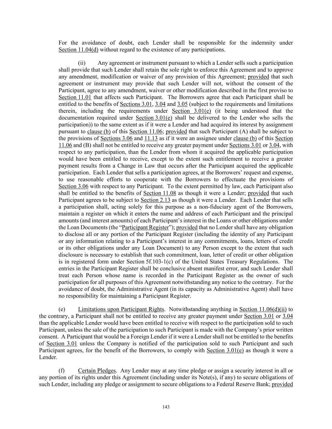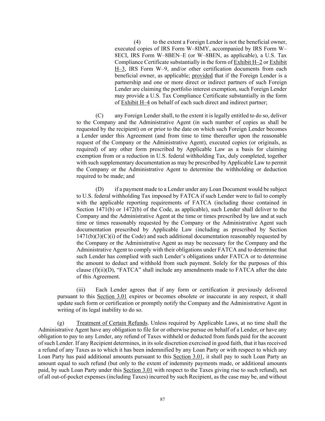 87 (4) to the extent a Foreign Lender is not the beneficial owner, executed copies of IRS Form W–8IMY, accompanied by IRS Form W– 8ECI, IRS Form W–8BEN–E (or W–8BEN, as applicable), a U.S. Tax Compliance Certificate substantially in the form of Exhibit H–2 or Exhibit H–3, IRS Form W–9, and/or other certification documents from each beneficial owner, as applicable; provided that if the Foreign Lender is a partnership and one or more direct or indirect partners of such Foreign Lender are claiming the portfolio interest exemption, such Foreign Lender may provide a U.S. Tax Compliance Certificate substantially in the form of Exhibit H–4 on behalf of each such direct and indirect partner; (C) any Foreign Lender shall, to the extent it is legally entitled to do so, deliver to the Company and the Administrative Agent (in such number of copies as shall be requested by the recipient) on or prior to the date on which such Foreign Lender becomes a Lender under this Agreement (and from time to time thereafter upon the reasonable request of the Company or the Administrative Agent), executed copies (or originals, as required) of any other form prescribed by Applicable Law as a basis for claiming exemption from or a reduction in U.S. federal withholding Tax, duly completed, together with such supplementary documentation as may be prescribed by Applicable Law to permit the Company or the Administrative Agent to determine the withholding or deduction required to be made; and (D) if a payment made to a Lender under any Loan Document would be subject to U.S. federal withholding Tax imposed by FATCA if such Lender were to fail to comply with the applicable reporting requirements of FATCA (including those contained in Section 1471(b) or 1472(b) of the Code, as applicable), such Lender shall deliver to the Company and the Administrative Agent at the time or times prescribed by law and at such time or times reasonably requested by the Company or the Administrative Agent such documentation prescribed by Applicable Law (including as prescribed by Section 1471(b)(3)(C)(i) of the Code) and such additional documentation reasonably requested by the Company or the Administrative Agent as may be necessary for the Company and the Administrative Agent to comply with their obligations under FATCA and to determine that such Lender has complied with such Lender’s obligations under FATCA or to determine the amount to deduct and withhold from such payment. Solely for the purposes of this clause (f)(ii)(D), “FATCA” shall include any amendments made to FATCA after the date of this Agreement. (iii) Each Lender agrees that if any form or certification it previously delivered pursuant to this Section 3.01 expires or becomes obsolete or inaccurate in any respect, it shall update such form or certification or promptly notify the Company and the Administrative Agent in writing of its legal inability to do so. (g) Treatment of Certain Refunds. Unless required by Applicable Laws, at no time shall the Administrative Agent have any obligation to file for or otherwise pursue on behalf of a Lender, or have any obligation to pay to any Lender, any refund of Taxes withheld or deducted from funds paid for the account of such Lender. If any Recipient determines, in its sole discretion exercised in good faith, that it has received a refund of any Taxes as to which it has been indemnified by any Loan Party or with respect to which any Loan Party has paid additional amounts pursuant to this Section 3.01, it shall pay to such Loan Party an amount equal to such refund (but only to the extent of indemnity payments made, or additional amounts paid, by such Loan Party under this Section 3.01 with respect to the Taxes giving rise to such refund), net of all out-of-pocket expenses (including Taxes) incurred by such Recipient, as the case may be, and without