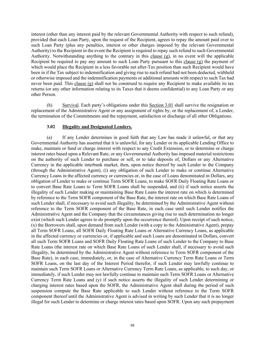88 interest (other than any interest paid by the relevant Governmental Authority with respect to such refund), provided that each Loan Party, upon the request of the Recipient, agrees to repay the amount paid over to such Loan Party (plus any penalties, interest or other charges imposed by the relevant Governmental Authority) to the Recipient in the event the Recipient is required to repay such refund to such Governmental Authority. Notwithstanding anything to the contrary in this clause (g), in no event will the applicable Recipient be required to pay any amount to such Loan Party pursuant to this clause (g) the payment of which would place the Recipient in a less favorable net after-Tax position than such Recipient would have been in if the Tax subject to indemnification and giving rise to such refund had not been deducted, withheld or otherwise imposed and the indemnification payments or additional amounts with respect to such Tax had never been paid. This clause (g) shall not be construed to require any Recipient to make available its tax returns (or any other information relating to its Taxes that it deems confidential) to any Loan Party or any other Person. (h) Survival. Each party’s obligations under this Section 3.01 shall survive the resignation or replacement of the Administrative Agent or any assignment of rights by, or the replacement of, a Lender, the termination of the Commitments and the repayment, satisfaction or discharge of all other Obligations. 3.02 Illegality and Designated Lenders. (a) If any Lender determines in good faith that any Law has made it unlawful, or that any Governmental Authority has asserted that it is unlawful, for any Lender or its applicable Lending Office to make, maintain or fund or charge interest with respect to any Credit Extension, or to determine or charge interest rates based upon a Relevant Rate, or any Governmental Authority has imposed material restrictions on the authority of such Lender to purchase or sell, or to take deposits of, Dollars or any Alternative Currency in the applicable interbank market, then, upon notice thereof by such Lender to the Company (through the Administrative Agent), (i) any obligation of such Lender to make or continue Alternative Currency Loans in the affected currency or currencies or, in the case of Loans denominated in Dollars, any obligation of Lender to make or continue Term SOFR Loans, to make SOFR Daily Floating Rate Loans or to convert Base Rate Loans to Term SOFR Loans shall be suspended, and (ii) if such notice asserts the illegality of such Lender making or maintaining Base Rate Loans the interest rate on which is determined by reference to the Term SOFR component of the Base Rate, the interest rate on which Base Rate Loans of such Lender shall, if necessary to avoid such illegality, be determined by the Administrative Agent without reference to the Term SOFR component of the Base Rate, in each case until such Lender notifies the Administrative Agent and the Company that the circumstances giving rise to such determination no longer exist (which such Lender agrees to do promptly upon the occurrence thereof). Upon receipt of such notice, (x) the Borrowers shall, upon demand from such Lender (with a copy to the Administrative Agent), prepay all Term SOFR Loans, all SOFR Daily Floating Rate Loans or Alternative Currency Loans, as applicable in the affected currency or currencies or, if applicable and such Loans are denominated in Dollars, convert all such Term SOFR Loans and SOFR Daily Floating Rate Loans of such Lender to the Company to Base Rate Loans (the interest rate on which Base Rate Loans of such Lender shall, if necessary to avoid such illegality, be determined by the Administrative Agent without reference to Term SOFR component of the Base Rate), in each case, immediately, or, in the case of Alternative Currency Term Rate Loans or Term SOFR Loans, on the last day of the Interest Period therefor, if such Lender may lawfully continue to maintain such Term SOFR Loans or Alternative Currency Term Rate Loans, as applicable, to such day, or immediately, if such Lender may not lawfully continue to maintain such Term SOFR Loans or Alternative Currency Term Rate Loans and (y) if such notice asserts the illegality of such Lender determining or charging interest rates based upon the SOFR, the Administrative Agent shall during the period of such suspension compute the Base Rate applicable to such Lender without reference to the Term SOFR component thereof until the Administrative Agent is advised in writing by such Lender that it is no longer illegal for such Lender to determine or charge interest rates based upon SOFR. Upon any such prepayment